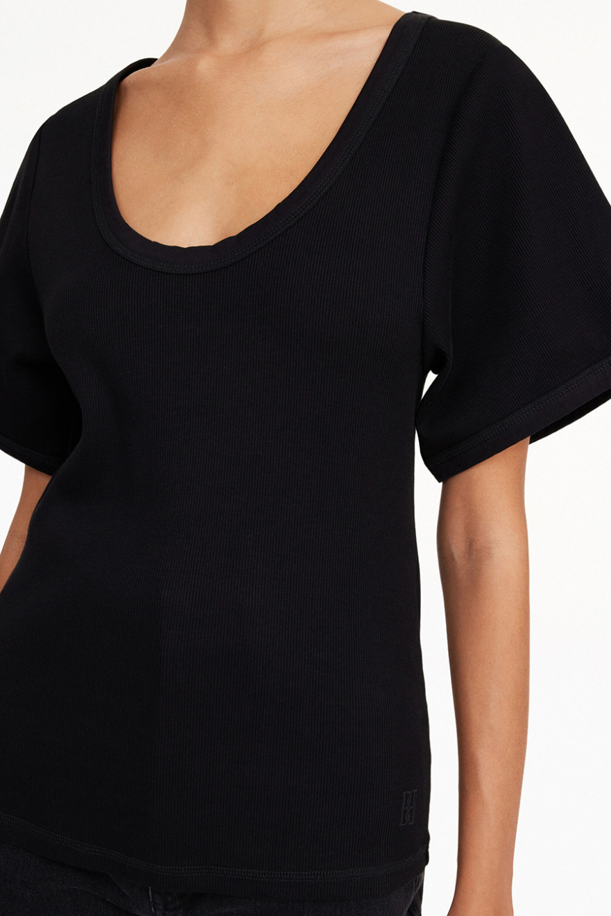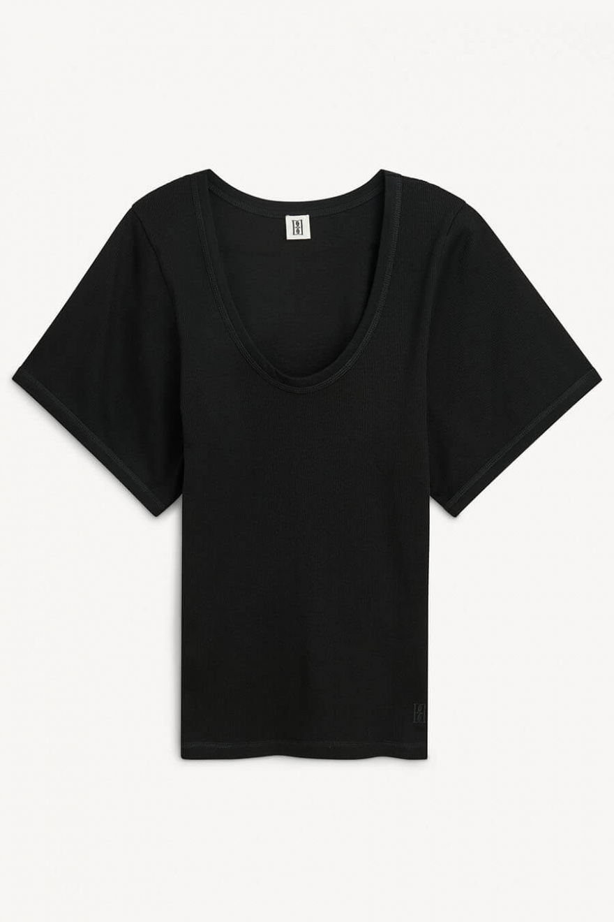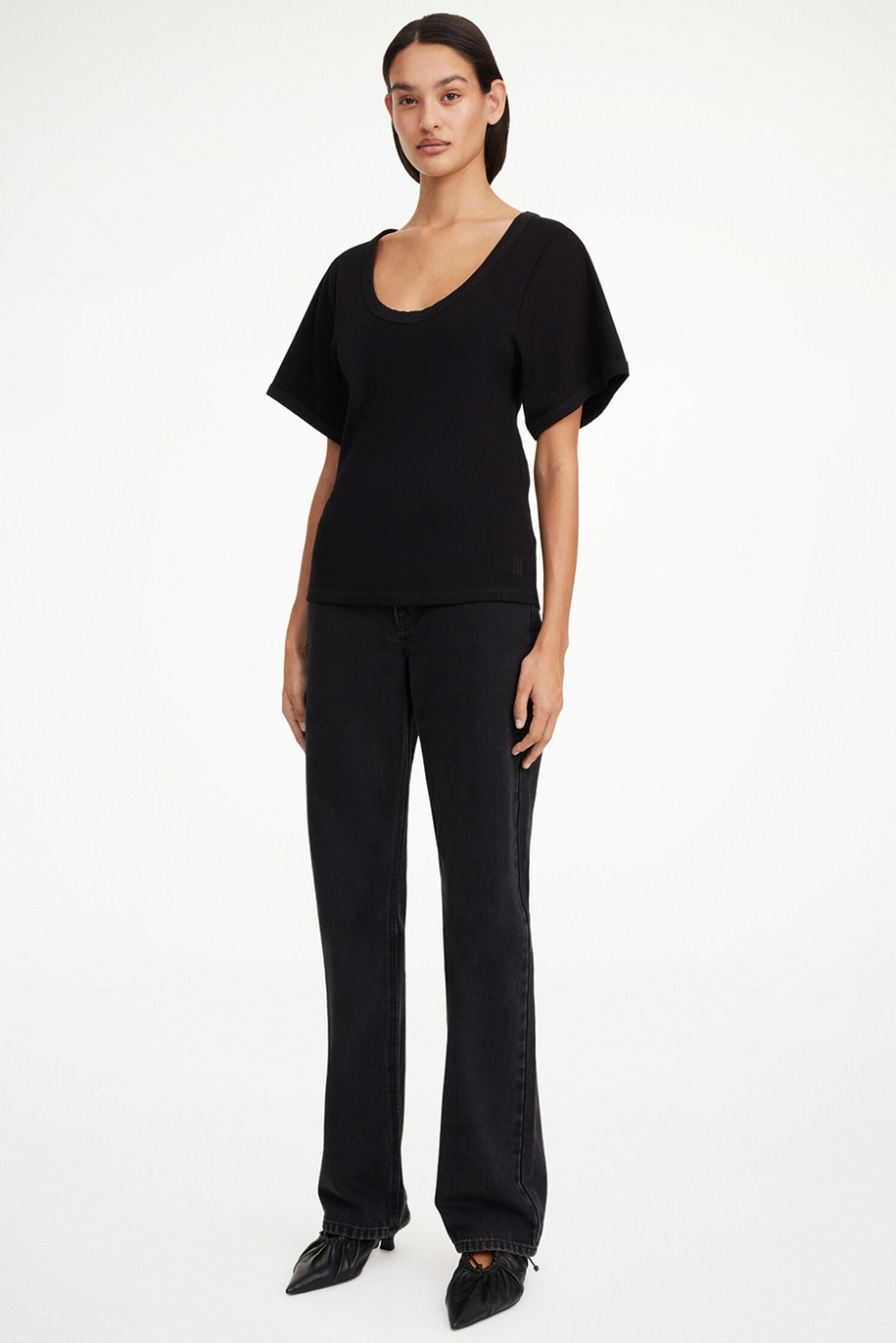 Kortärmad topp i ekologisk bomull med U-ringning, vida ärmar och tajt passform från By Malene Birger.- 98% Ekologisk Bomull 2% Elastan