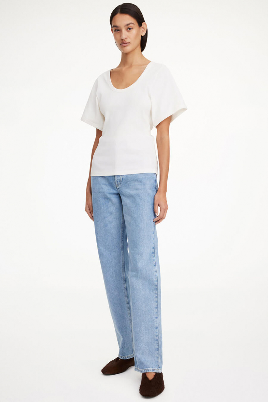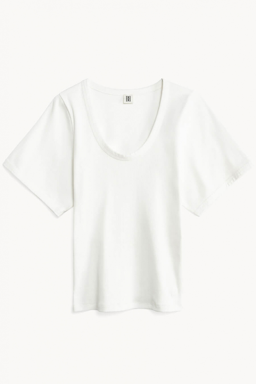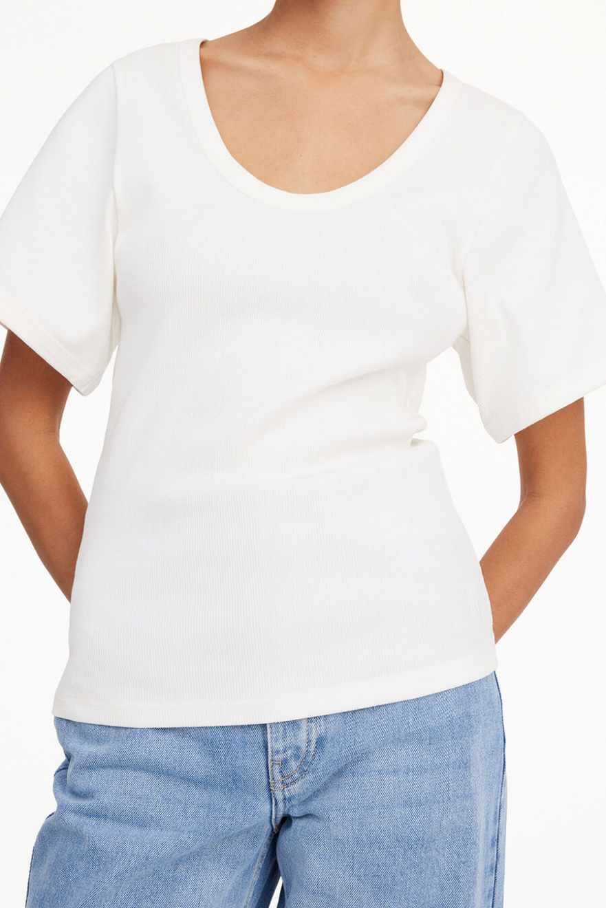 En vit ribbad t-shirt med U-ringning och tajt passform – lika tidlös som en solig morgon. Perfekt att styla med allt från avslappnade jeans till skräddade byxor för en look som alltid känns rätt.Kortärmad topp i ekologisk bomull med U-ringning, vida ärmar och tajt passform från By Malene Birger.