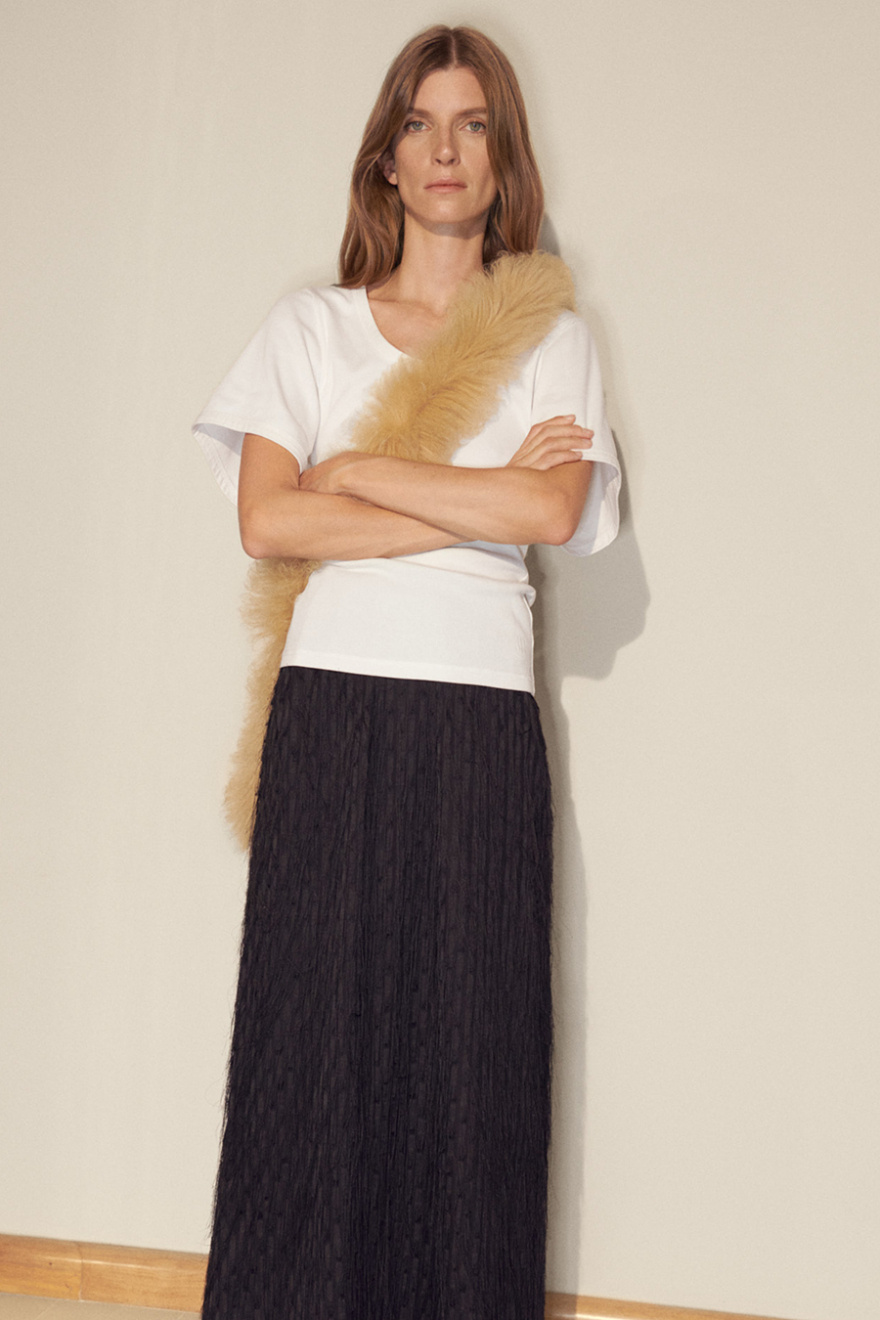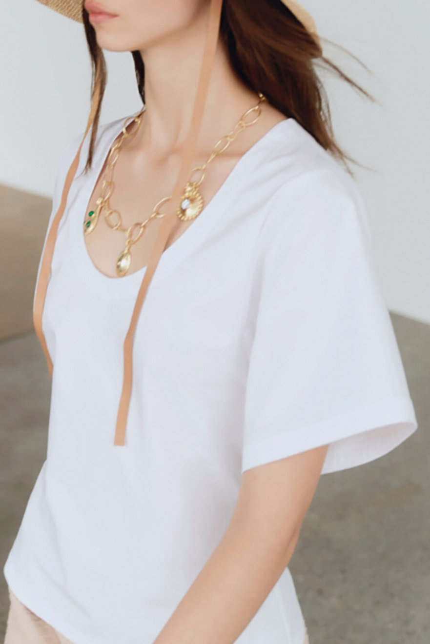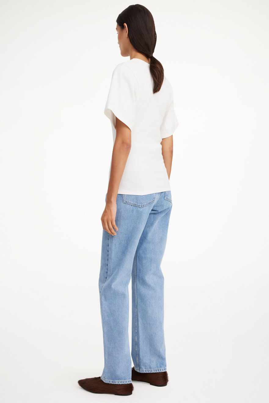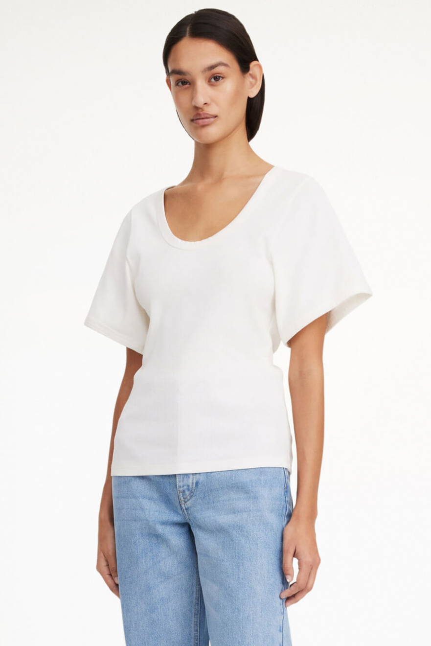 En vit ribbad t-shirt med U-ringning och tajt passform – lika tidlös som en solig morgon. Perfekt att styla med allt från avslappnade jeans till skräddade byxor för en look som alltid känns rätt.Kortärmad topp i ekologisk bomull med U-ringning, vida ärmar och tajt passform från By Malene Birger.