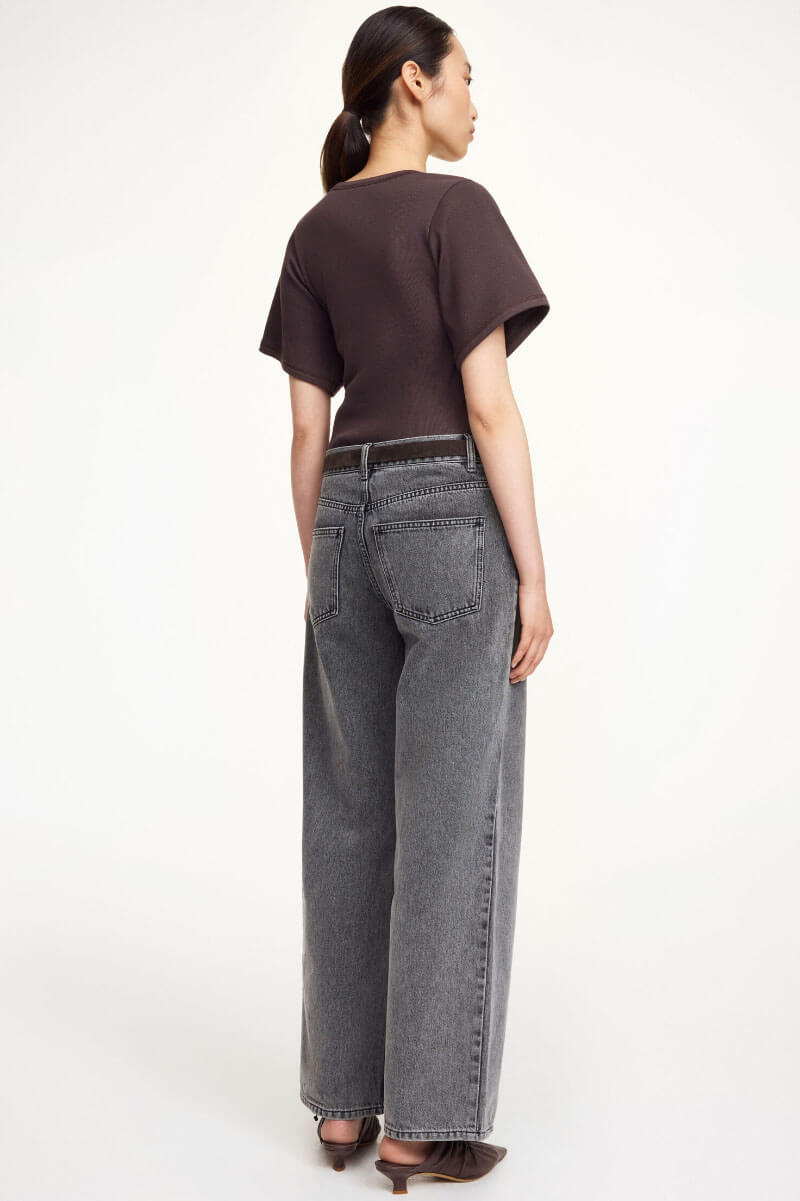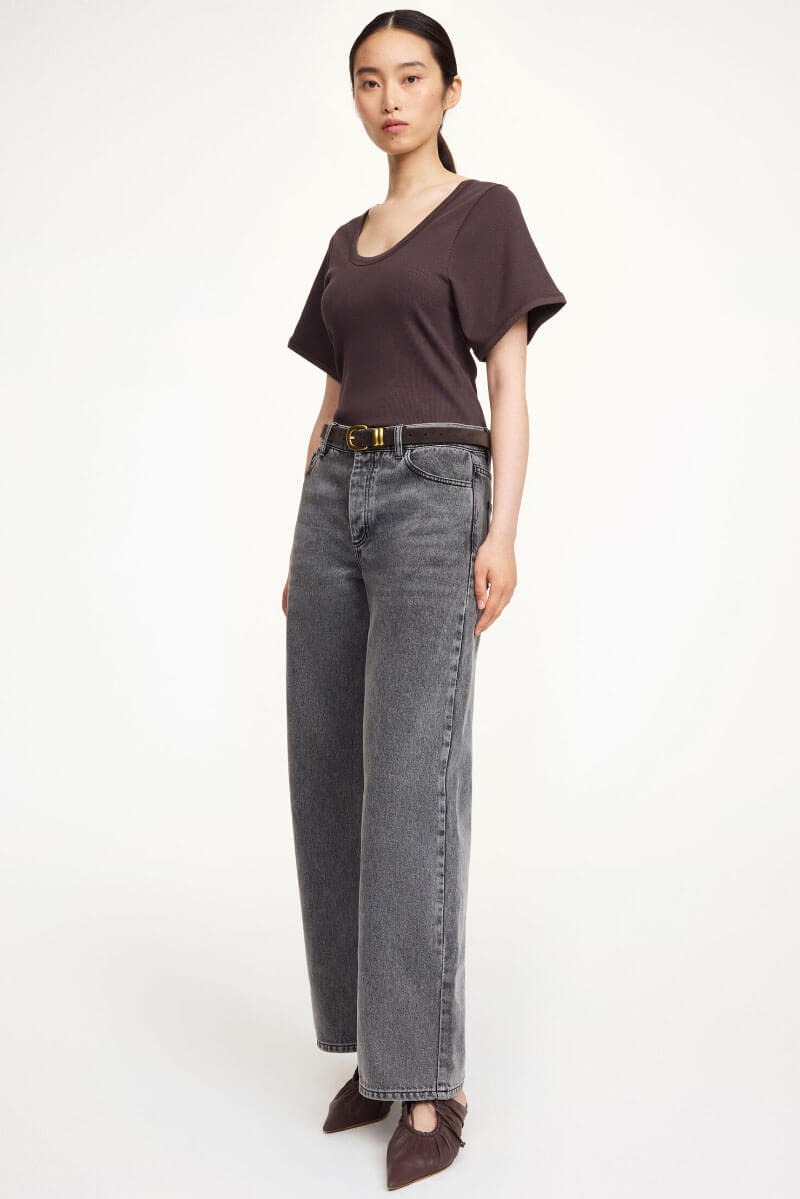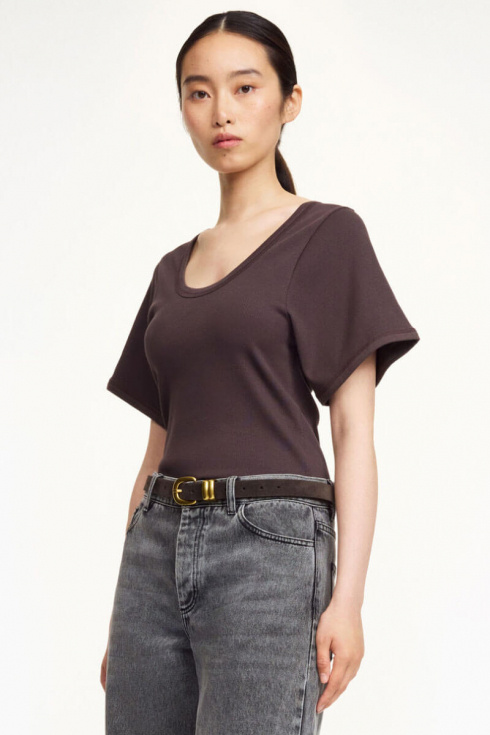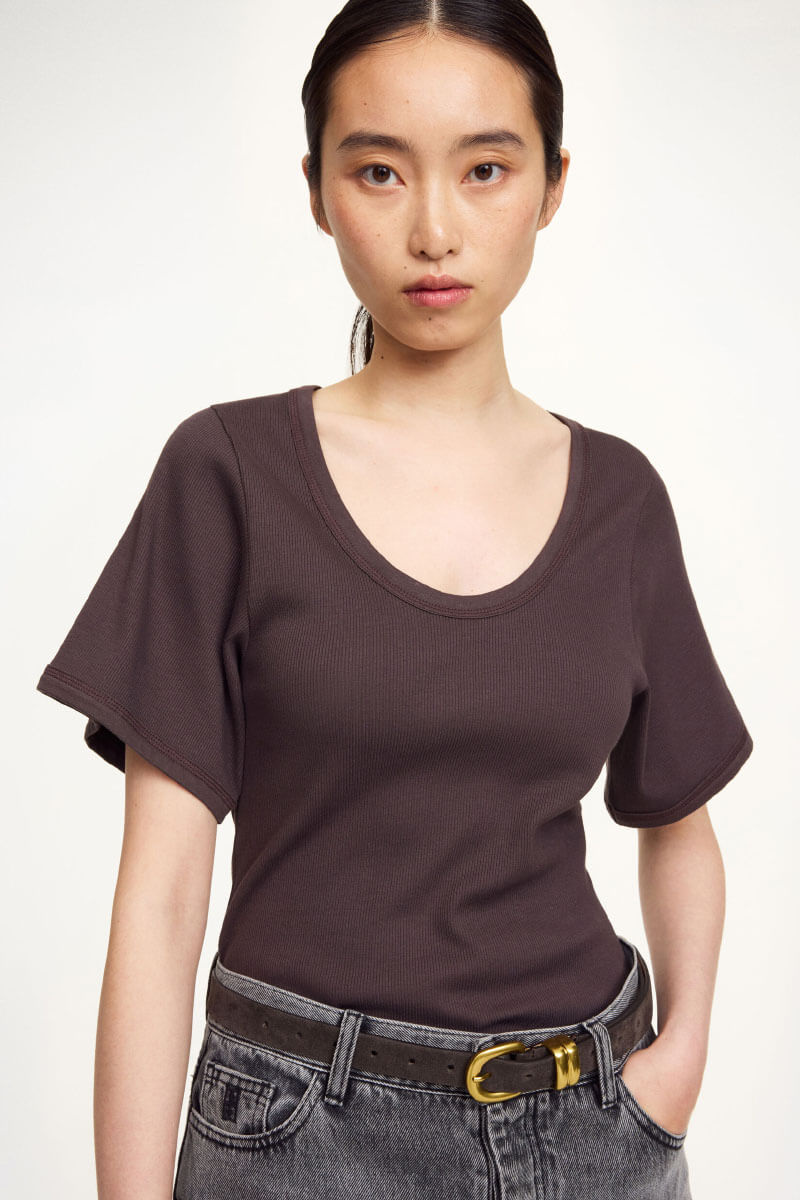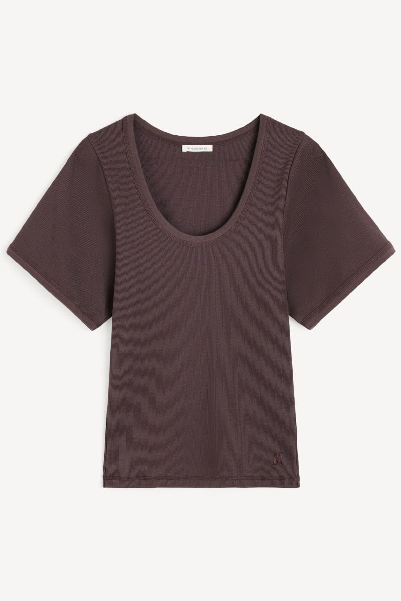 Brun ribbad topp med kroppsnära siluett och rundad halsringning – en diskret men distinkt bas som lyfter varje look. Bär till vida kostymbyxor eller under en stickad kofta för en varm, avskalad stil med lugn självsäkerhet.Kortärmad topp i ekologisk bomull med U-ringning, vida ärmar och tajt passform från By Malene Birger.