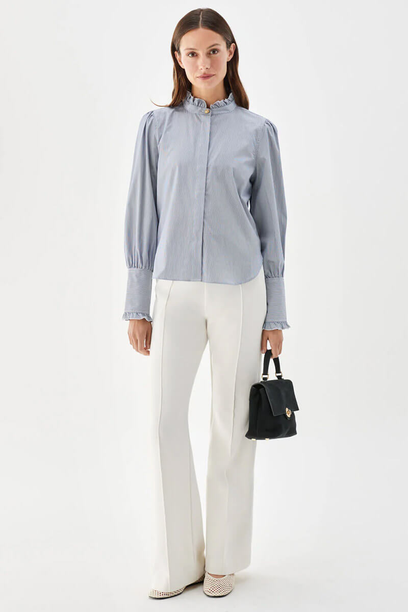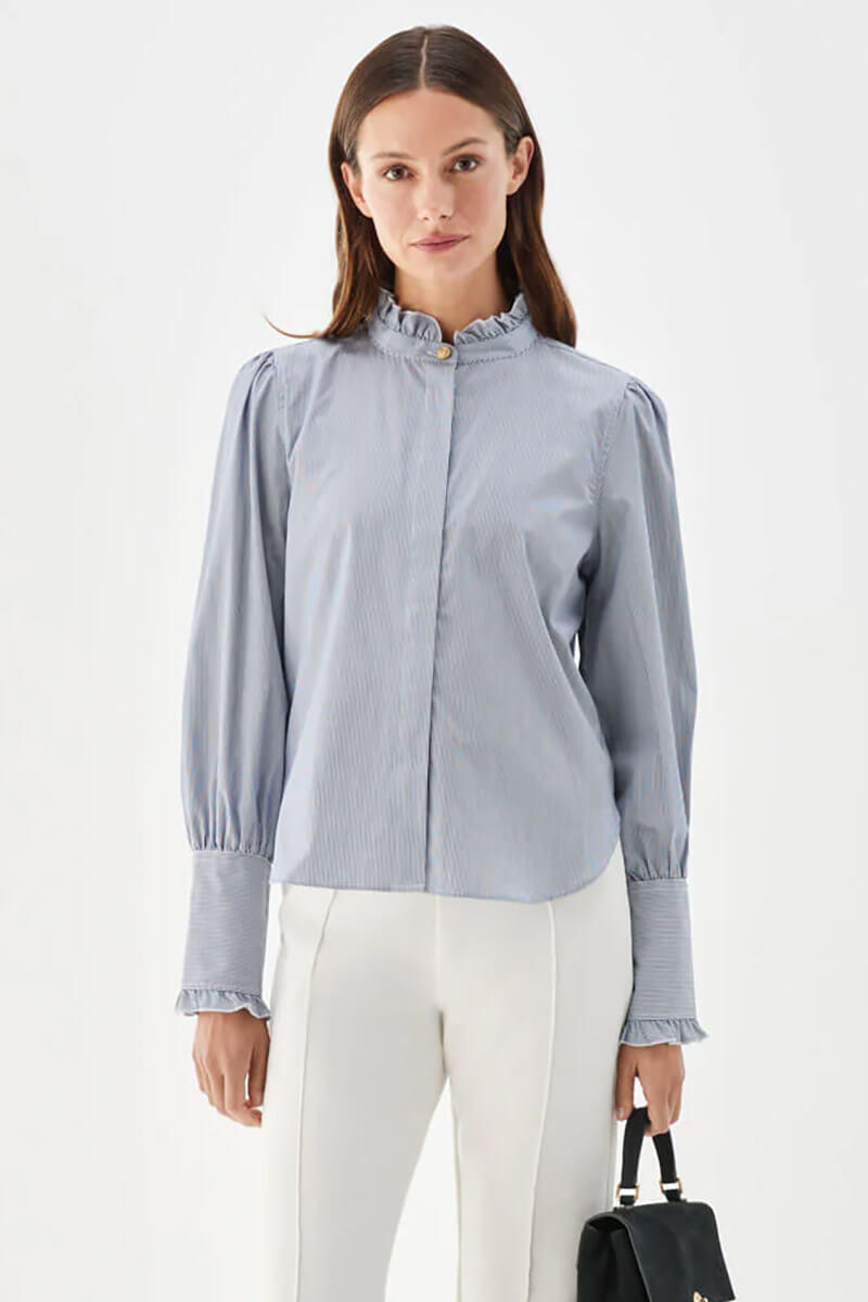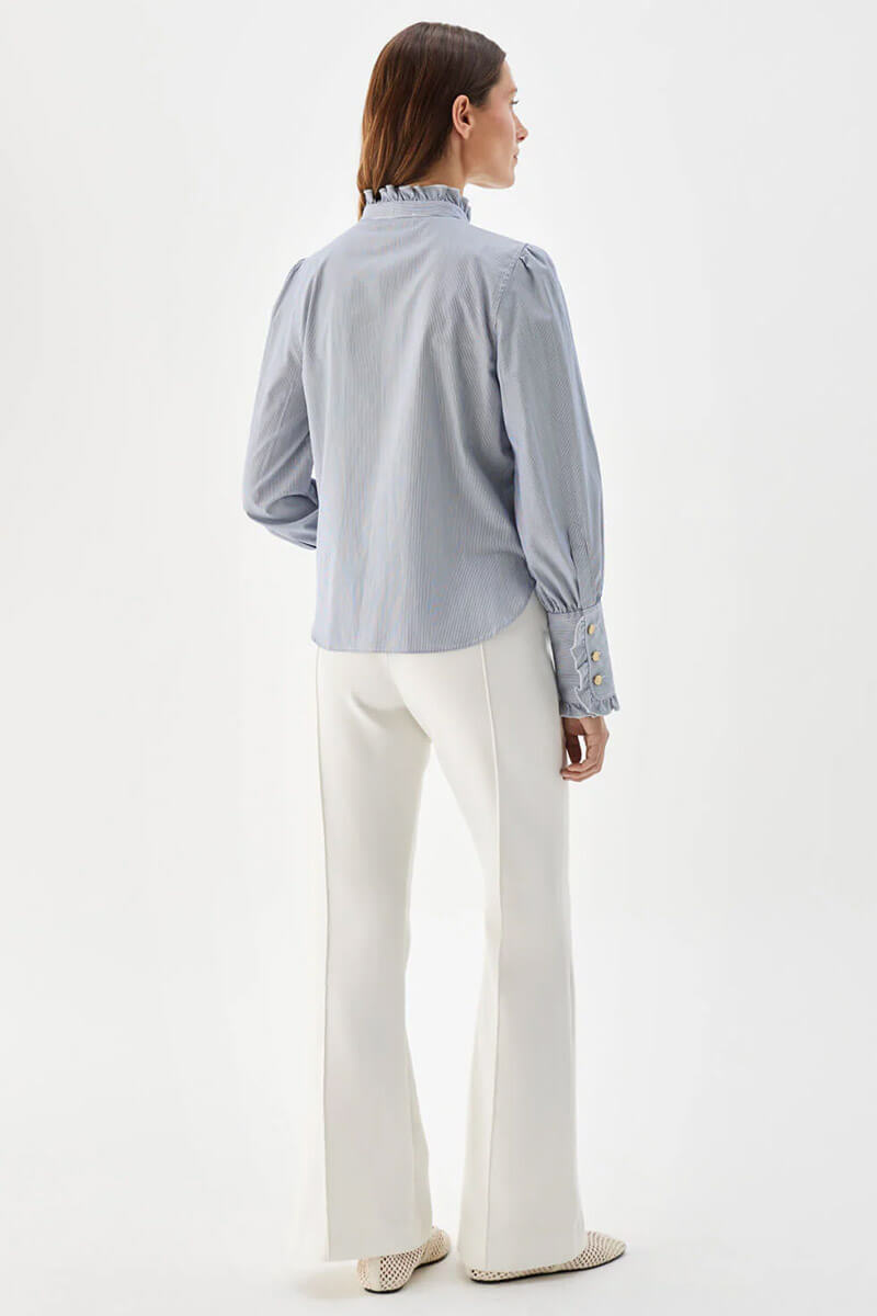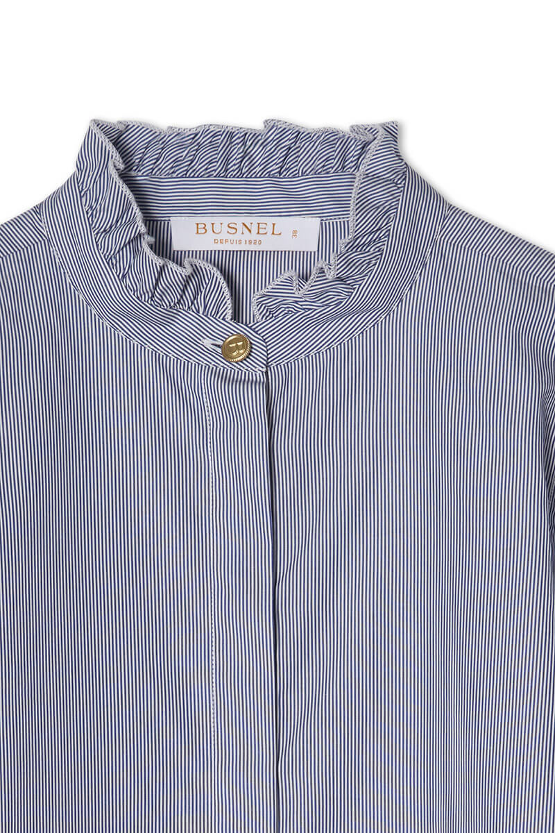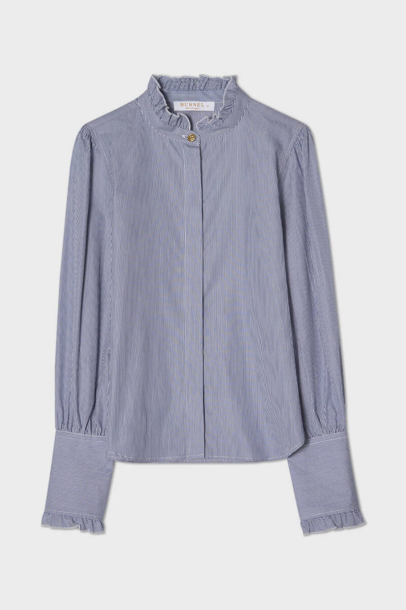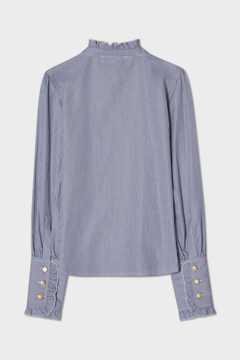 Den randiga Maira-blusen med volangkrage är tillverkad i blå- och vitrandig bomullspoplin.