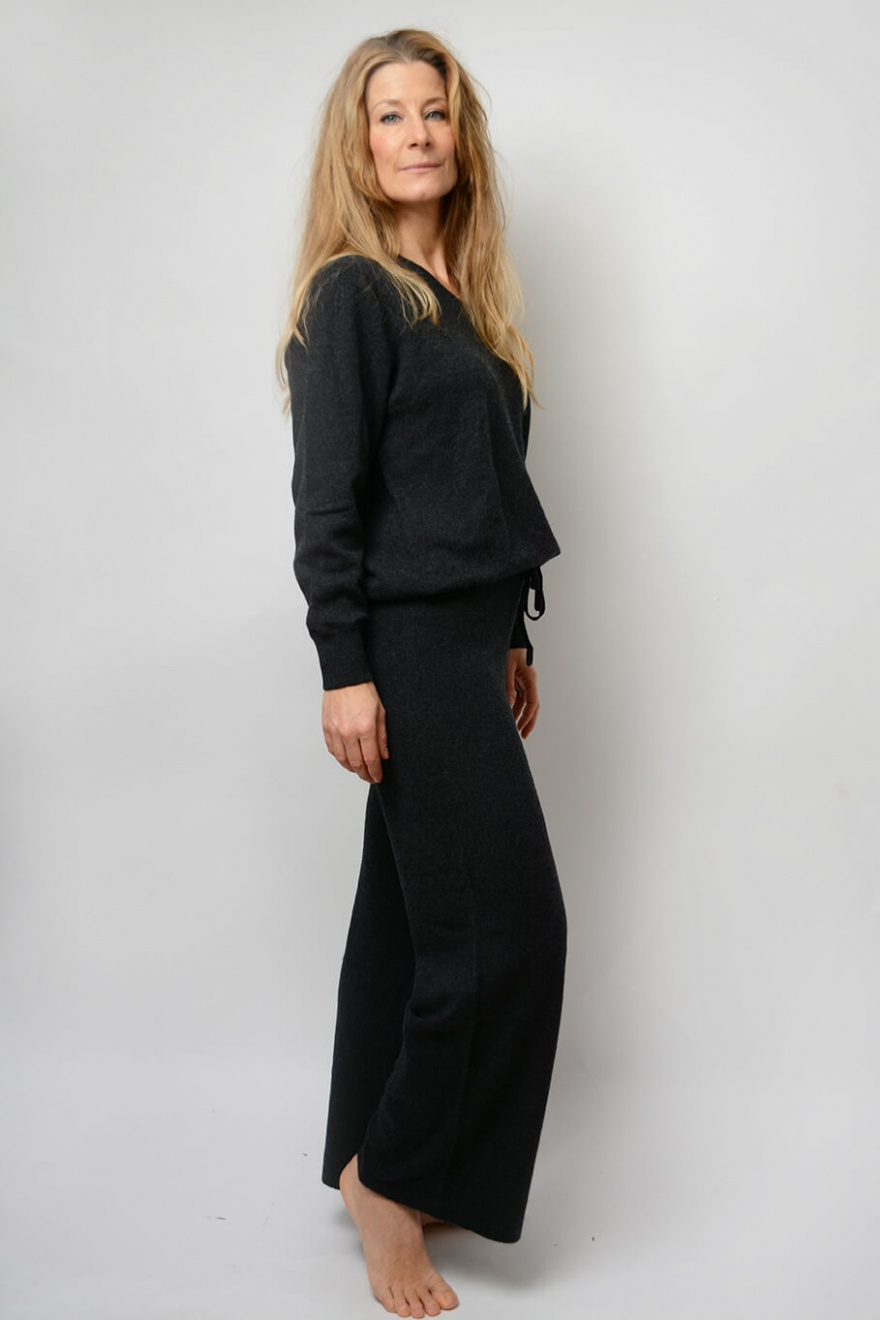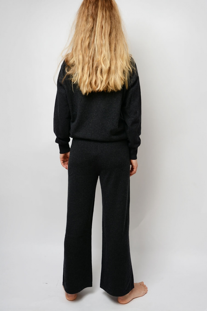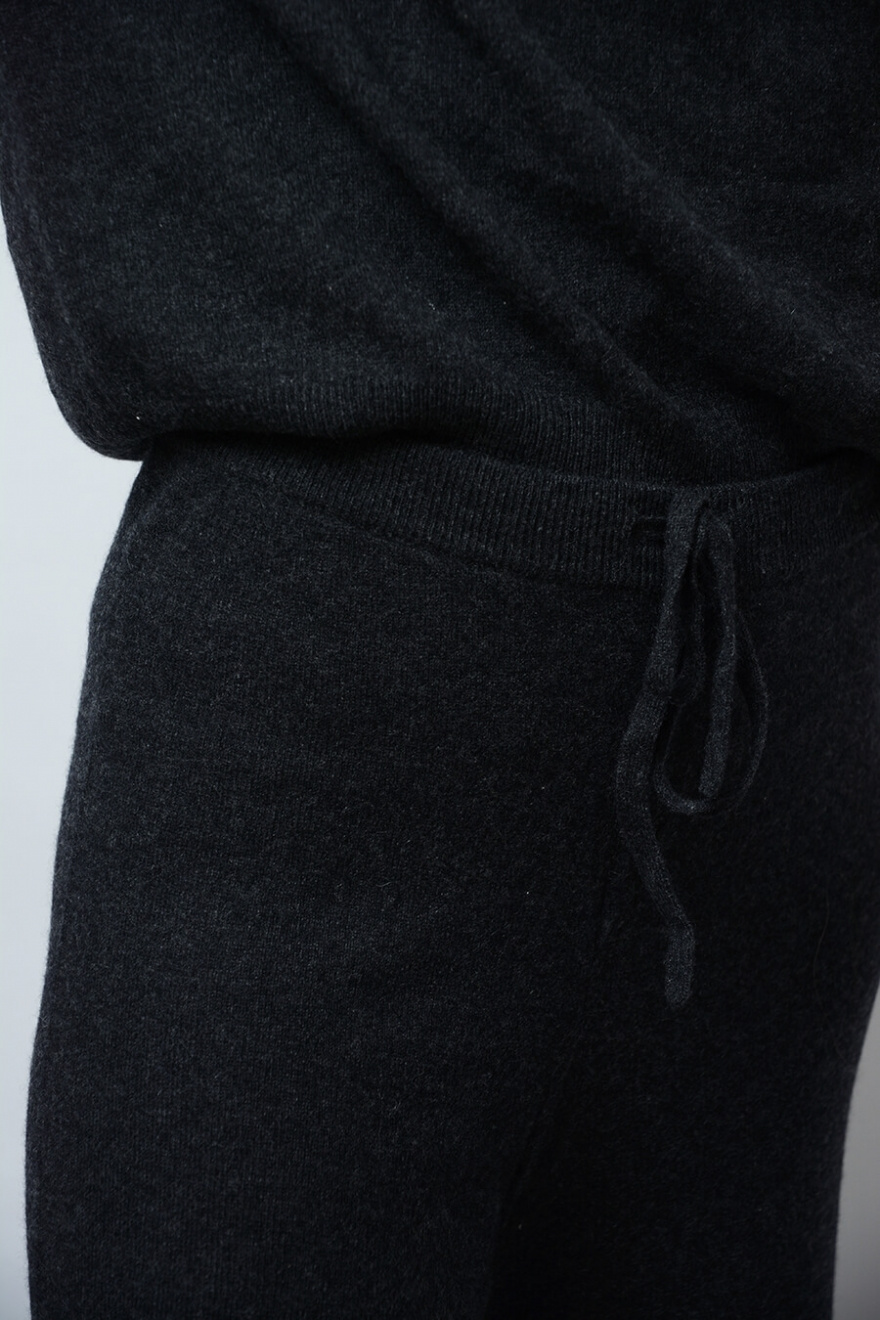 Stickad byxa i en lyxig kashmir med dragsko i midjan, ribbad kant och lös passform från Elin Maria Studio.100% Kashmir