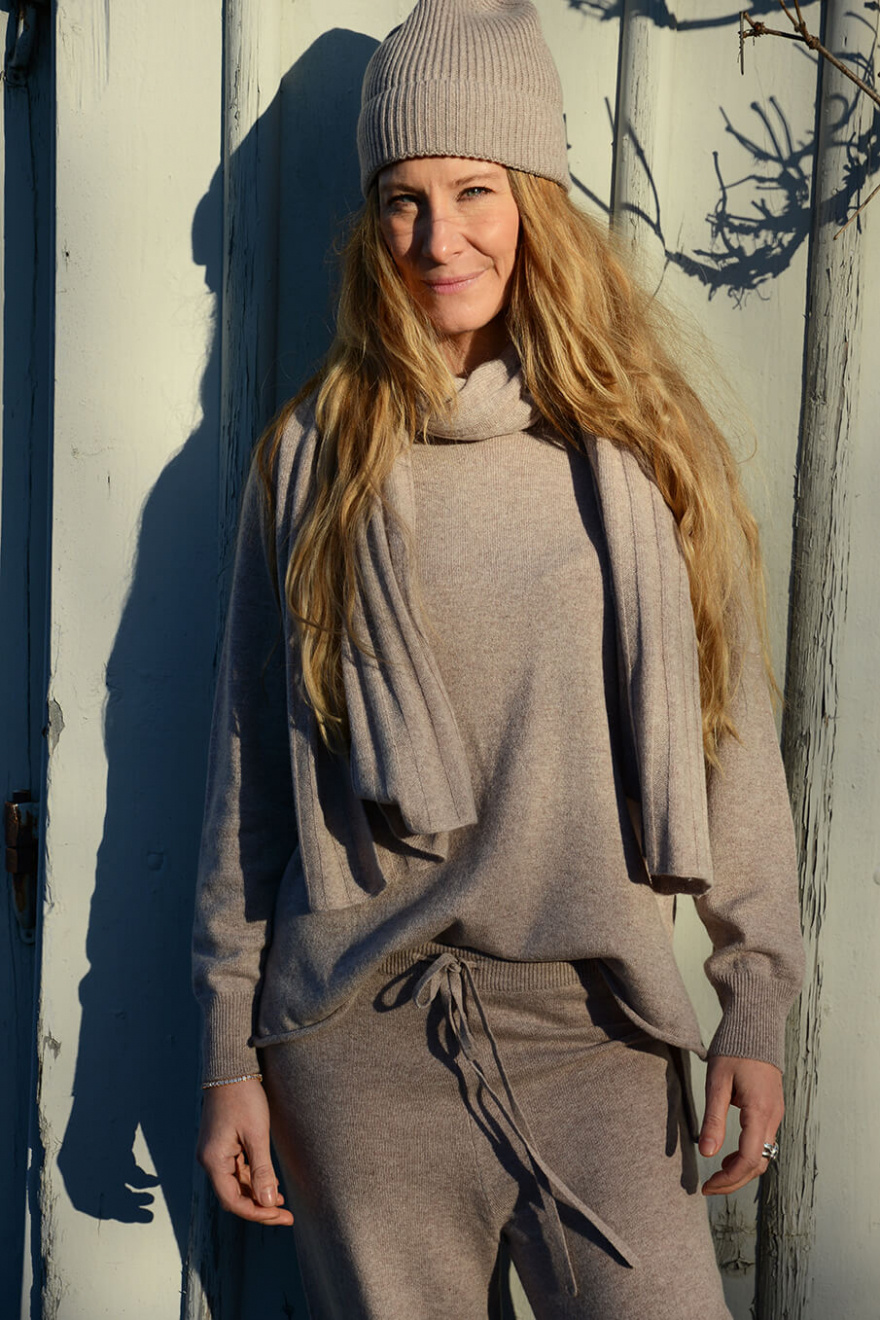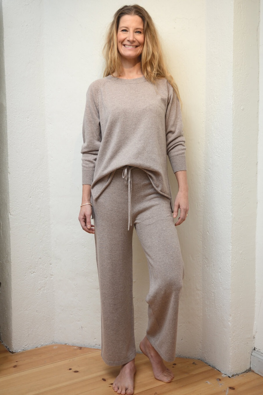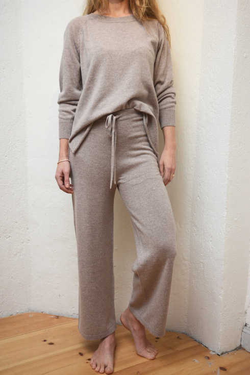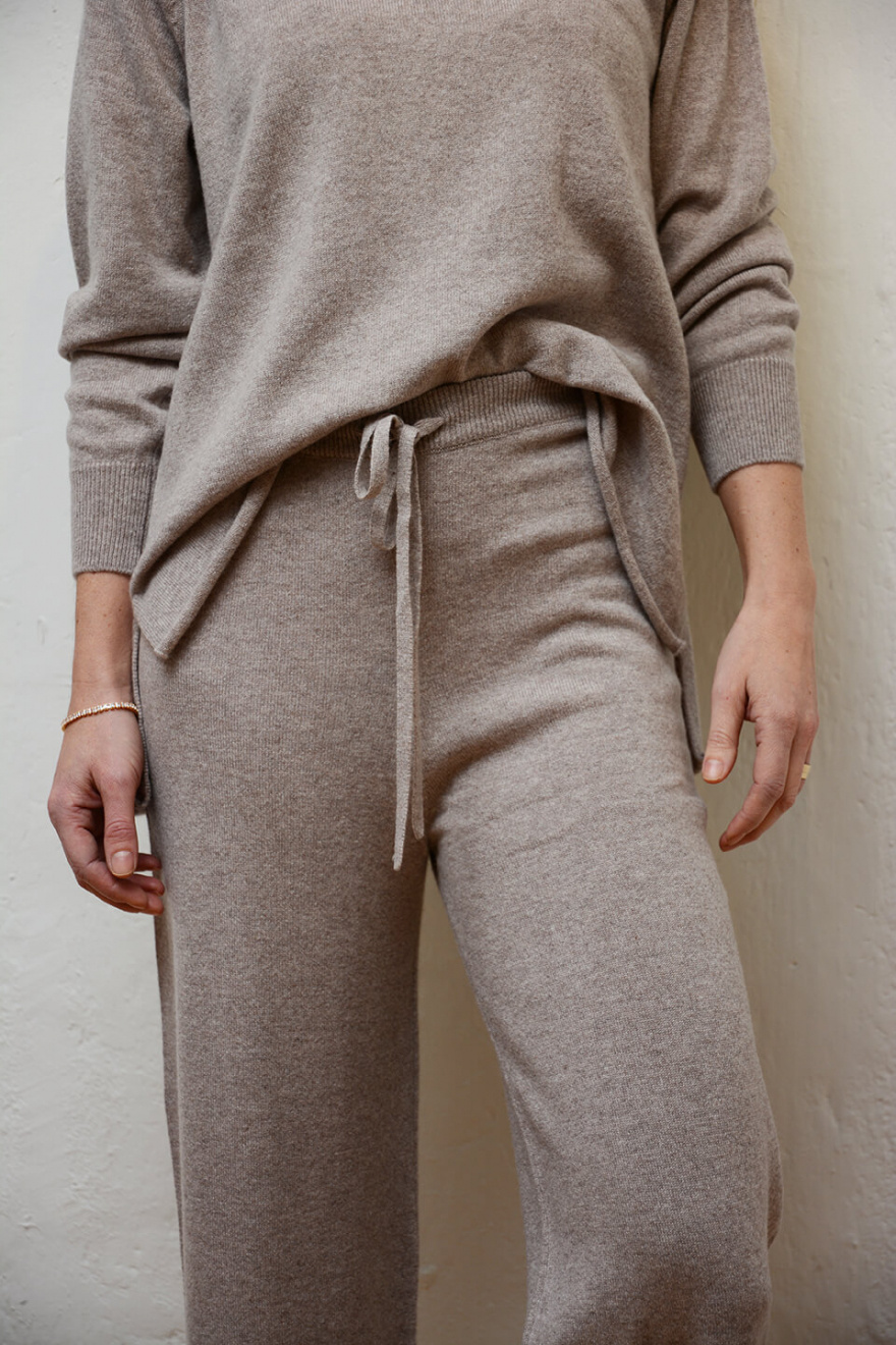 Stickad byxa i en lyxig kashmir med dragsko i midjan, vida ben, ribbad kant och ledig passform från Elin Maria Studio.100% Kashmir