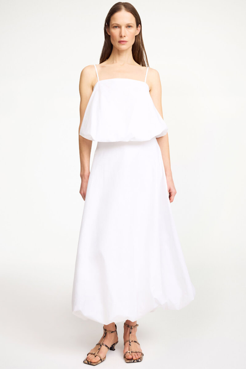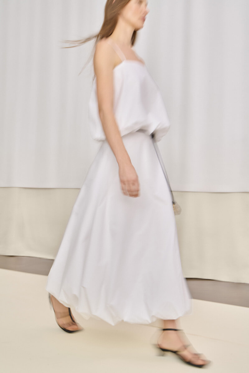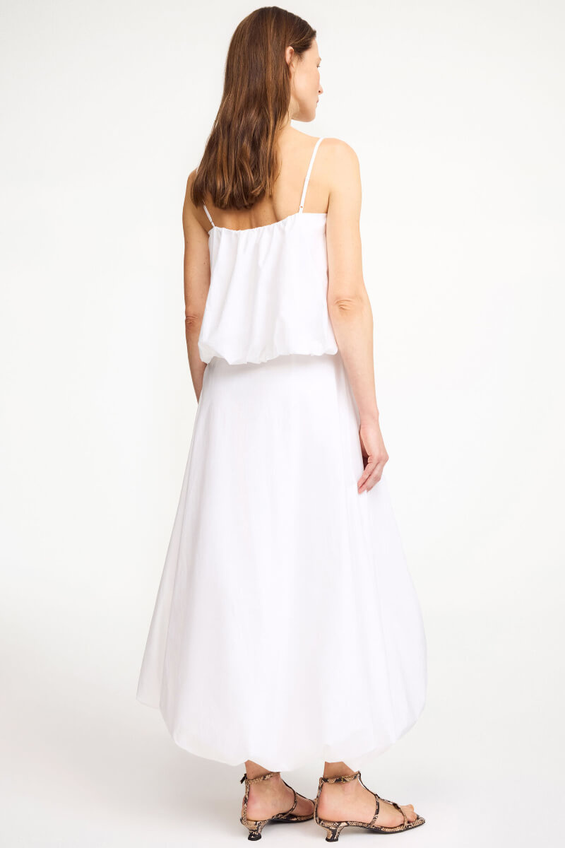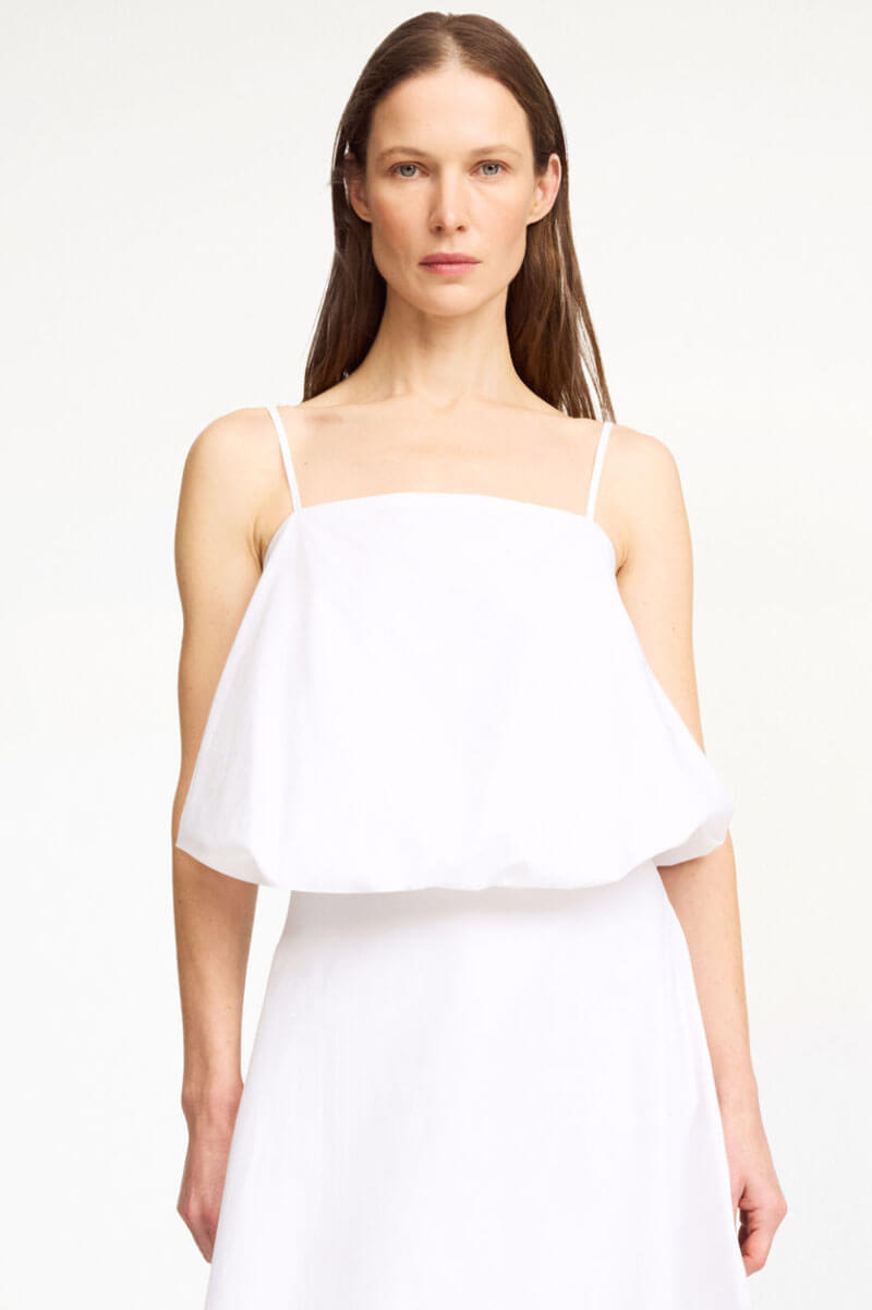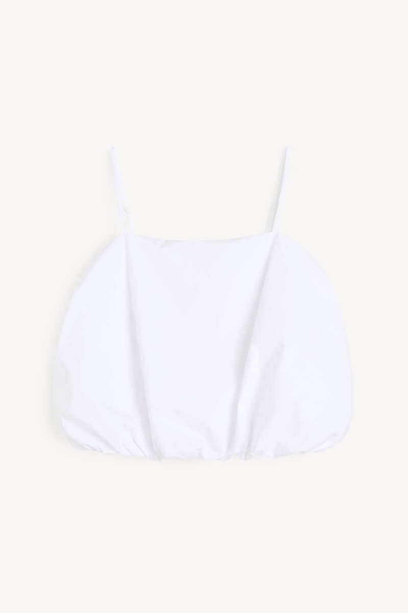 Det perfekta vita linnet i ekologisk bomull – med ballongform, smala axelband och en kort silhuett som gör jobbet. Styla med jeans, kjol eller linnebyxor. Ett sommarplagg du lever i.Topp i ekologisk bomull med spagettismala band, puffig silluett, något kort modell och rak halsringning från By Malene Birger.