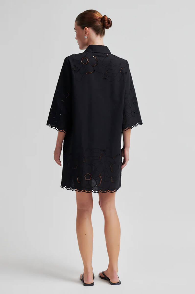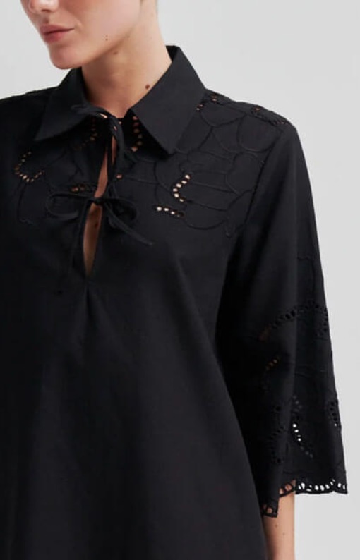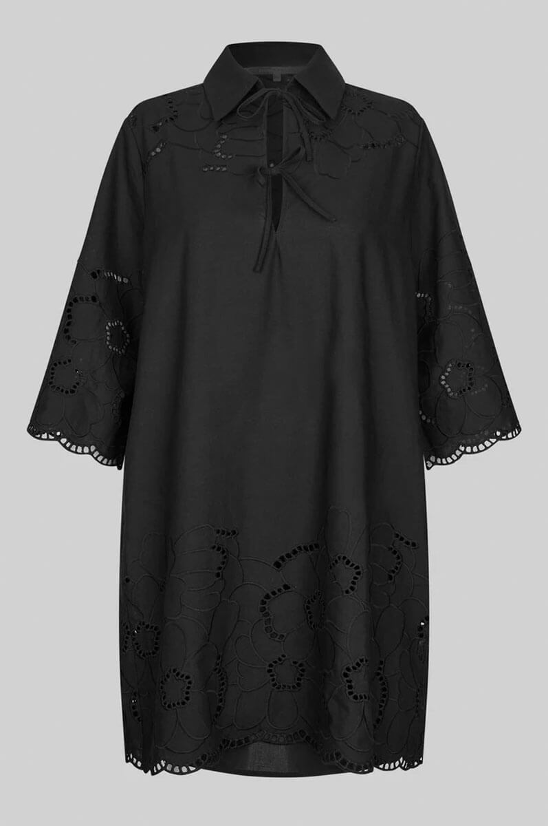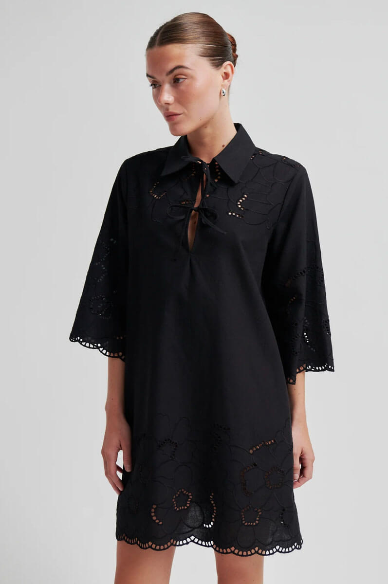 Second Female-klänning med spetsdetaljer och kortare ärmar.Klänningen i lyxigt utförande är tillverkad i en bomulls- och linneblandning med hålbroderi. Med knytning framtill vid bysten, trekvartsärmar och sidofickor. Vågig kant.