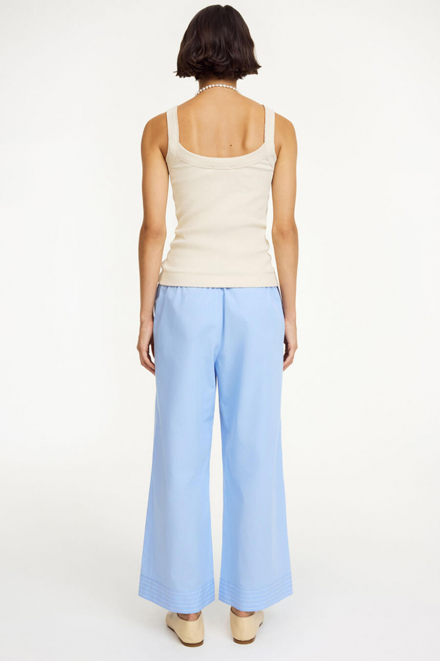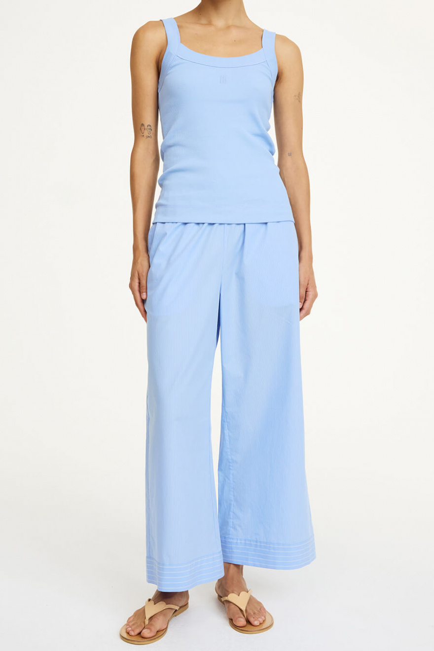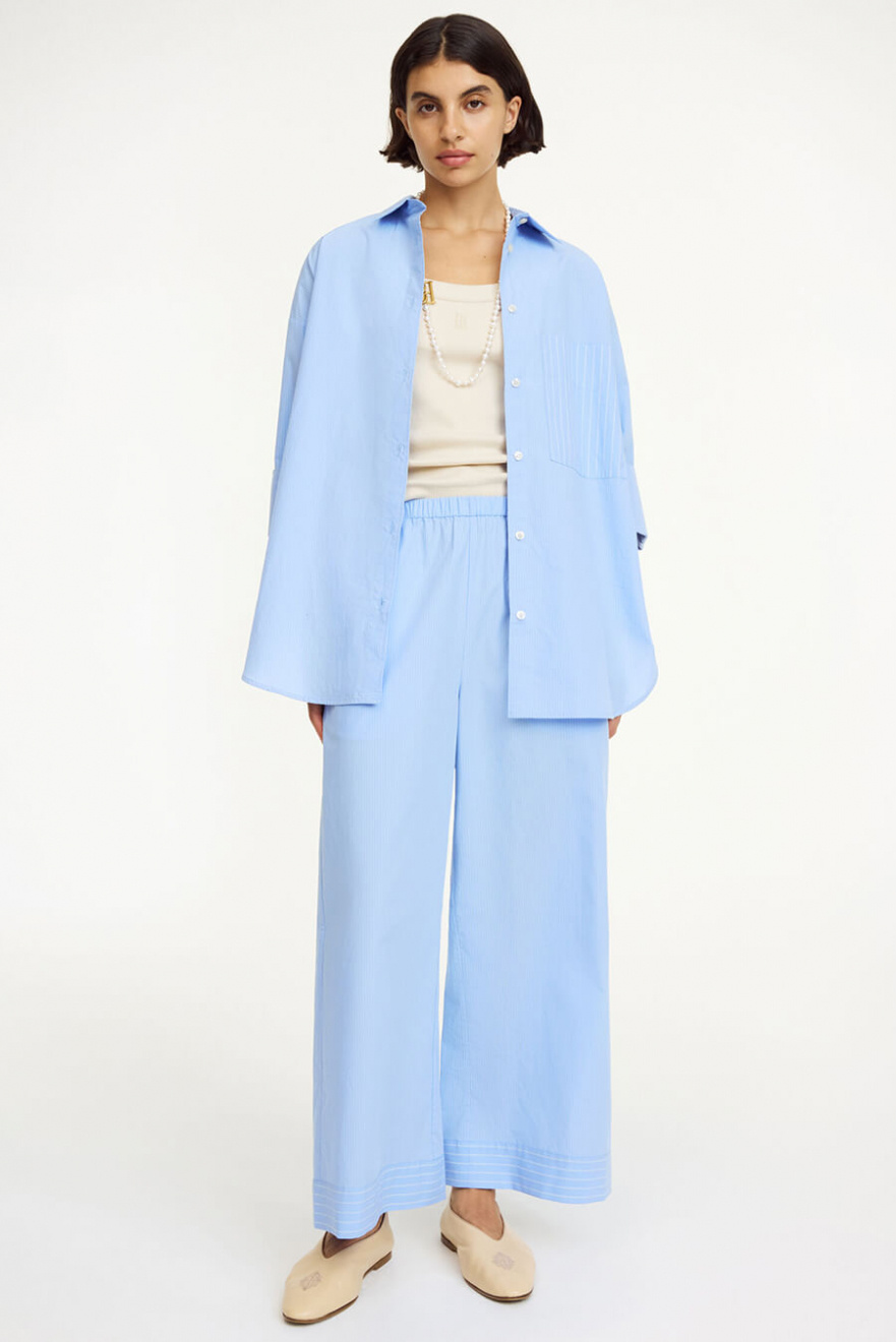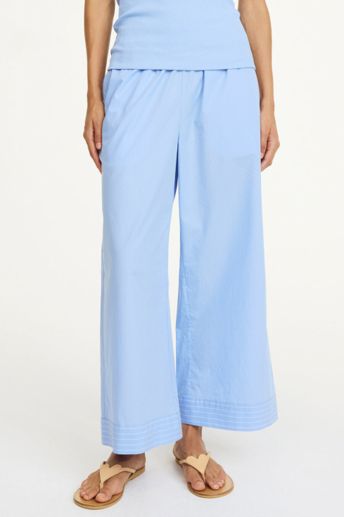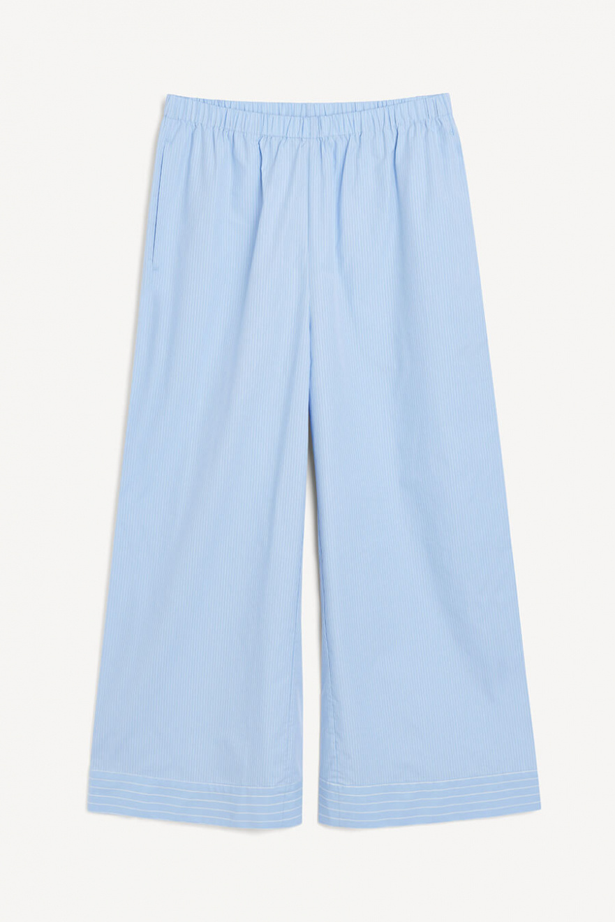 Mjuka, luftiga och den ultimata kombinationen av komfort och stil. Dessa blå vida bomullsbyxor med elastiskt midjeband fungerar lika bra med sneakers som med klackar. Ett självklart val i garderoben – tidlösa, mångsidiga och alltid lika rätt.Byxor i ekologisk bomull med elastisk resår i midjan, fickor i sidan, vida ben och ledig passform från By Malene Birger.