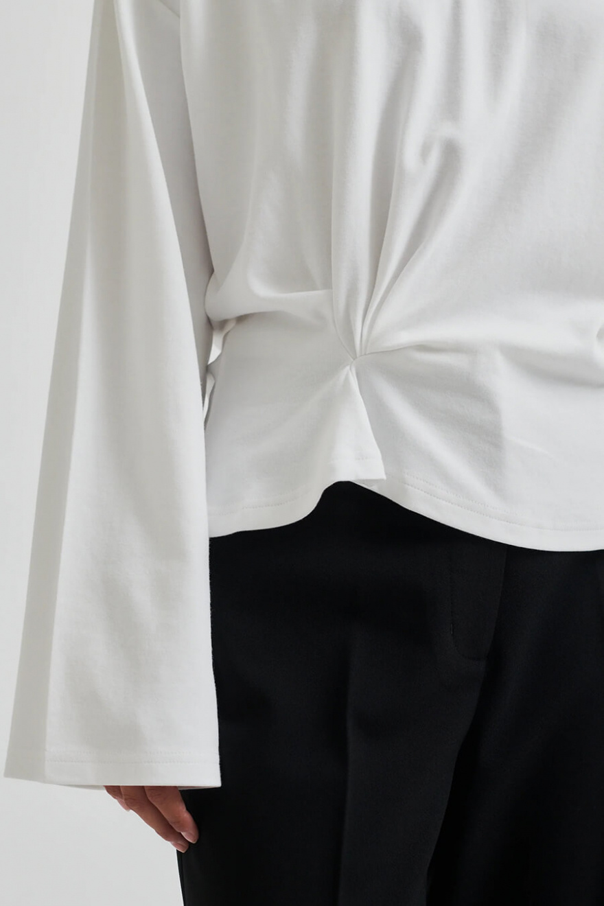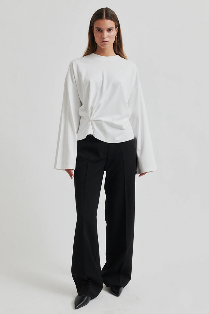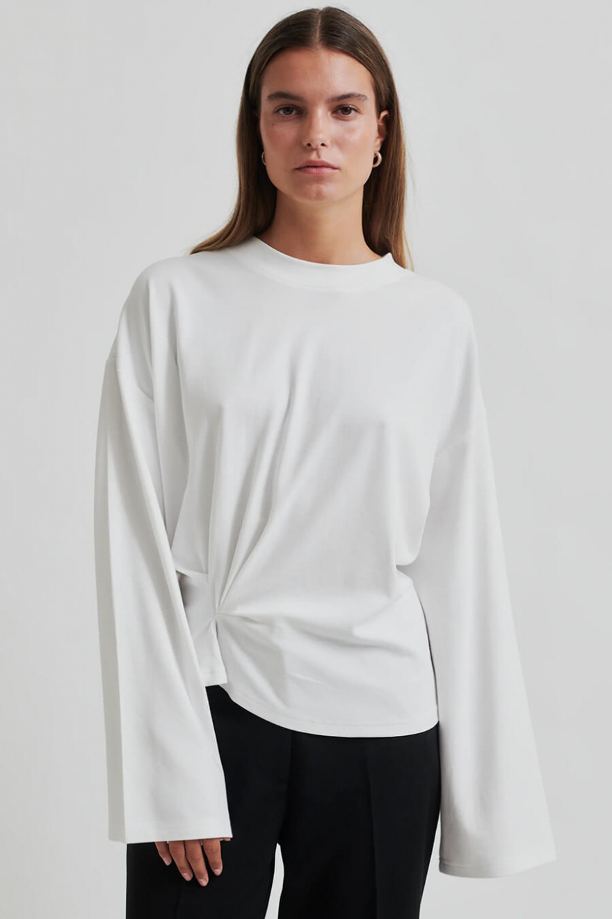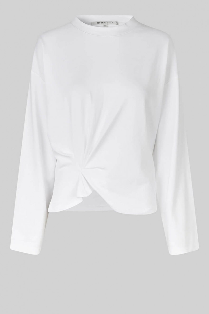 Den vita toppen med twistdetalj fram är allt du behöver för en stilren vardagslook. Med avslappnad passform och vida ärmar blir den ett självklart val för både kontoret och helgen. Minimalism med en twist – perfekt balans.Topp i bomullsblandning med rund halsringning, långa ärmar, fallande axelsömmar och draperad detalj nedtill från Second Female.