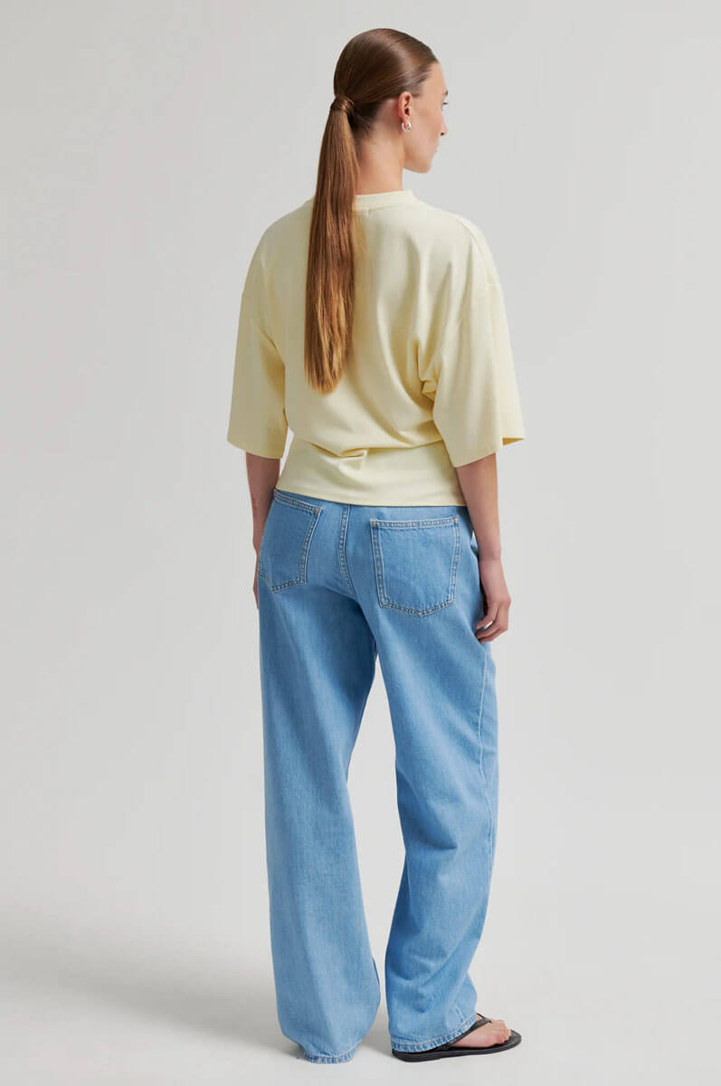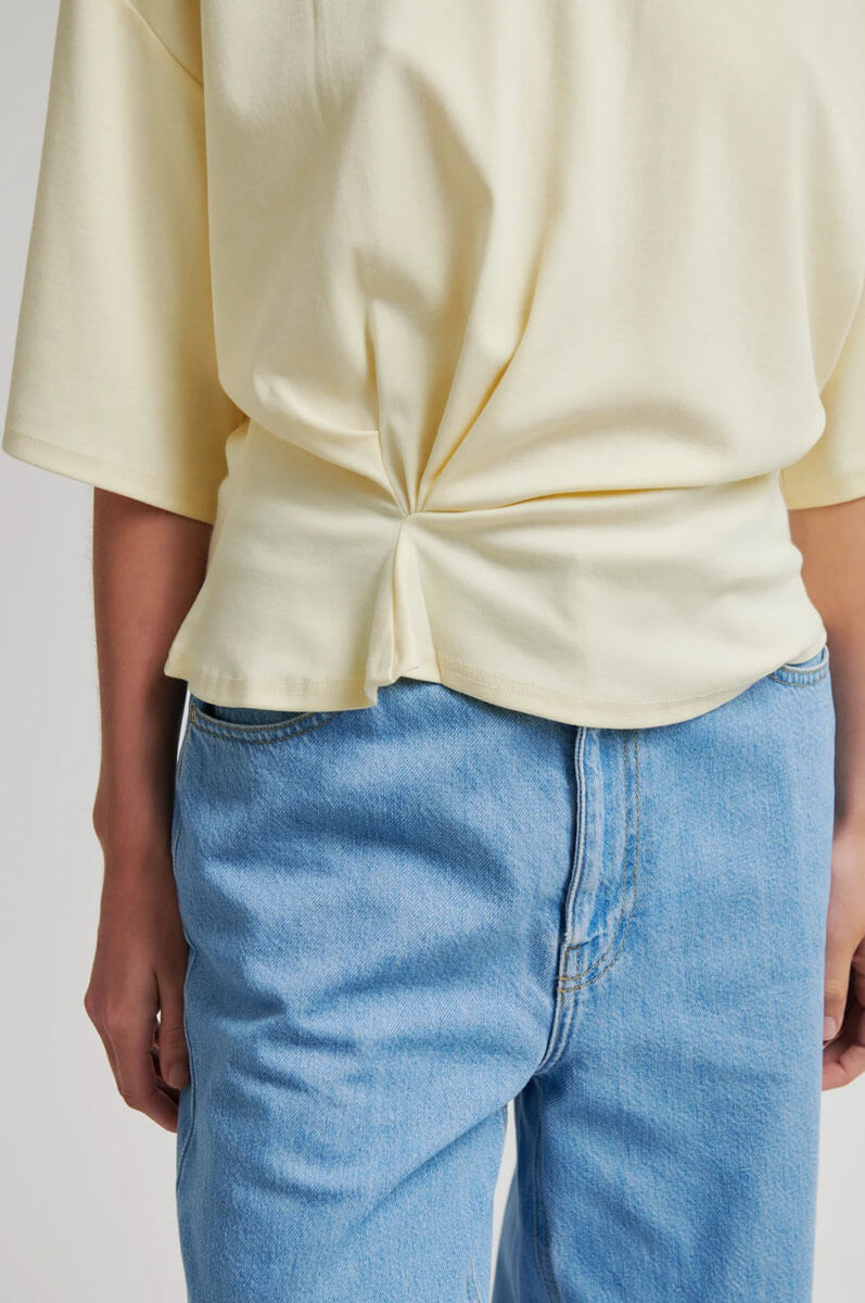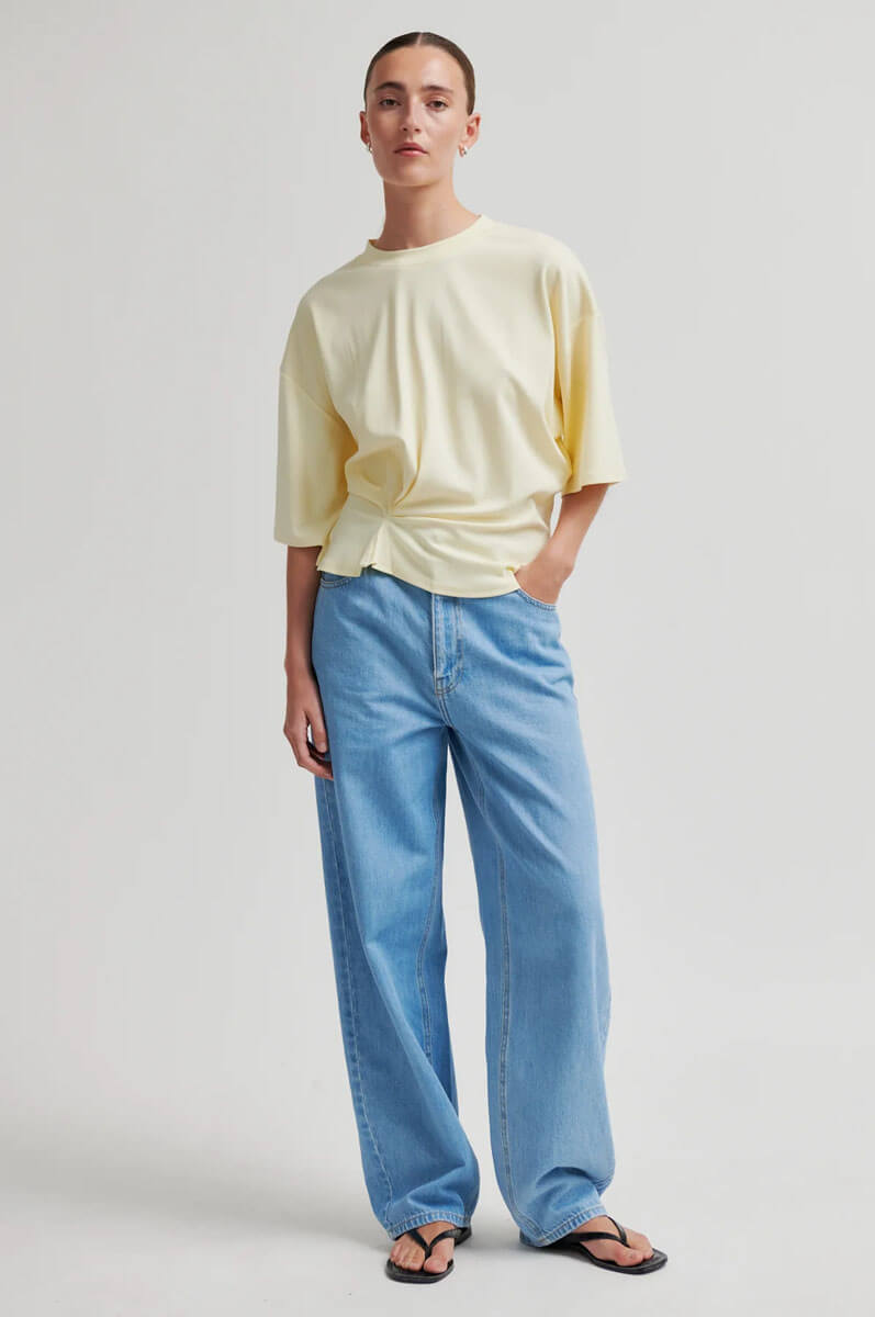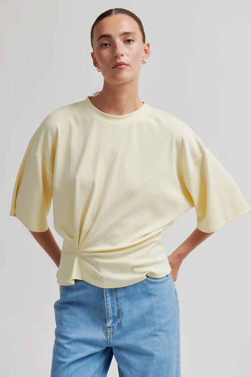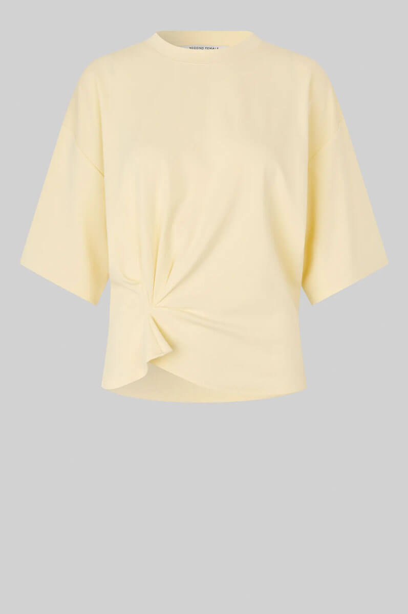 Den topp i fint ljusgul ton med en unik twist framtill sätter tonen för en modern och avslappnad stil. De korta, vida ärmarna ger en luftig känsla, medan den lediga passformen gör den lika rätt till vardag som till after work. Enkelhet med edge.T-shirt i mjuk bomullsblandning med rund halsringning, korta ärmar, fallande axelsömmar och en draperad detalj i sidan från Second Female.