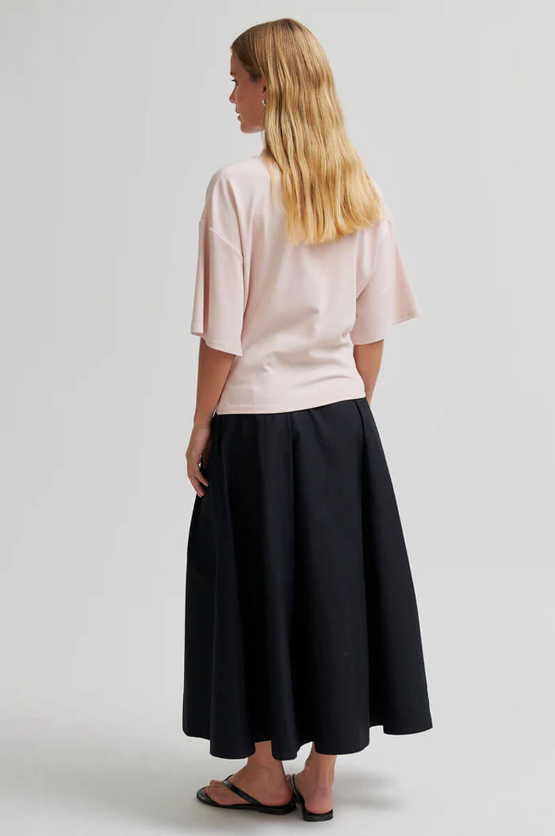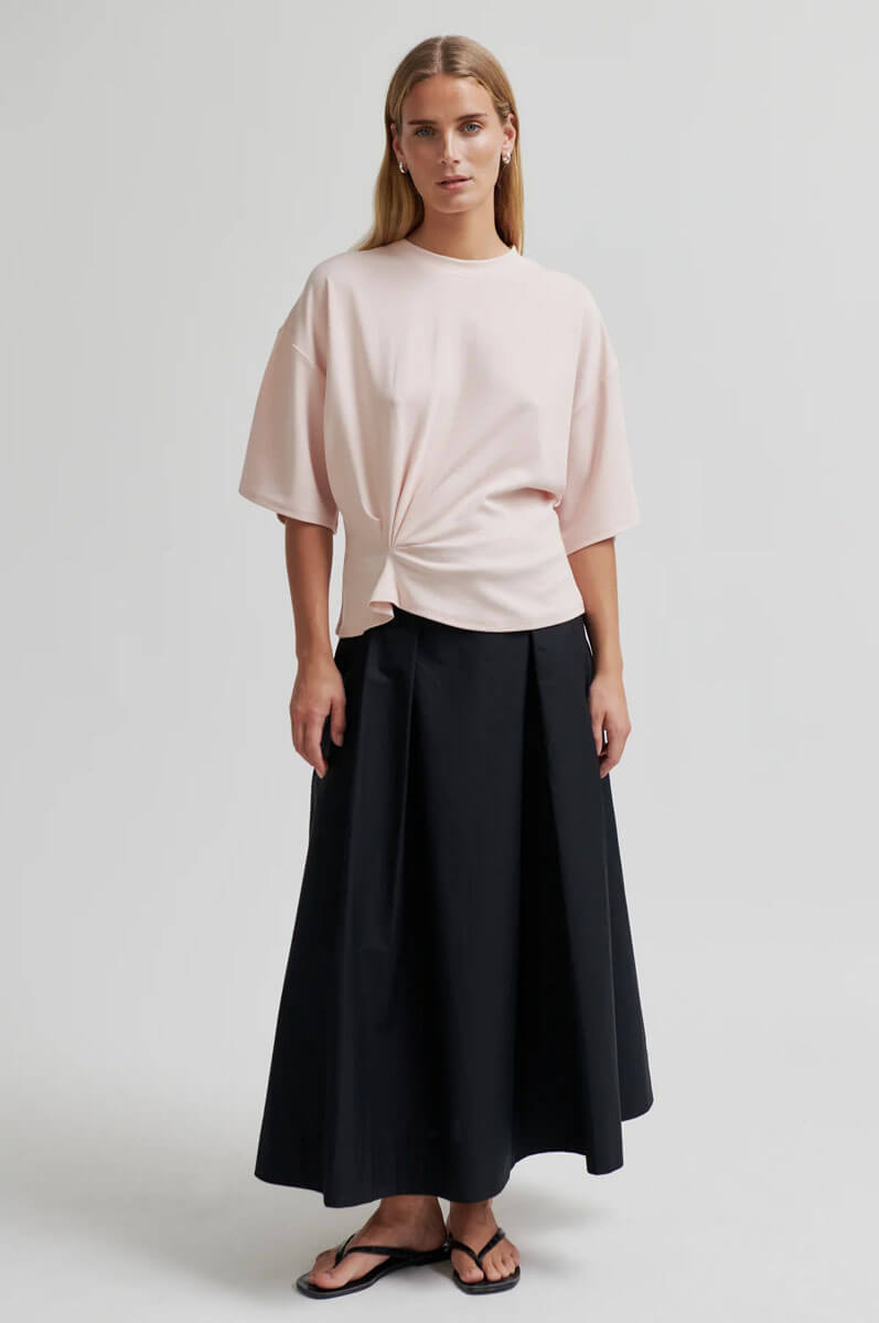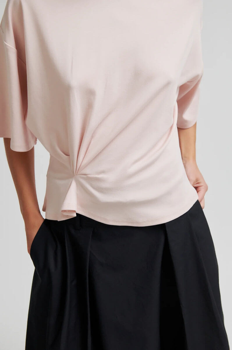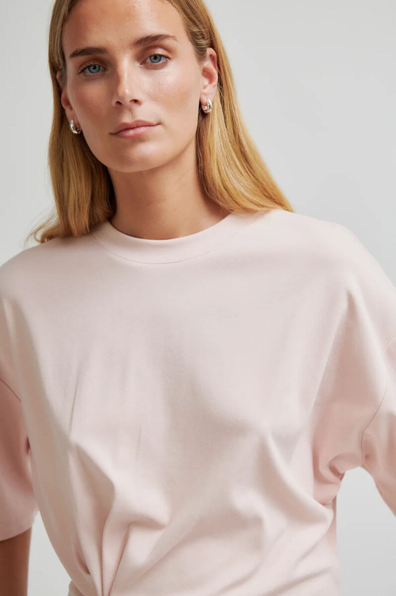 Den topp i fint ljusrosa ton med en unik twist framtill sätter tonen för en modern och avslappnad stil. De korta, vida ärmarna ger en luftig känsla, medan den lediga passformen gör den lika rätt till vardag som till after work. Enkelhet med edge.T-shirt i mjuk bomullsblandning med rund halsringning, korta ärmar, fallande axelsömmar och en draperad detalj i sidan från Second Female.