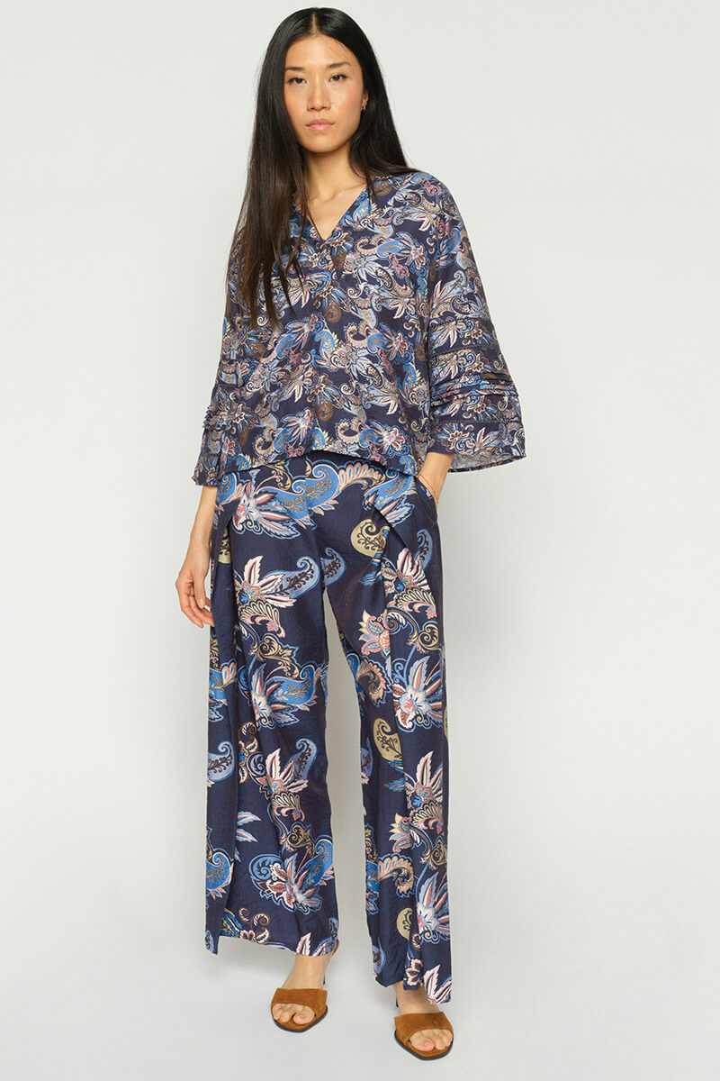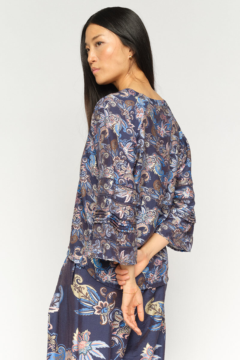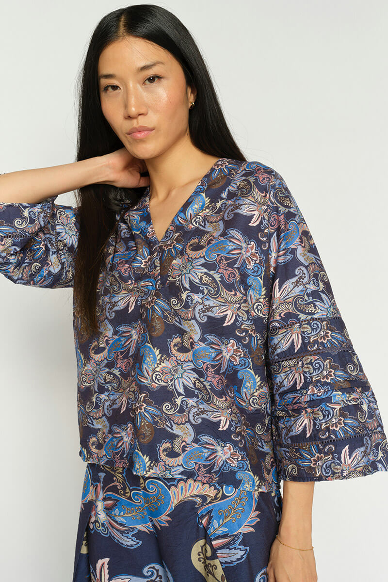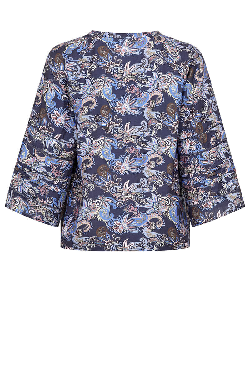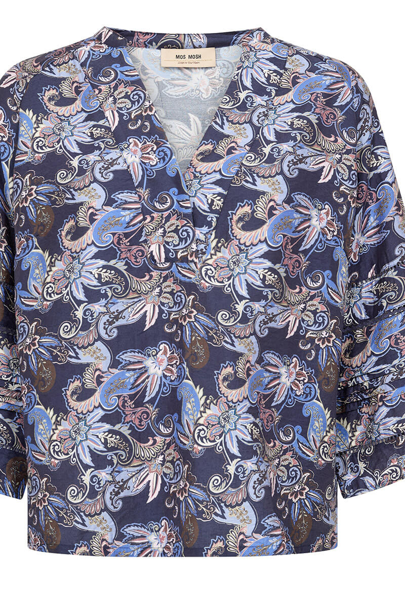 Denna vackra blus från Mos Mosh har en smickrande V-ringning, 3/4-ärmar och en ledig silhuett som faller mjukt längs kroppen. Det eleganta blå paisleymönstret ger ett tidlöst men modernt uttryck och gör blusen lika perfekt till vardag som till mer uppklädda tillfällen.