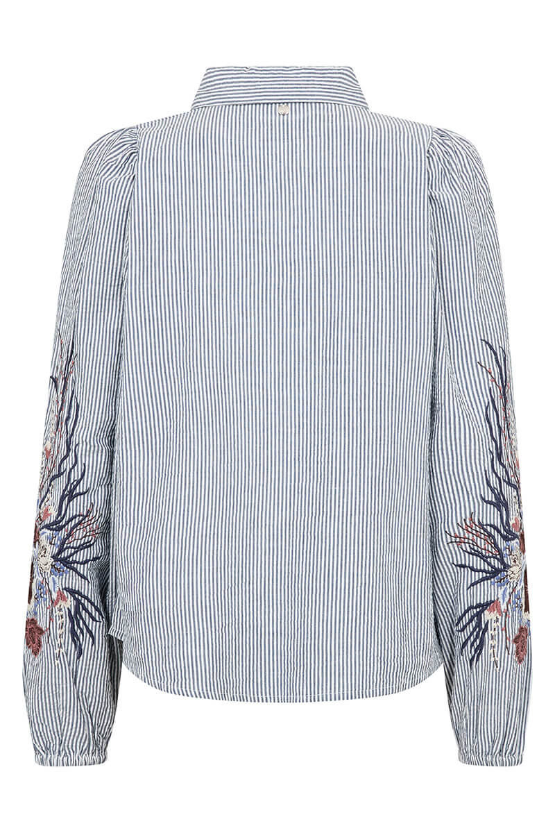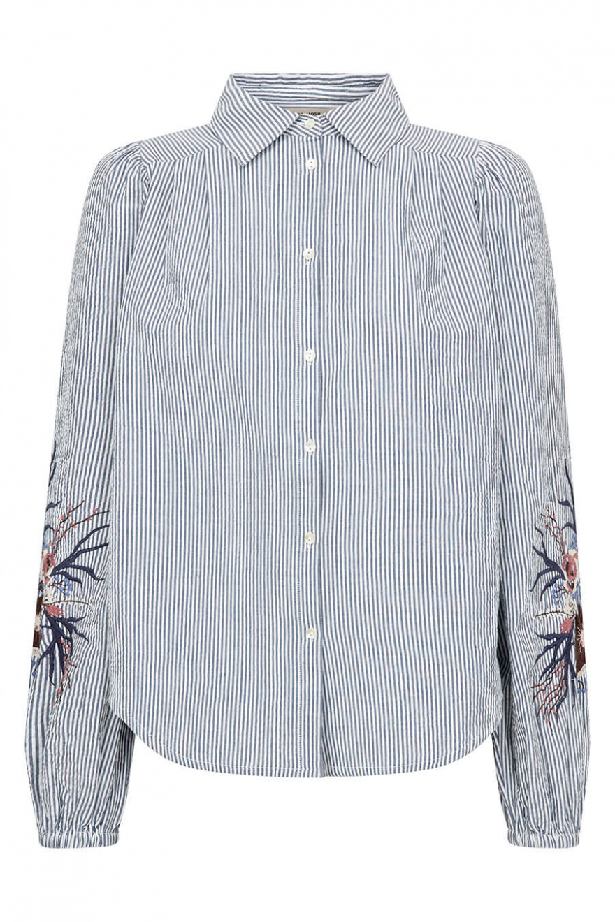 Denna randiga blus från Mos Mosh är ett elegant och feminint plagg för vår- och sommarsäsongen.