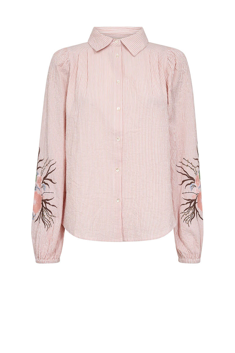Denna randiga blus i beckebölja-bomull från Mos Mosh är ett elegant och feminint plagg för vår- och sommarsäsongen.
