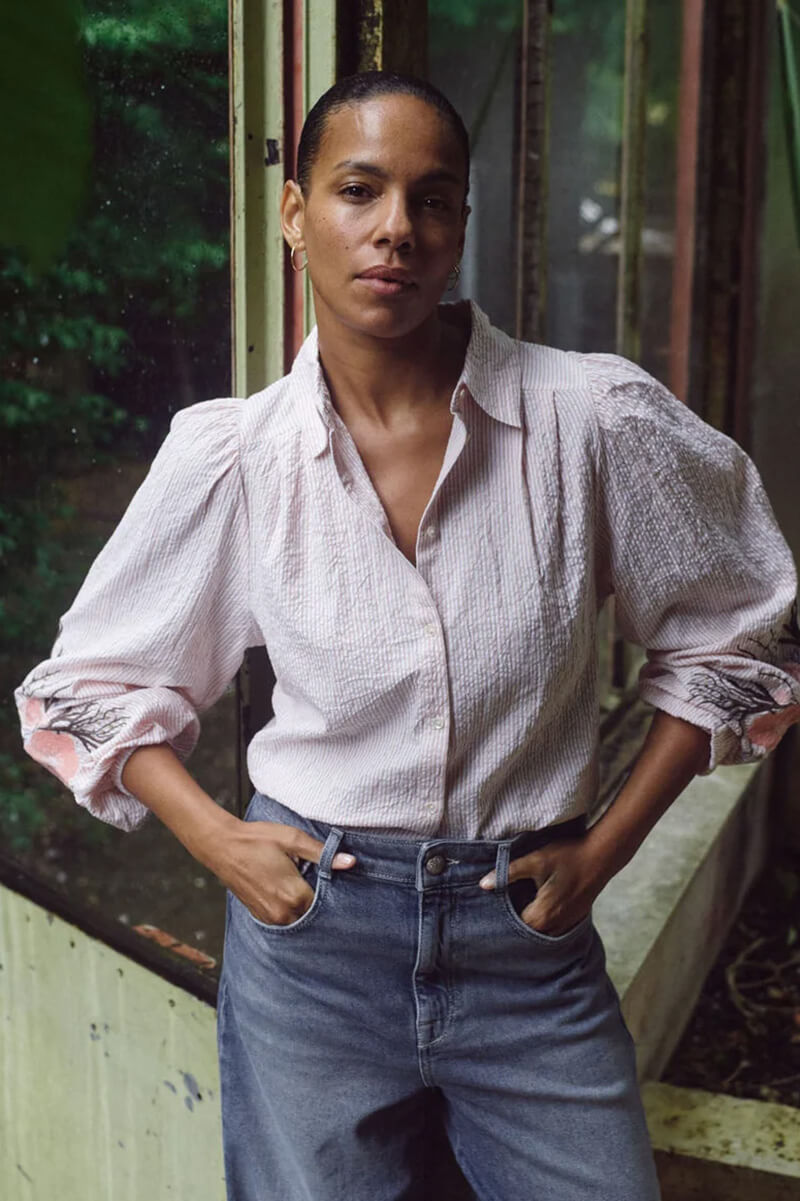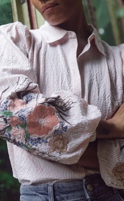 Tillverkad i mjuk och luftig bomull, med vackra broderade detaljer på ärmarna som ger en exklusiv och stilfull känsla. Den mandarin-inspirerade kragen tillsammans med knäppning framtill skapar en tidlös silhuett som passar lika bra till vardag som till mer uppklädda tillfällen.