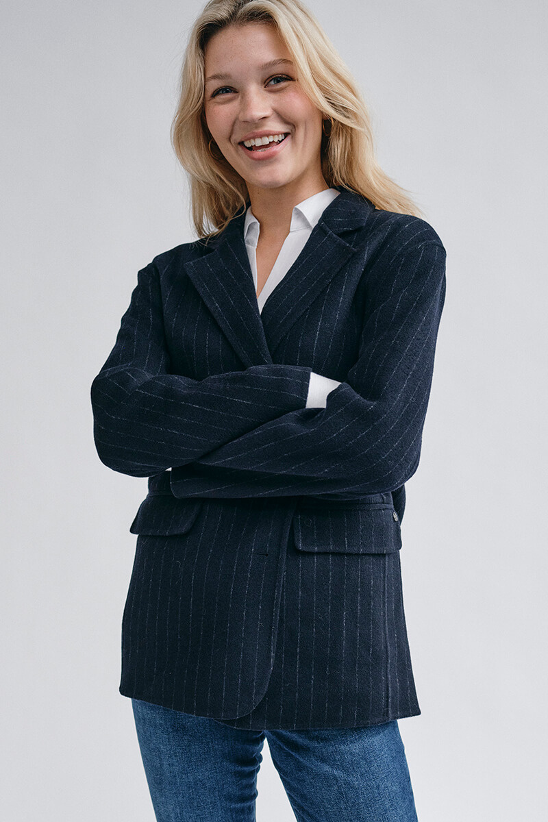 En mjuk och elegant ullkavaj som gör varje outfit komplett. Den subtila pinstripe-randningen ger en tidlös känsla och gör kavajen lika snygg till avslappnade jeans som till skräddade byxor.