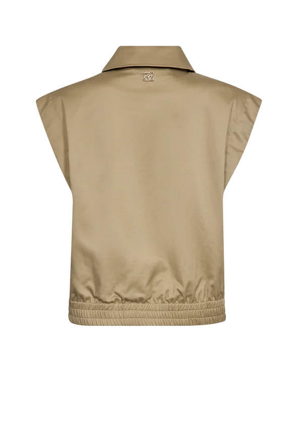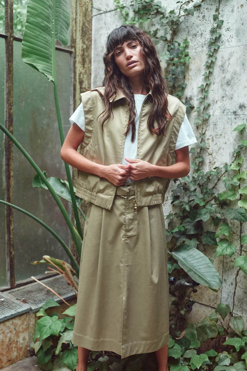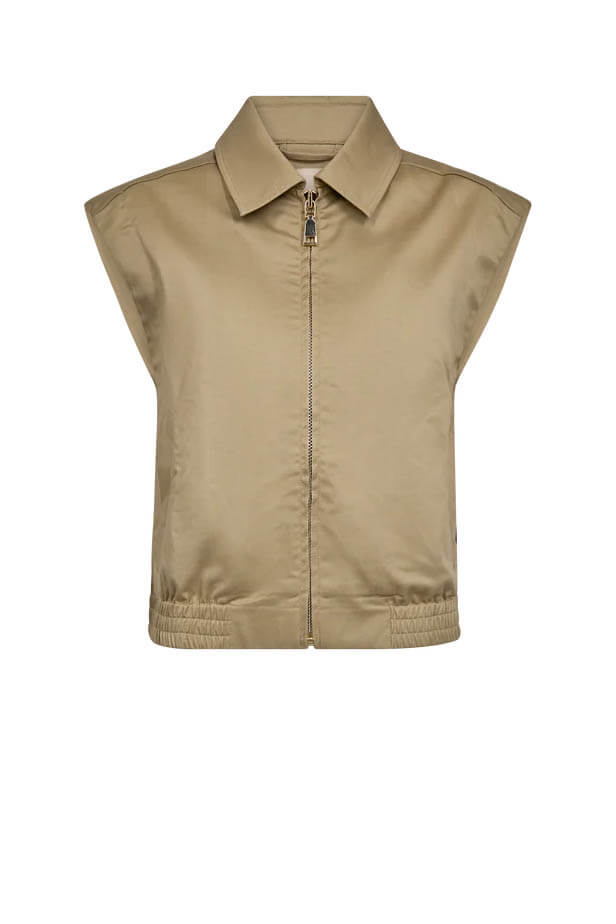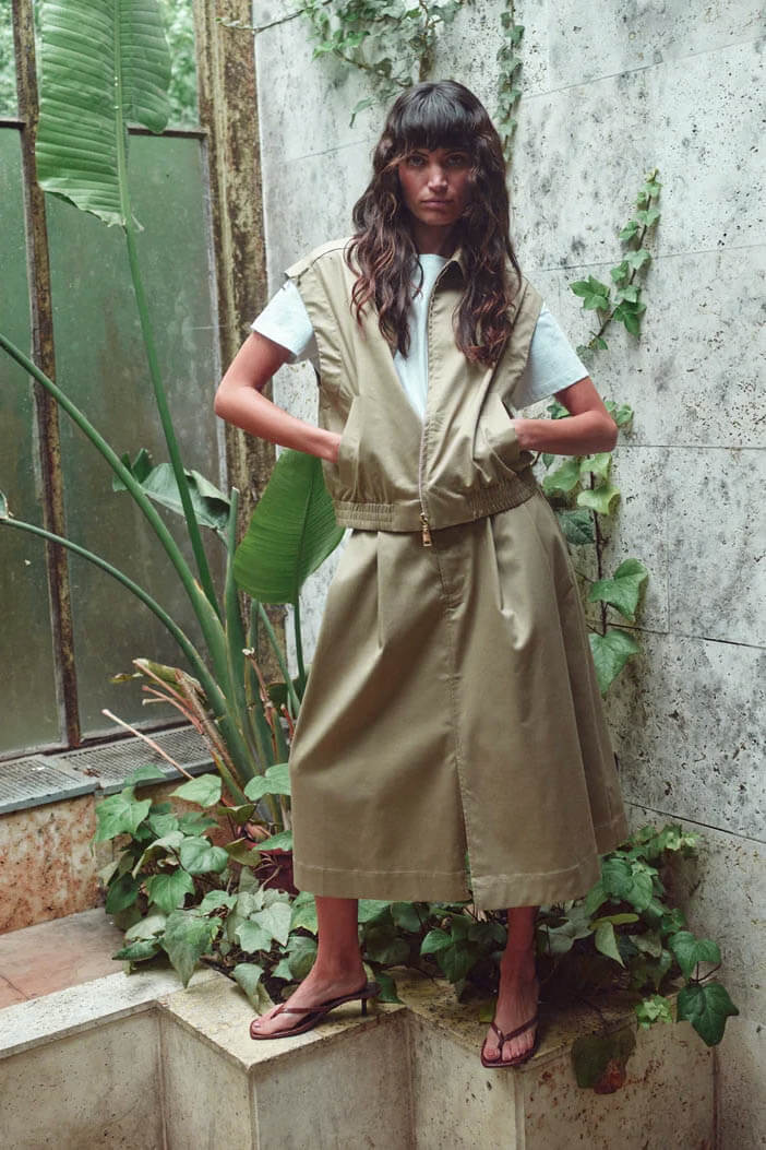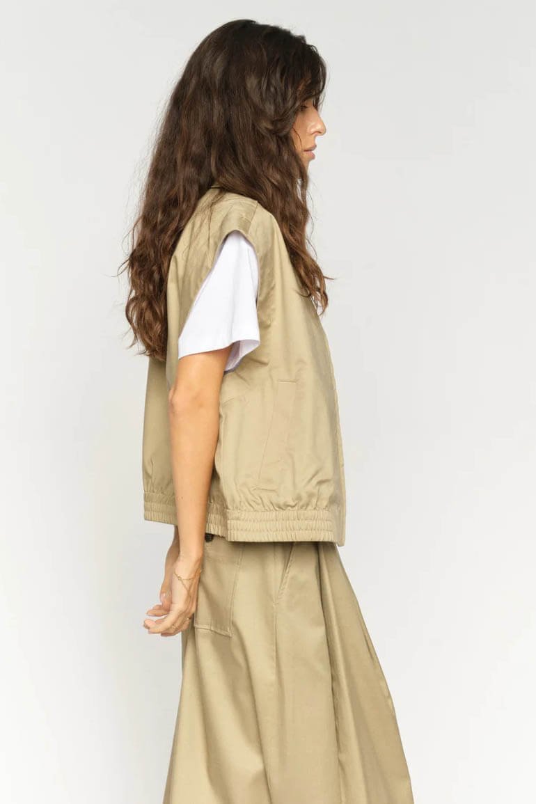 Västen som lyfter och fulländar din outfit. Med sin moderna silhuett och stilrena beige nyans är den lika fin tillsammans med kjolen i samma tyg som till vårens jeans – en självklar favorit i garderoben.