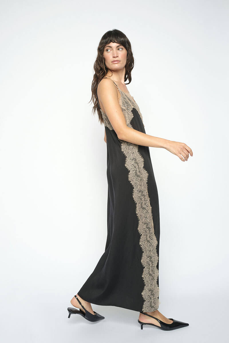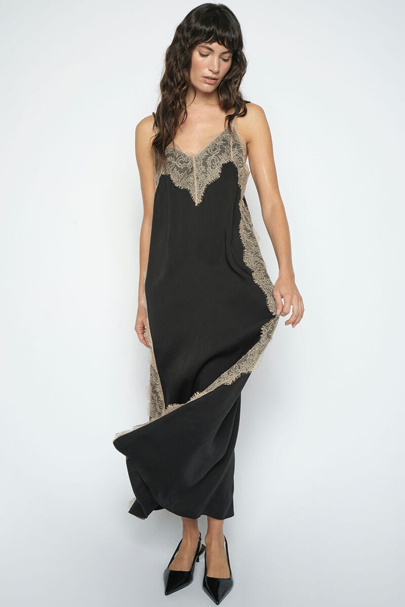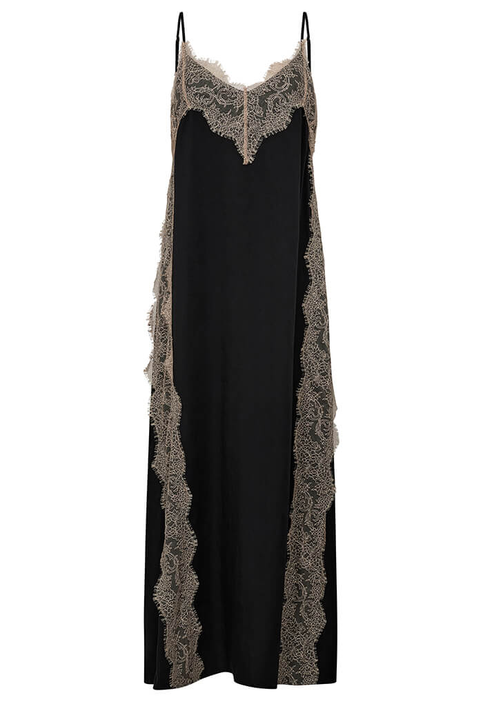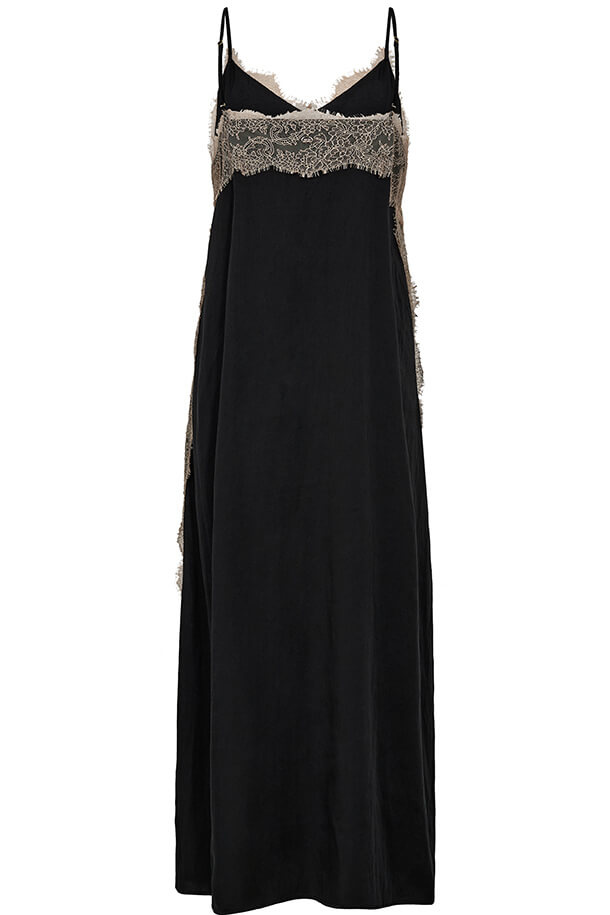 Lång klänning med smala axelband, V-ringning och spetsdetaljer i ett följsamt material.- Normal i storlek, ledig passform nertill.