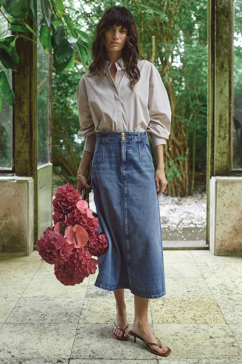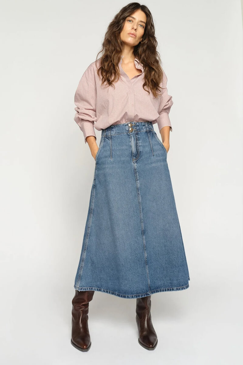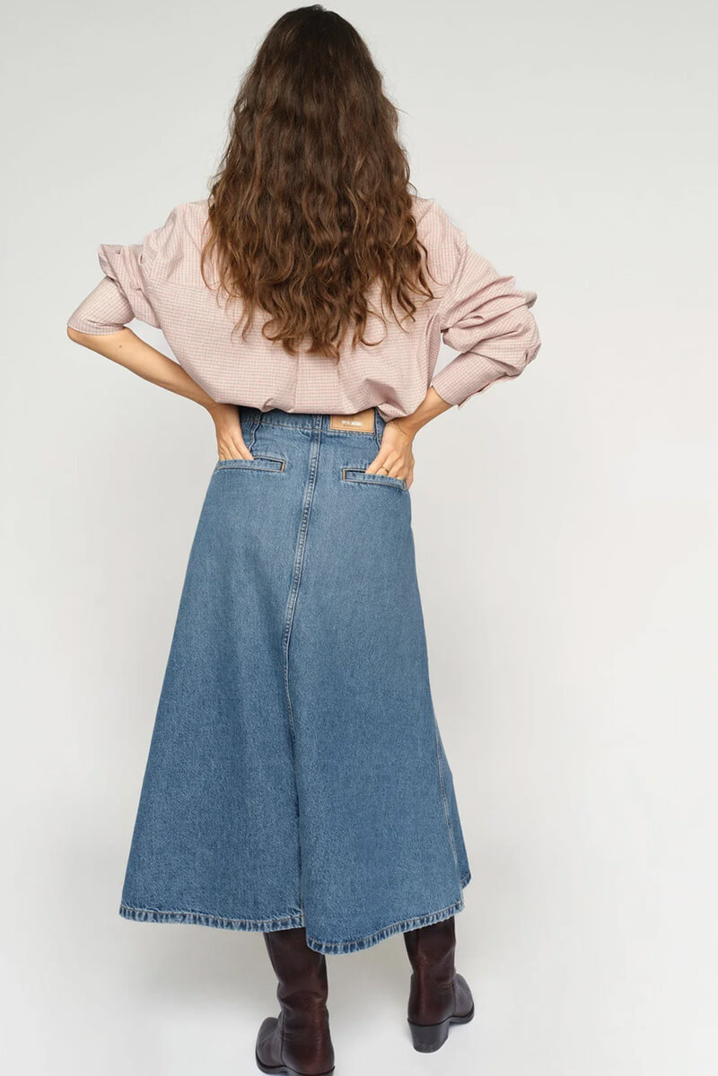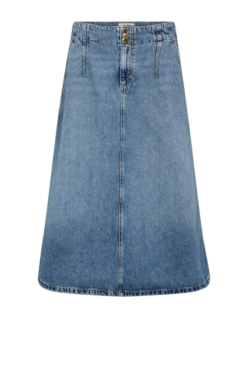 Jeanskjolen ett perfekt plagg till krispig skjorta eller avslappnad stickad topp för en tidlös look.En modern tolkning av den klassiska jeanskjolen, tillverkad i 100 % bomull för struktur och hållbarhet. Designad med smickrande midjehöjd och dold knapp- och dragkedjestängning för en ren finish.