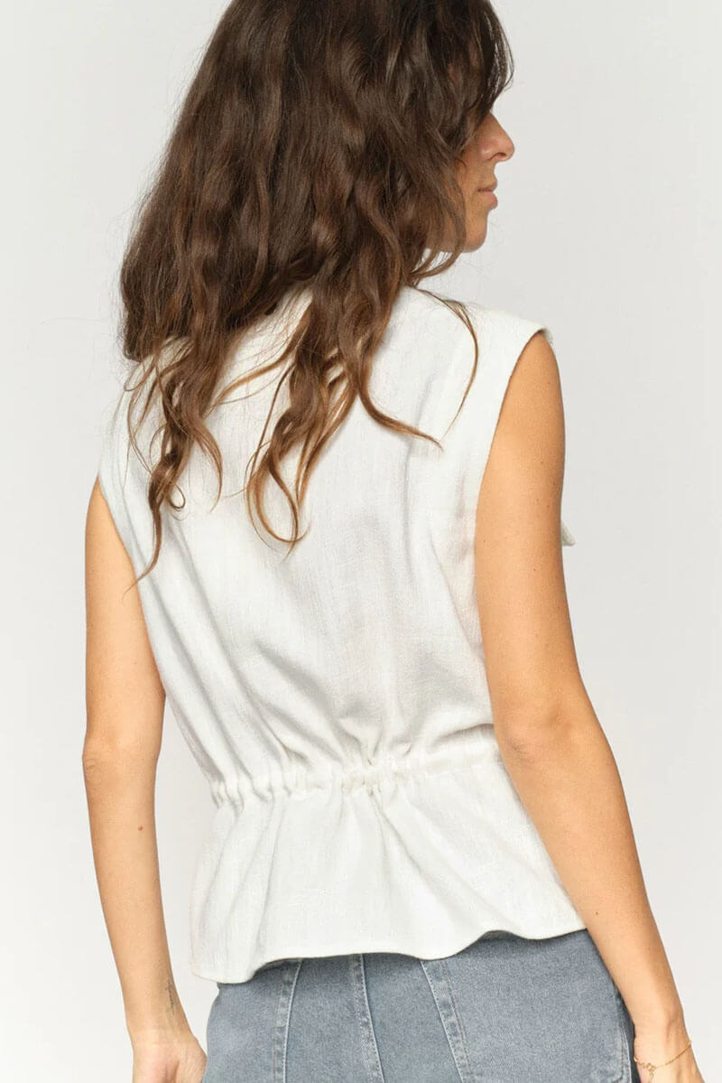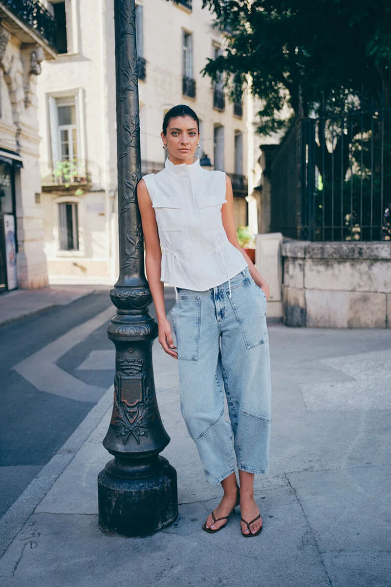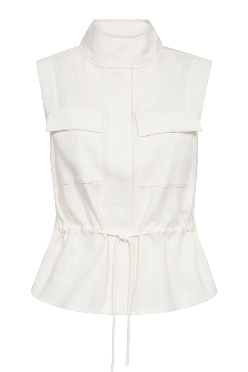 En modern tolkning av utility-stilen.Denna ärmlösa väst är tillverkad i mjuk och luftig ramie- och bomullsblandning med ståkrage, dold dragkedja och justerbar midja som framhäver silhuetten. Bär över en enkel t-shirt eller skjorta för en chic lager-på-lager-look som fungerar säsong efter säsong.