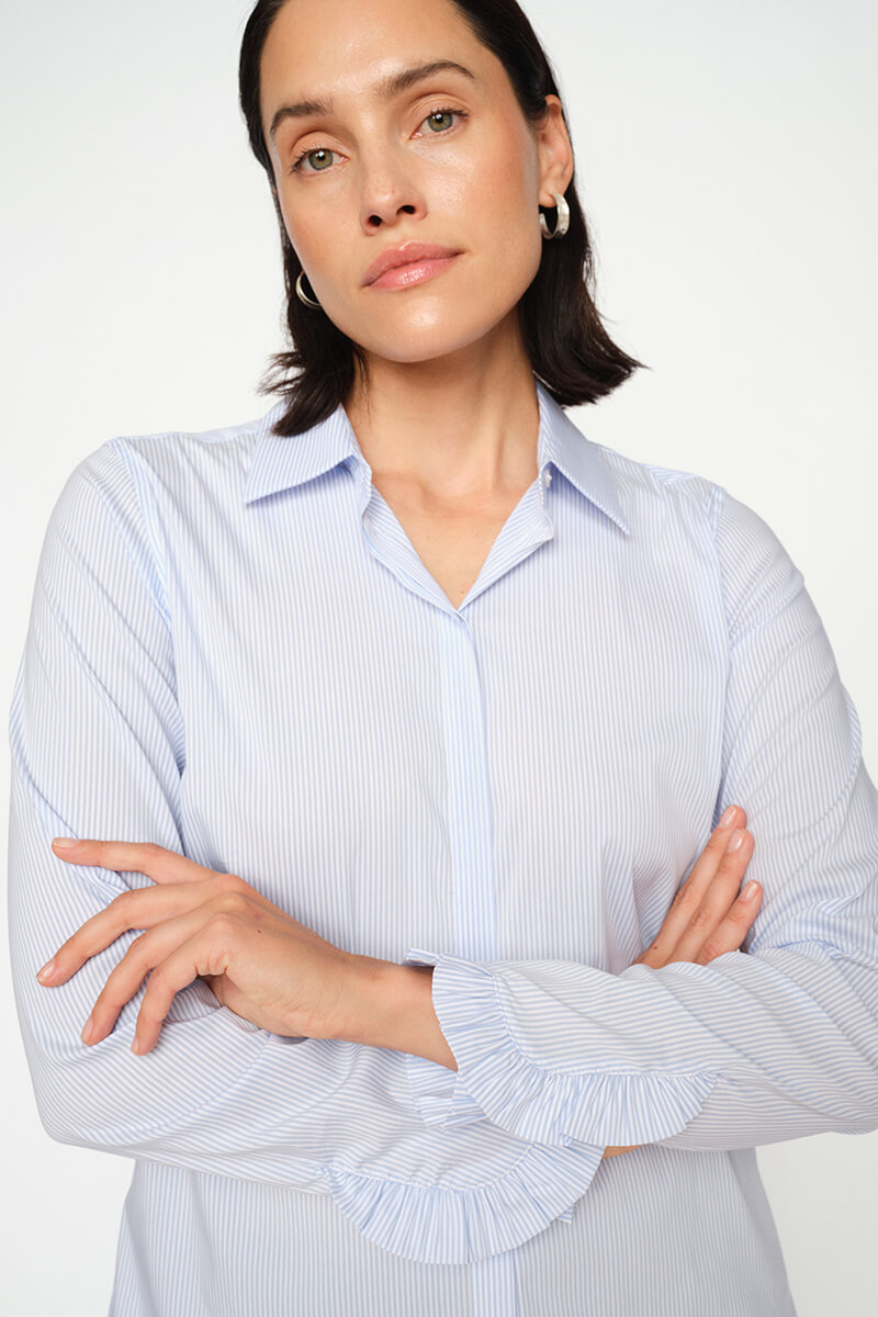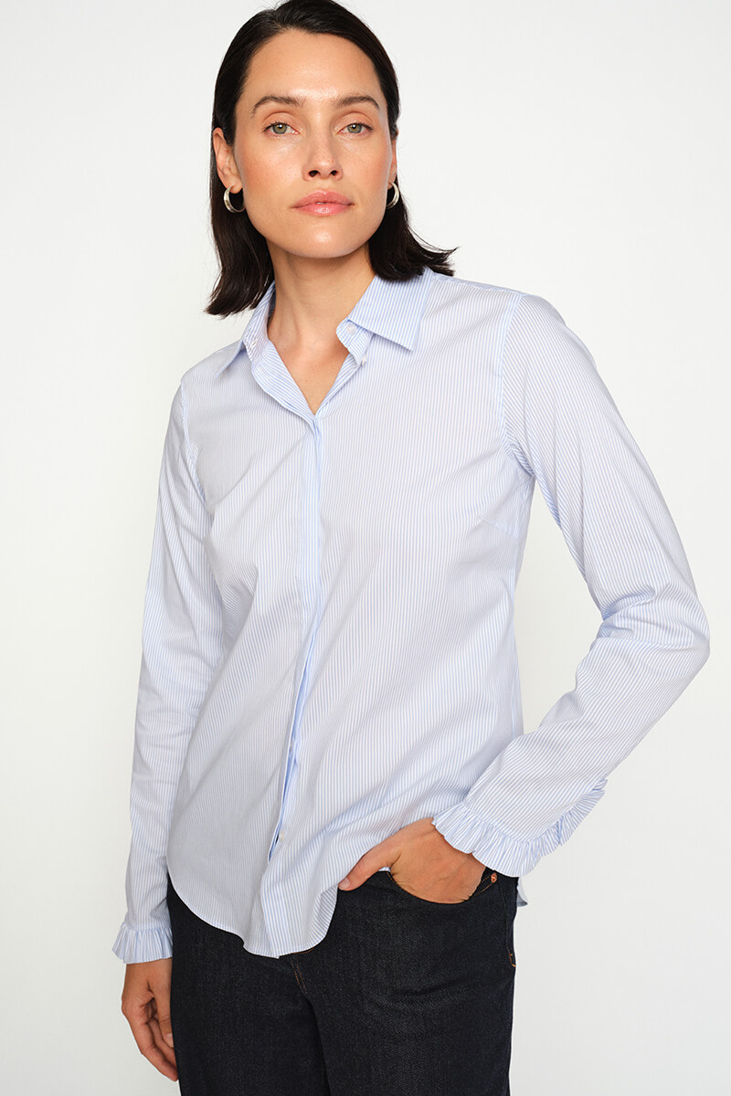 Blus med feminin känsla i mjuk stretch.Den här modellen har en smickrande, slimmad silhuett och är tillverkad i ett ultrasoft, stretchigt material. Med klassisk krage, eleganta volangprydda manschetter och en tidlös knäppning framtill blir den snabbt en favorit i garderoben.