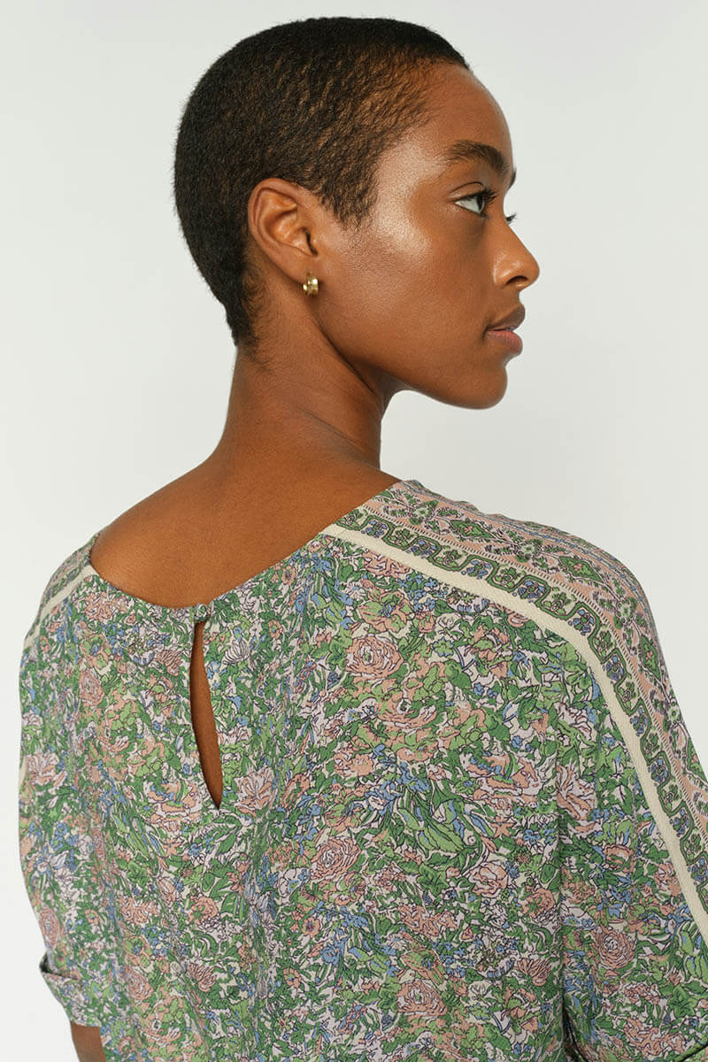 Blusen har ett vackert grönt mönster, 3/4-ärm och en fin detalj med knapp i nacken som ger ett sofistikerat uttryck. Den normala passformen gör den enkel att bära och lätt att styla – lika fin till vardag som till mer uppklädda tillfällen.
