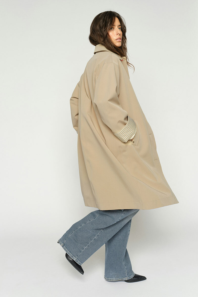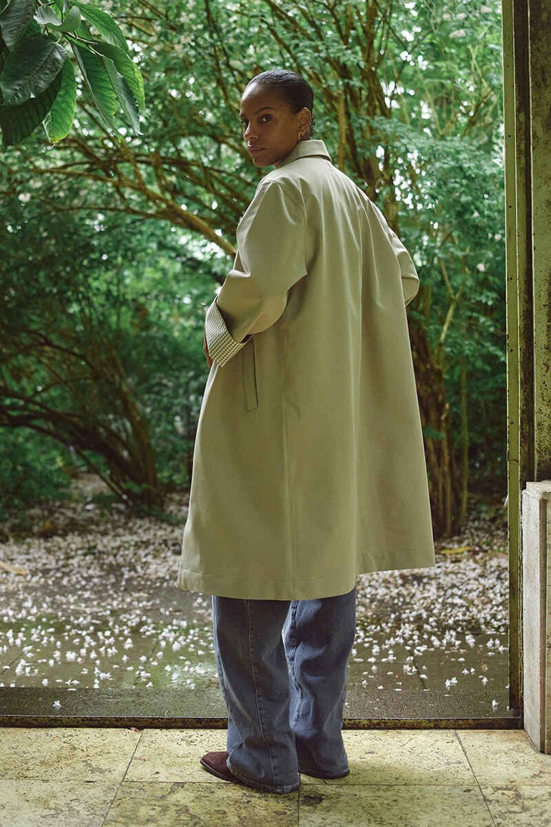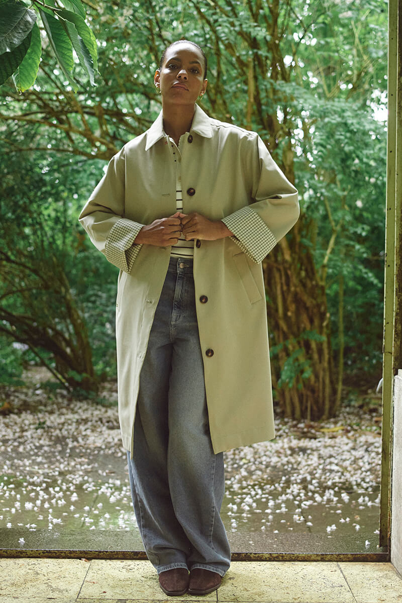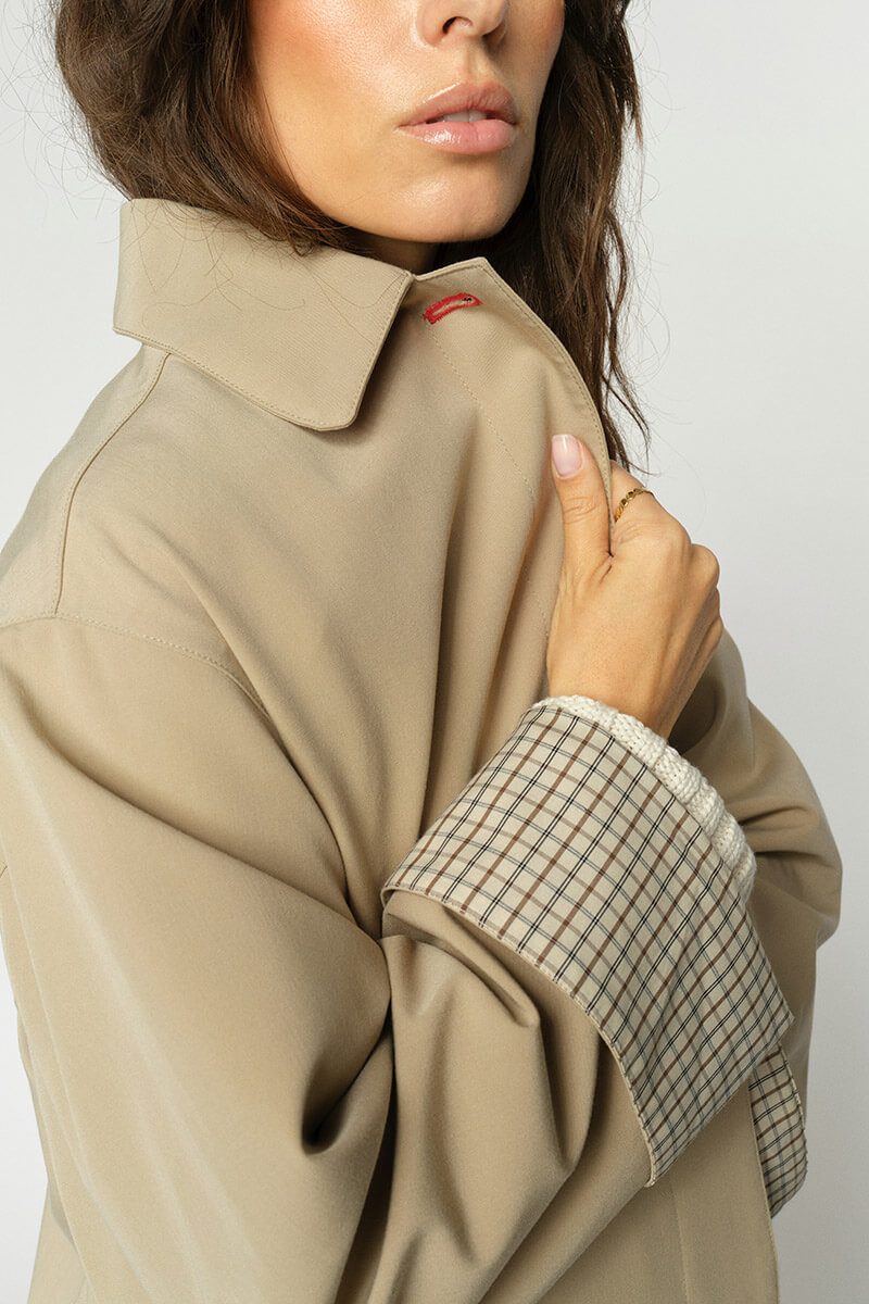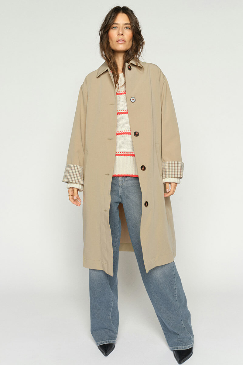 En modern twist på den klassiska trenchcoaten i relaxed fit. Designad i avslappnad passform med klassisk krage, knappstängning och croppade ärmar med randiga kontrastdetaljer.
