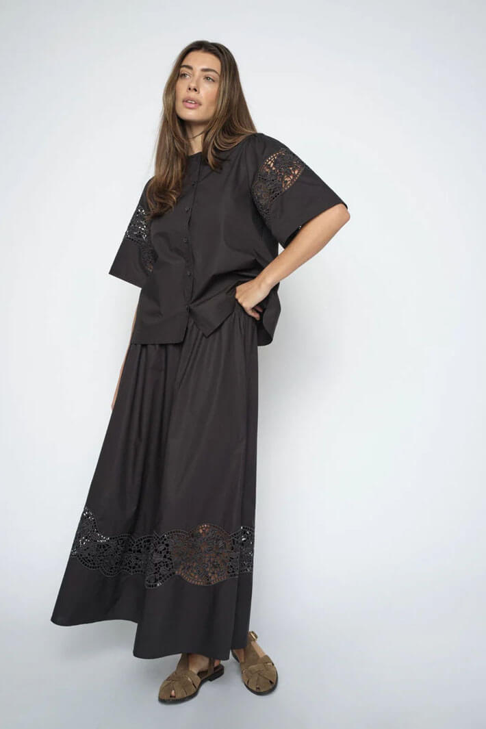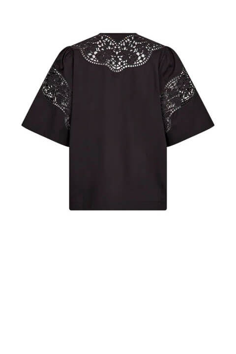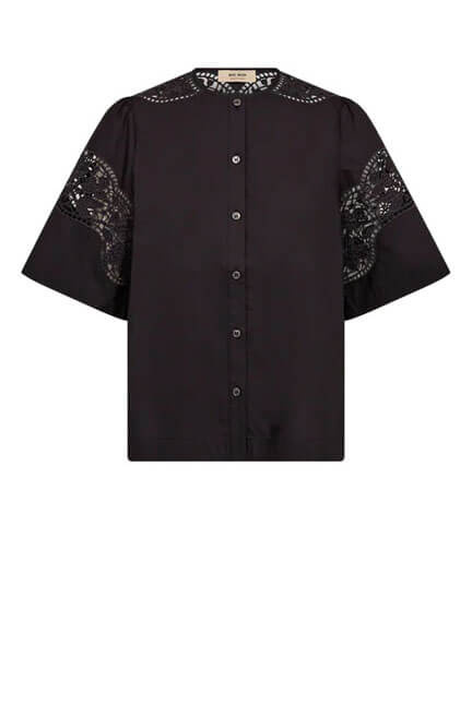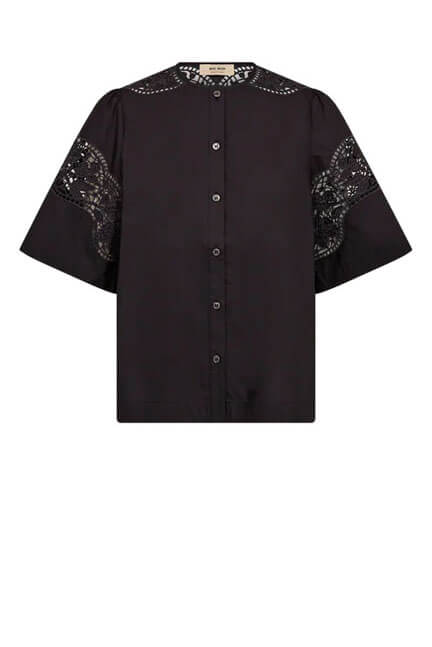 En blus från Mos Mosh med extra fina detaljer.Denna lätta blus har avslappnad passform och korta ärmar. Fina broderade detaljer ger ett feminint uttryck, medan knäppningen och det rena snittet gör den enkel att styla för både vardag och mer välklädda looks. Lätt i tyget och skön.