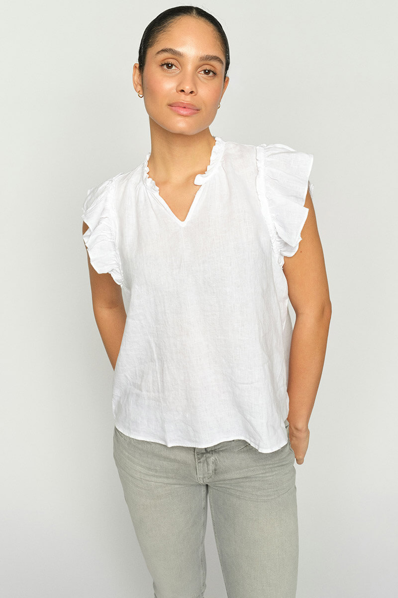 Fin linneblus med liten volang över axeln och litet sprund fram. Kombinera med snygga jeans eller en fin kjol.Normal i storleken