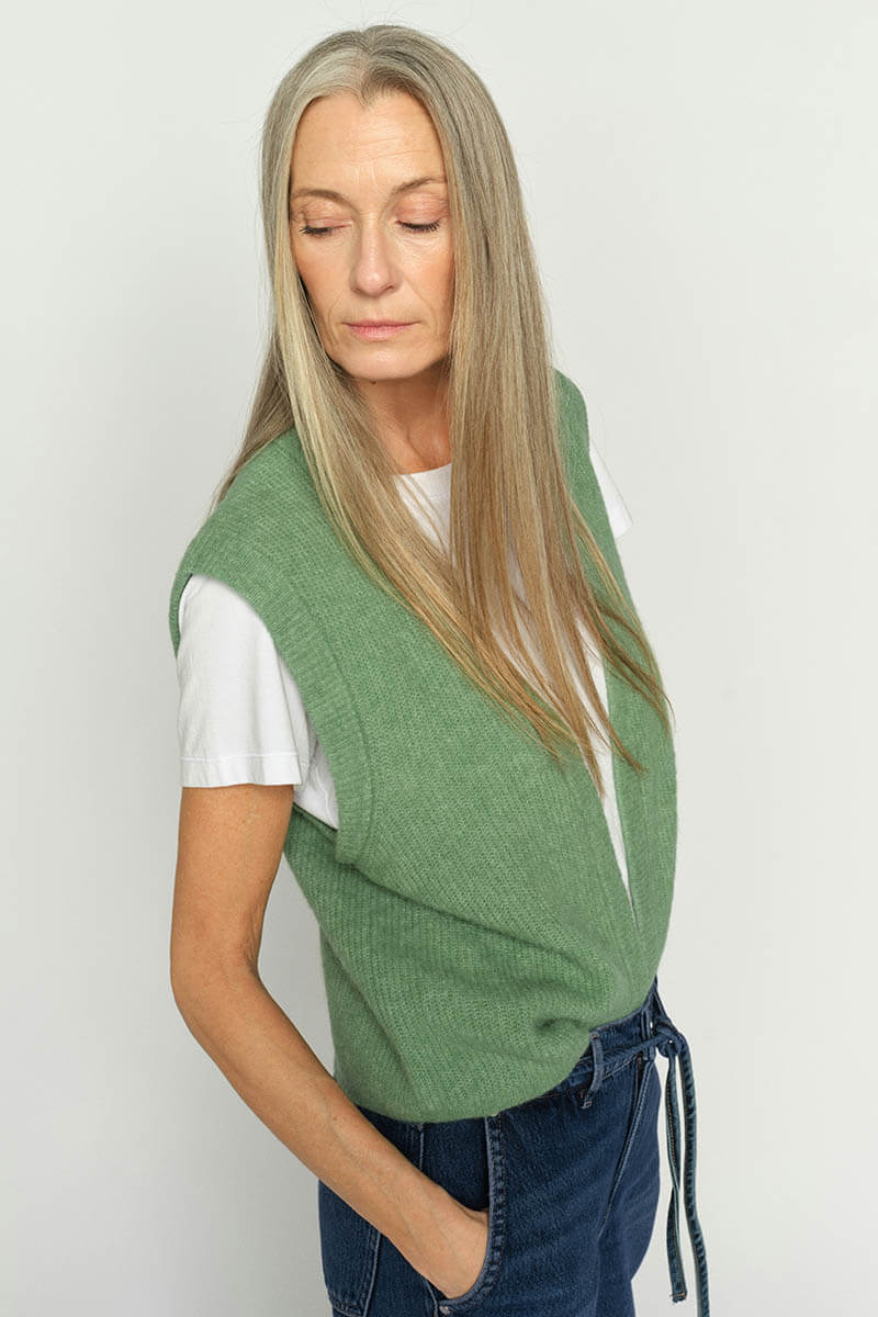 Snyggt i vår och håller värmen över toppar och blusar.En tidlös stickad väst i en mjuk och varm blandning av ull och alpacka. Designad i avslappnad silhuett med öppen front – perfekt att bära över skjortor eller klänningar.