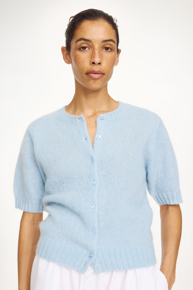 Den mjuka mohairblandningen ger en lätt och luftig känsla samtidigt som den värmer lagom mycket. Den tidlösa designen med kort ärm, rund halsringning och ribbade avslut gör den enkel att matcha över toppar, T-shirts och klänningar för en avslappnat chic look.