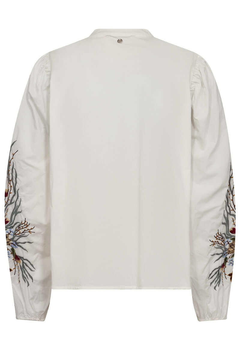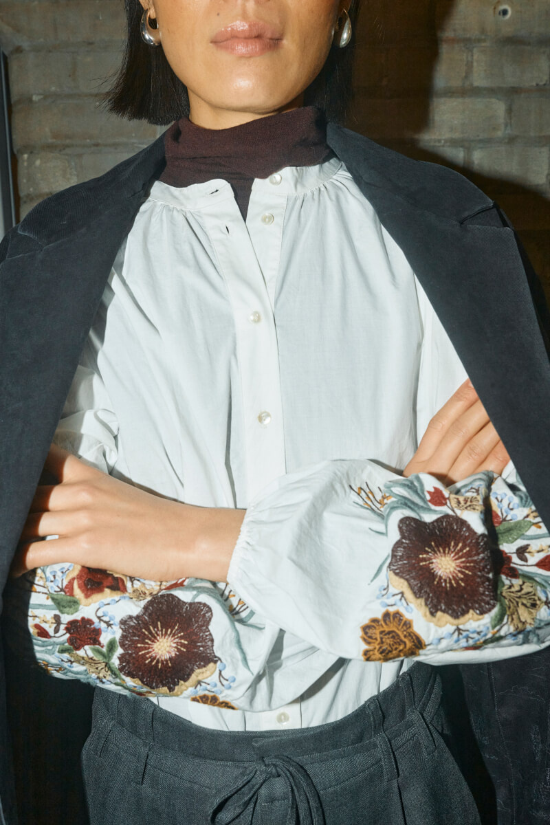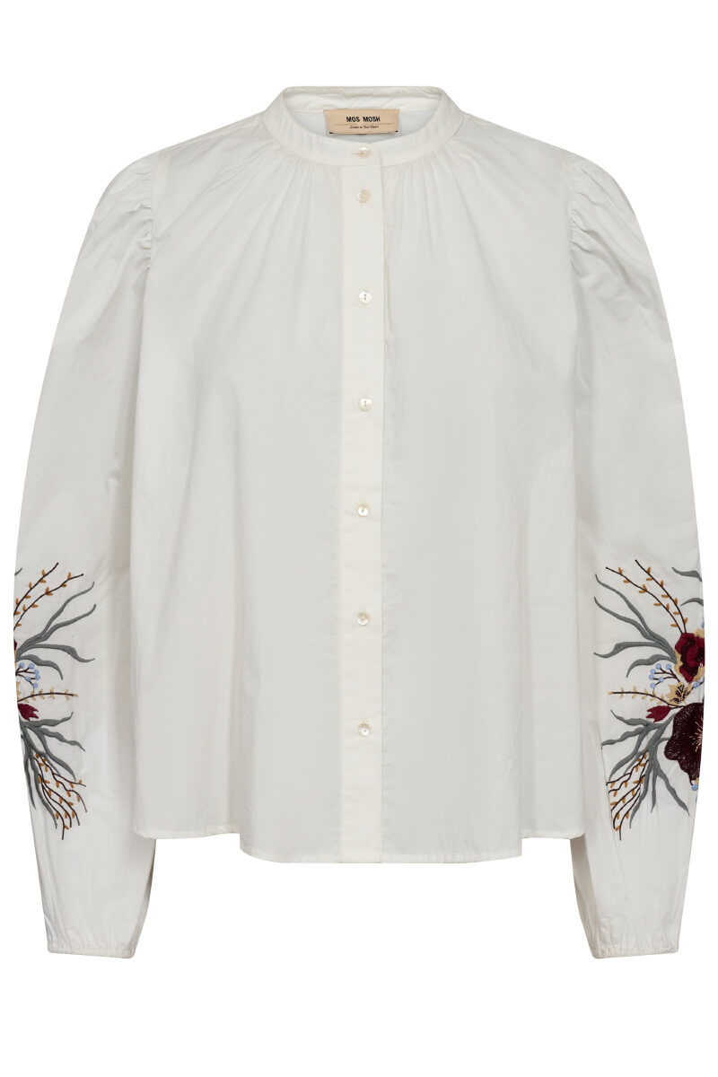 Vit skjorta med broderade blommor – poetisk men modern. Den lösa passformen med mörka jeans och loafers är en kanon kombo. Perfekt för lager-på-lager eller som solitär detalj i en stilren look.Skjorta i krispig bomull med lös passform, puffiga ärmar, broderat mönster på ärmarna, stängs med knappar fram och mandarinkrage från MosMosh.