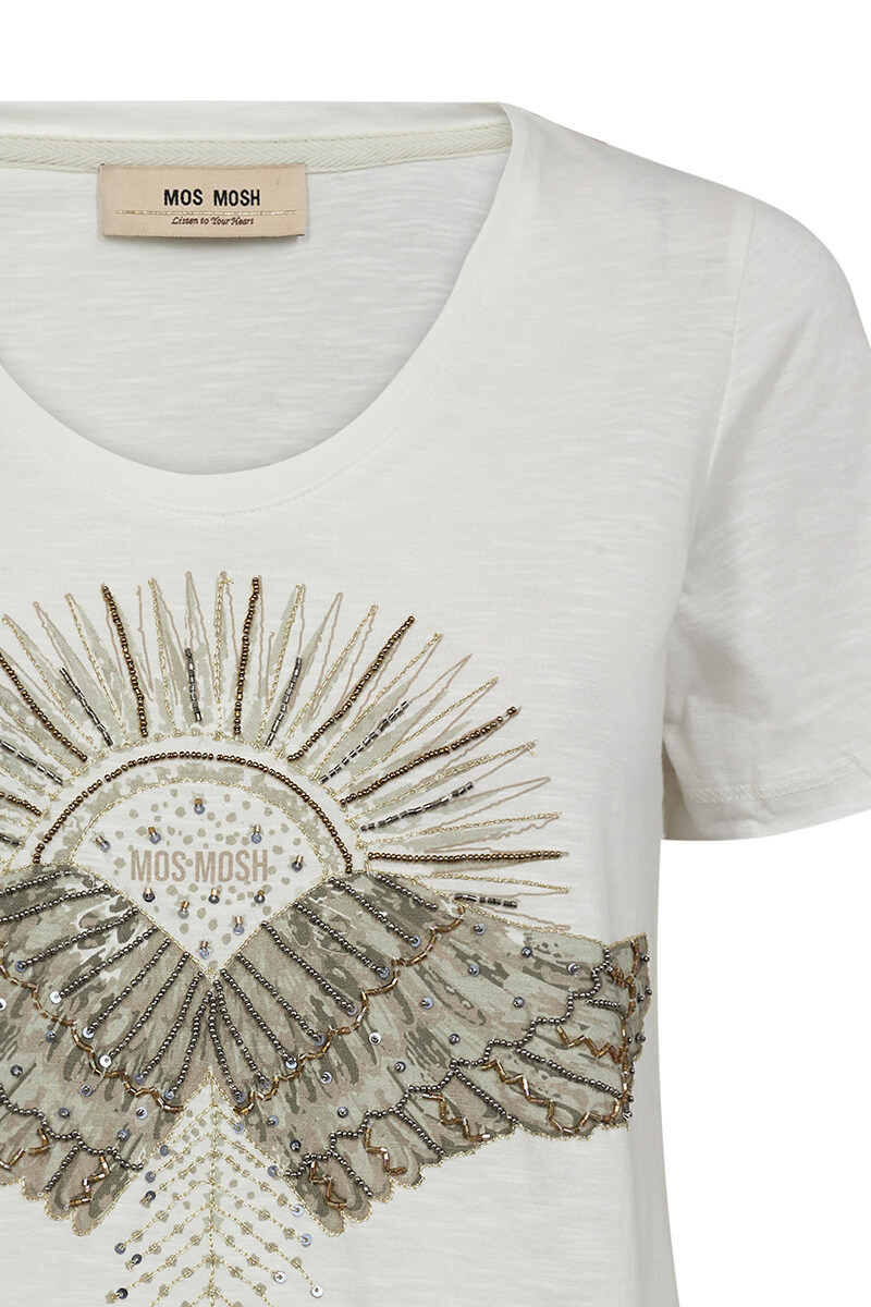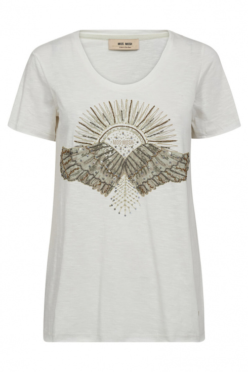 En statement-tee som gör jobbet. Perfekt rundad hals, lagom avslappnad passform och ett print med dekorativa pärlor adderar det lilla extra. Styla med raka jeans eller en jeanskjol – redo på nolltid.T-shirt i bomull med rund halsringning, korta ärmar och broderat tryck fram med paljetter från MosMosh.
