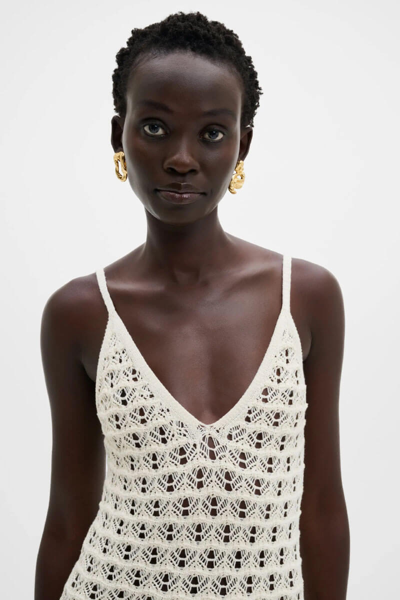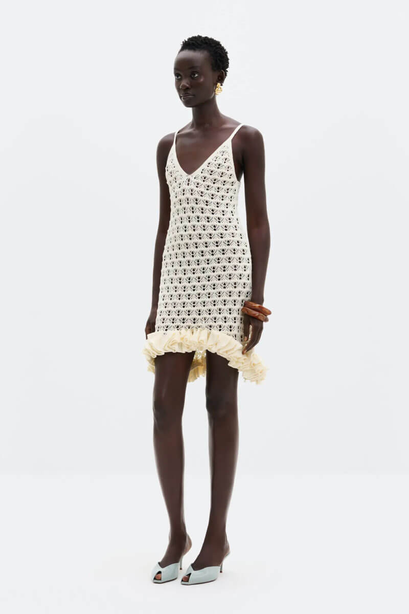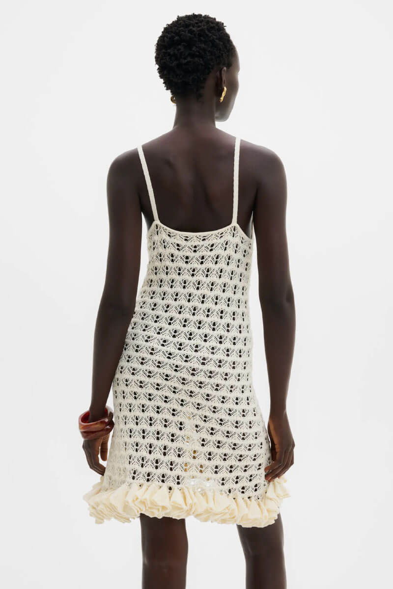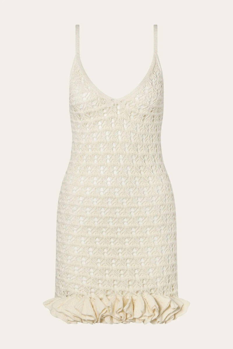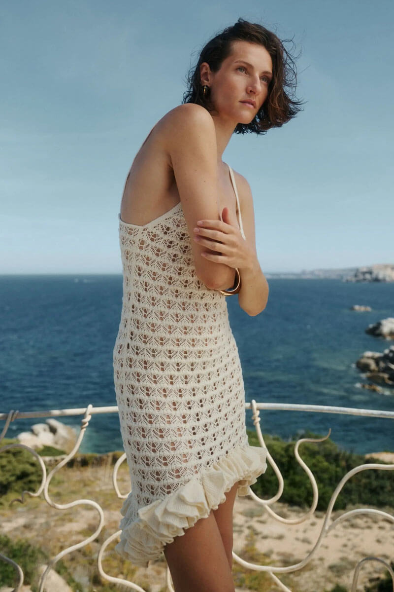 En romantisk stickad miniklänning som är perfekt inför sommaren. Den vackra pointellestickningen och den nätta volangkanten ger klänningen en feminin karaktär som är enkel att styla. Bär den med bikini och sandaler för en avslappnad dag eller klä upp den med klackar för sommarens fester.