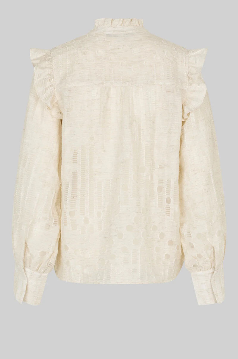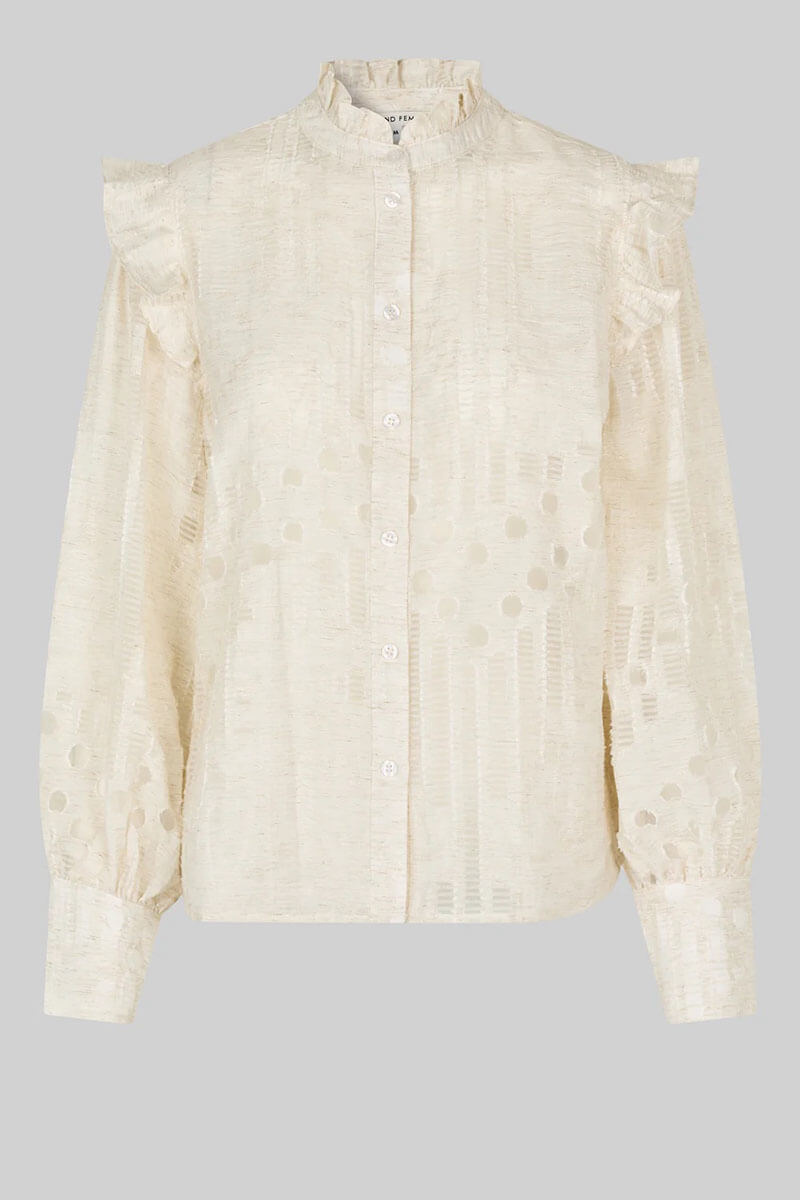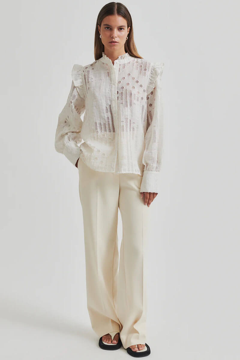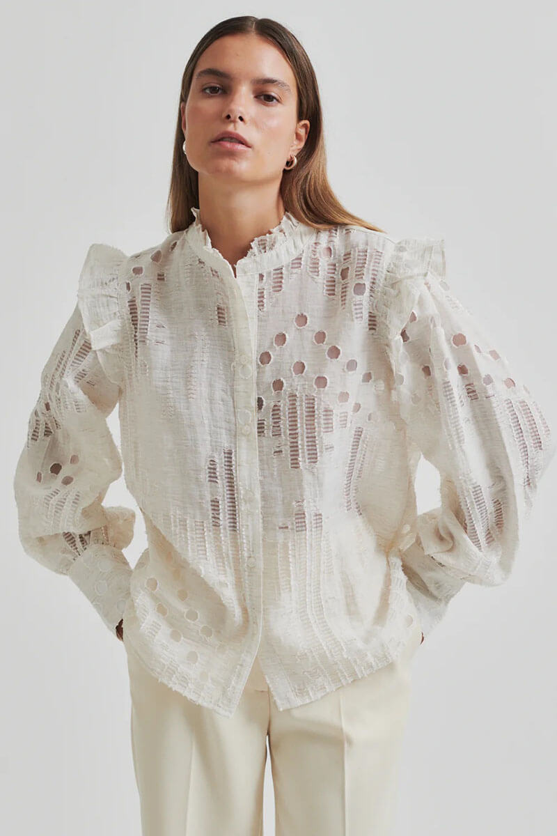 Luftig men skarp, romantisk men modern – den här blusen är precis vad garderoben saknar. Skira broderier och lekfulla volanger gör den lika självklar till denim som till kostymbyxor. En go-to favorit för dagar som kräver effortless elegans.Blus i en viskos/linneblandning med volangdetaljer, stängs med knappar fram, långa ärmar, ledig passform och något transparent från Second Female.