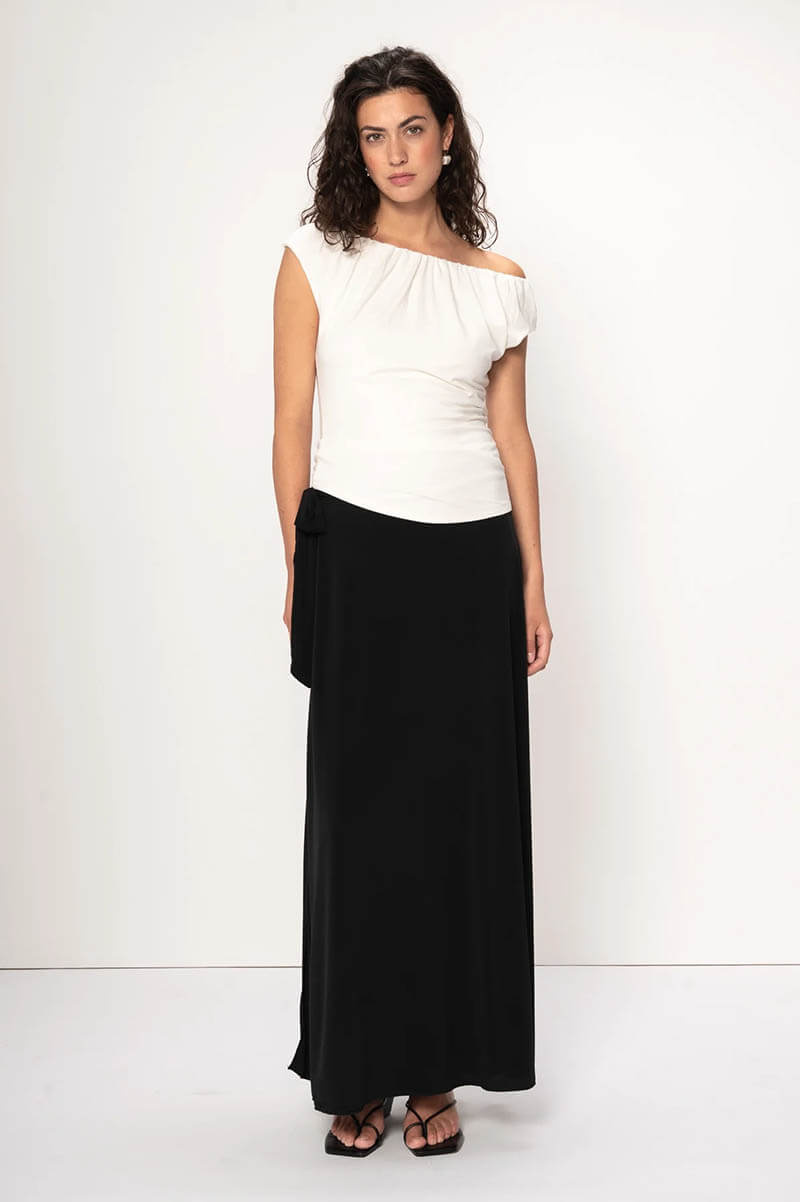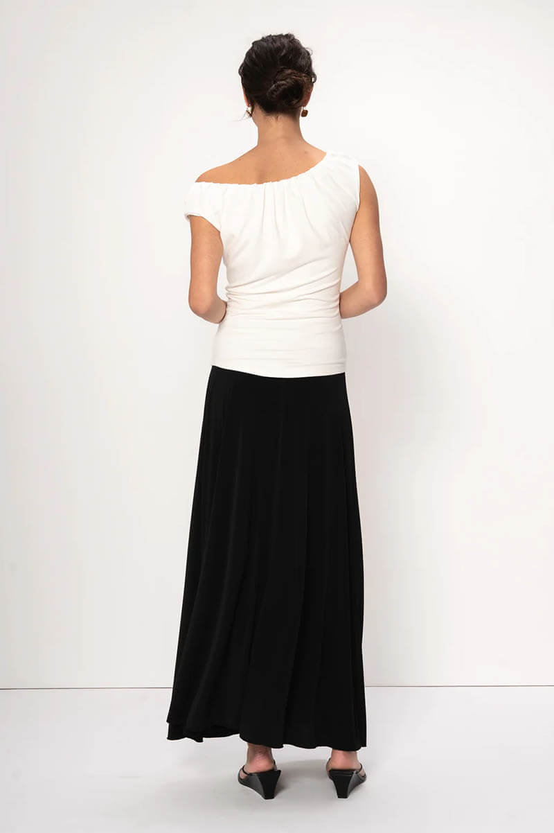 En ärmlös topp med bred, mjukt rynkad halsringning, tillverkad i VIVEH:s signaturmaterial ECOVERO™ viskosjersey. Halsringningen kan bäras rakt över axlarna eller stylas asymmetriskt. Designad som ett enkelt och stilrent plagg för en upphöjd vardagslook eller en elegant kvällsstil.