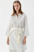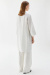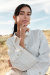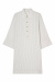 En vit linnéklänning med svarta ränder som kombinerar stil med lätthet. De vida ärmarna ger en avslappnad känsla, medan de gyllene knapparna adderar en elegant detalj. Perfekt för soliga dagar i stan eller långa luncher vid havet.Klänning i linne med lös passform, A-form, korta vida ärmar, stängs med guldknappar fram och klassisk krage från Busnel.