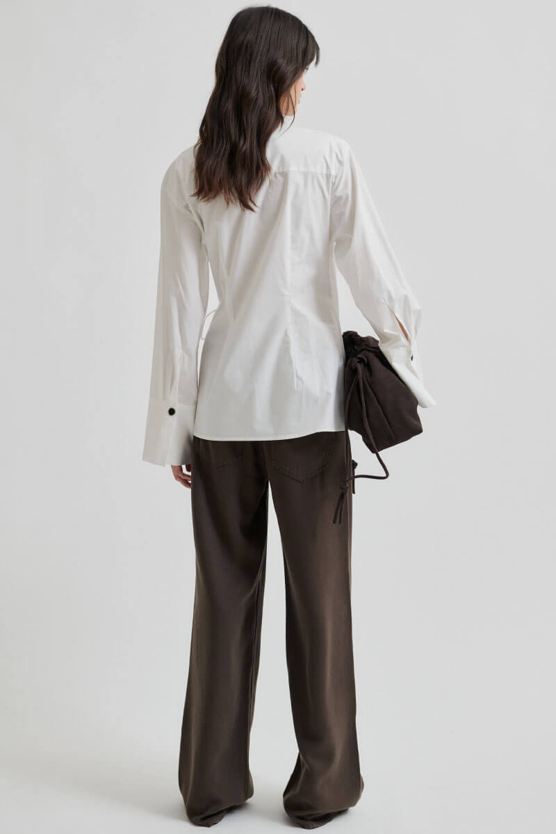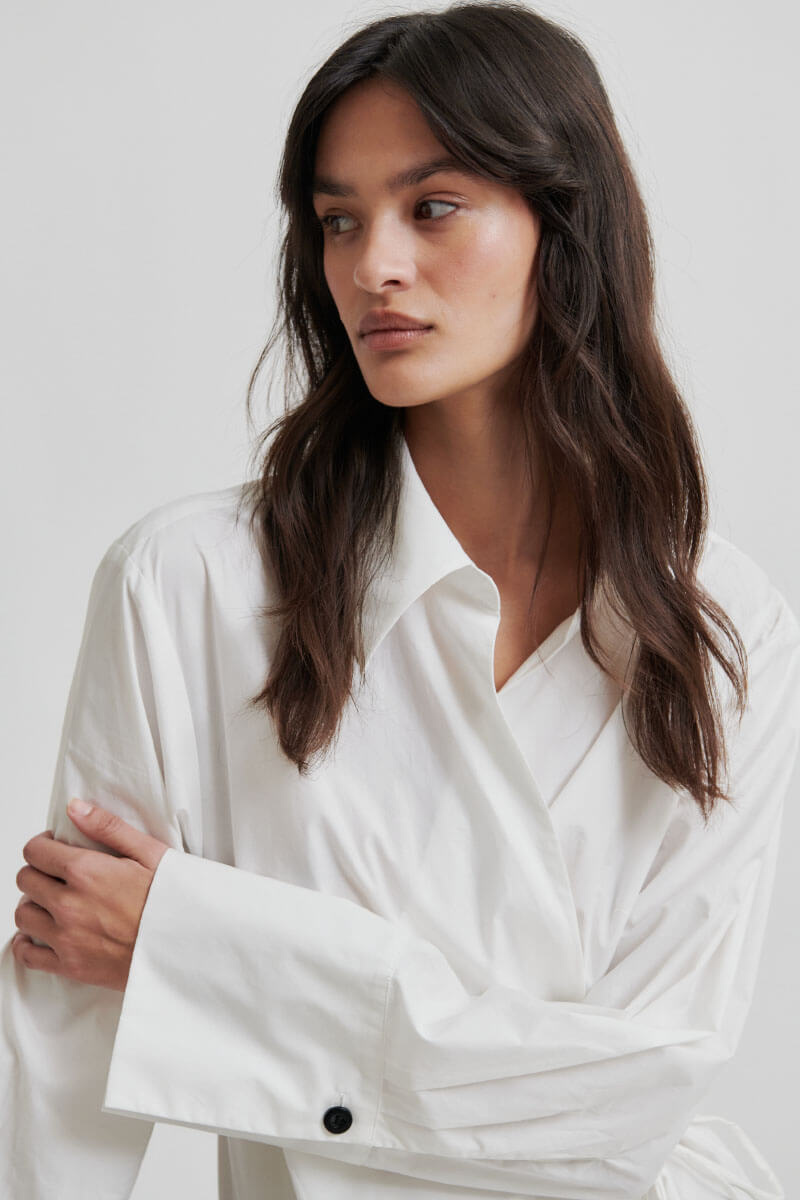 Vit krispig skjorta med wrap-design och klassisk krage. Perfekt med raka jeans för en modern vardagslook, eller med skräddade byxor och statementörhängen för en stilren, medveten kvällsoutfit.Skjorta i krispig ekologisk bomull med knyt i sidan, krage, ledig passform och manchetter från Second Female.