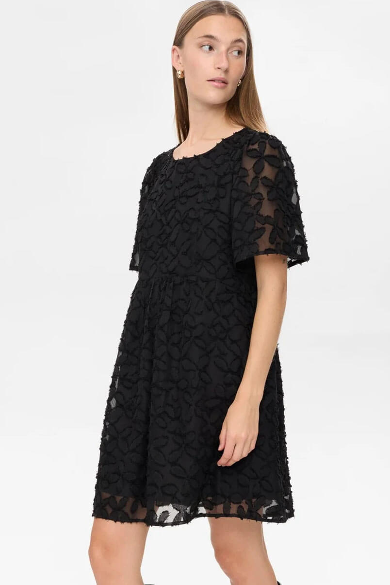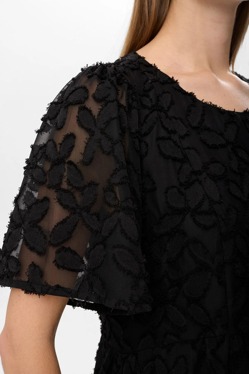 Det vackra, lätt transparenta övertyget ger en lyxig känsla och gör att den passar lika bra till fest som till middagen ute. Passformen är normal och modellen är lätt utställd över stussen – smickrande och bekväm för många figurer.