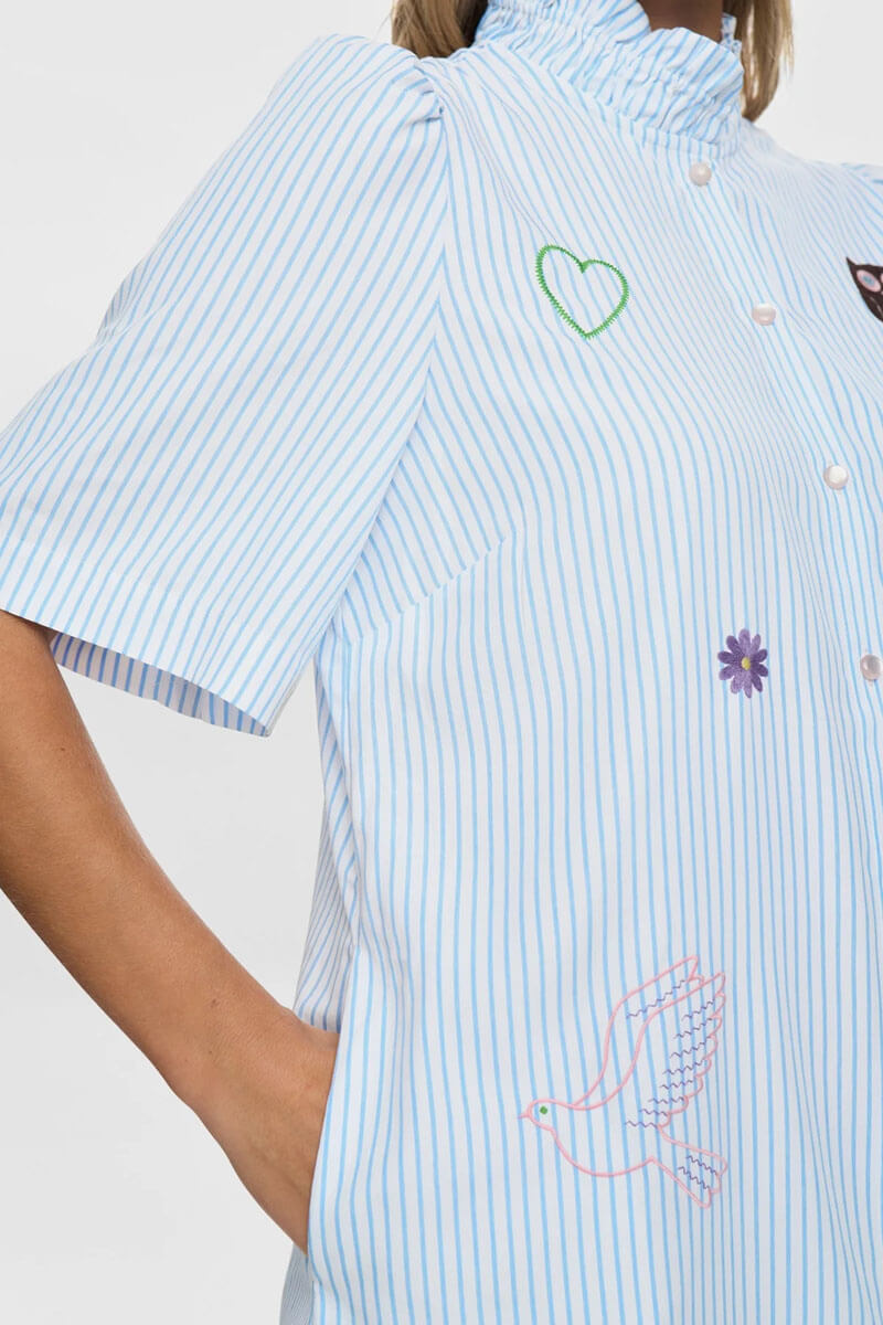 Klänningen har vackra broderidetaljer och en elegant liten ståkrage som ger ett sofistikerat uttryck. Det randiga tyget skapar en fräsch och luftig känsla och perfekt för både vår- och sommarsäsongen.