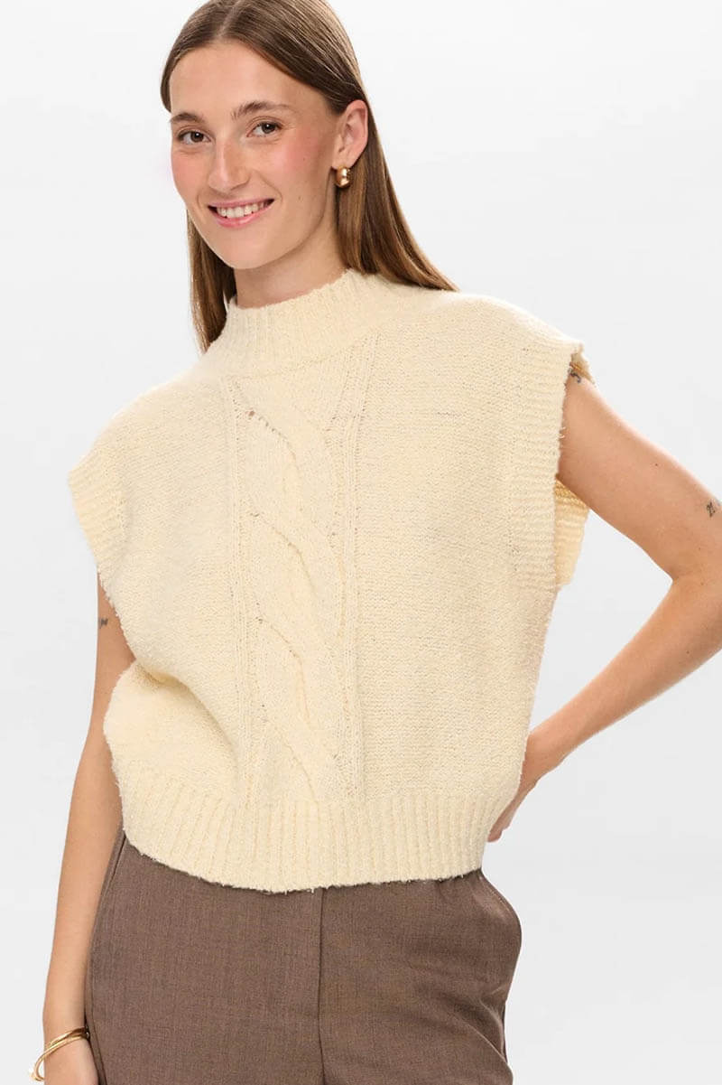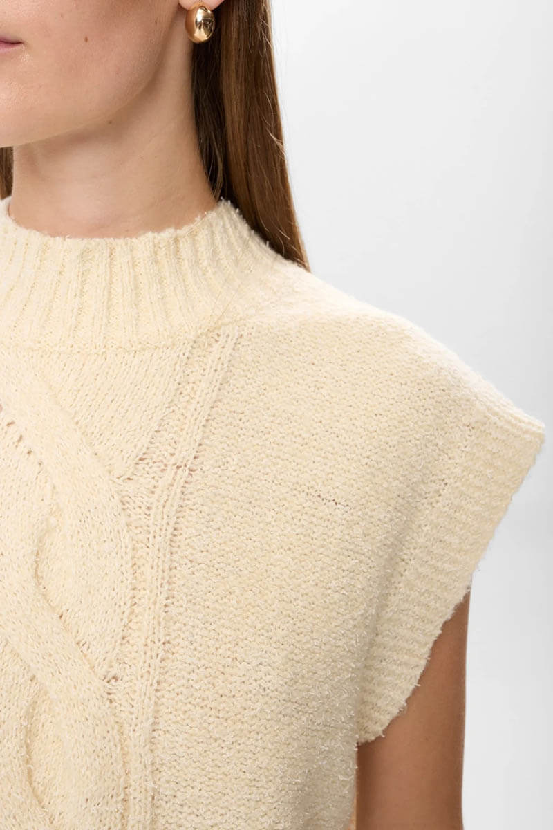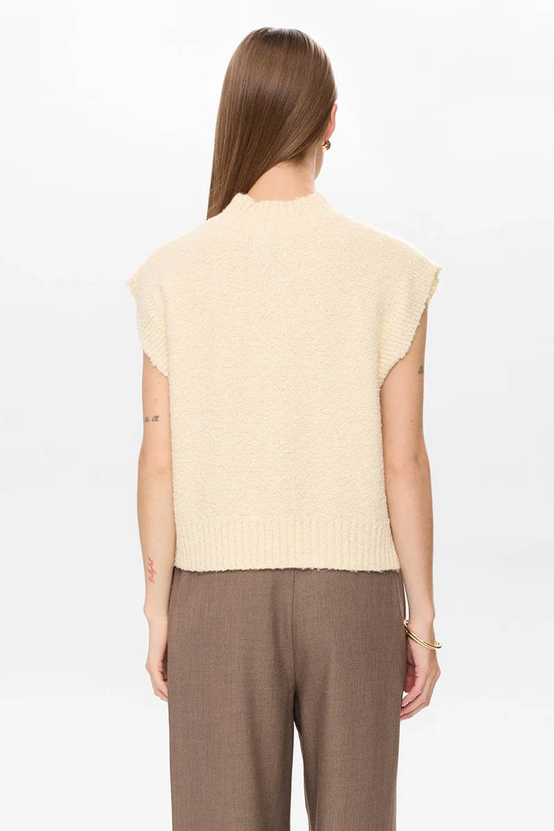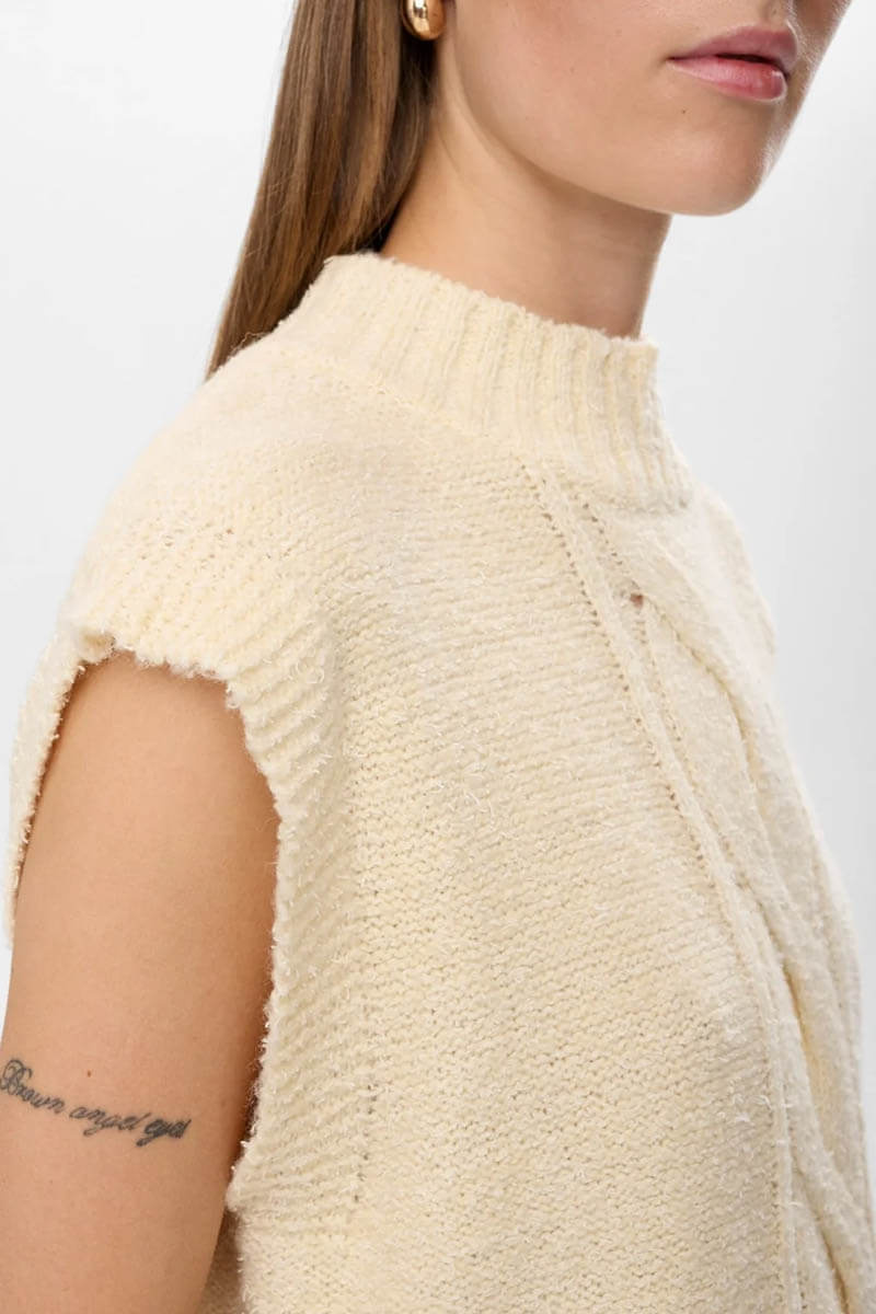 Stickad väst i beige med hög krage och ribbade avslut som ger en modern, stilren silhuett. Ett mångsidigt plagg som passar lika bra till kjol som till jeans.