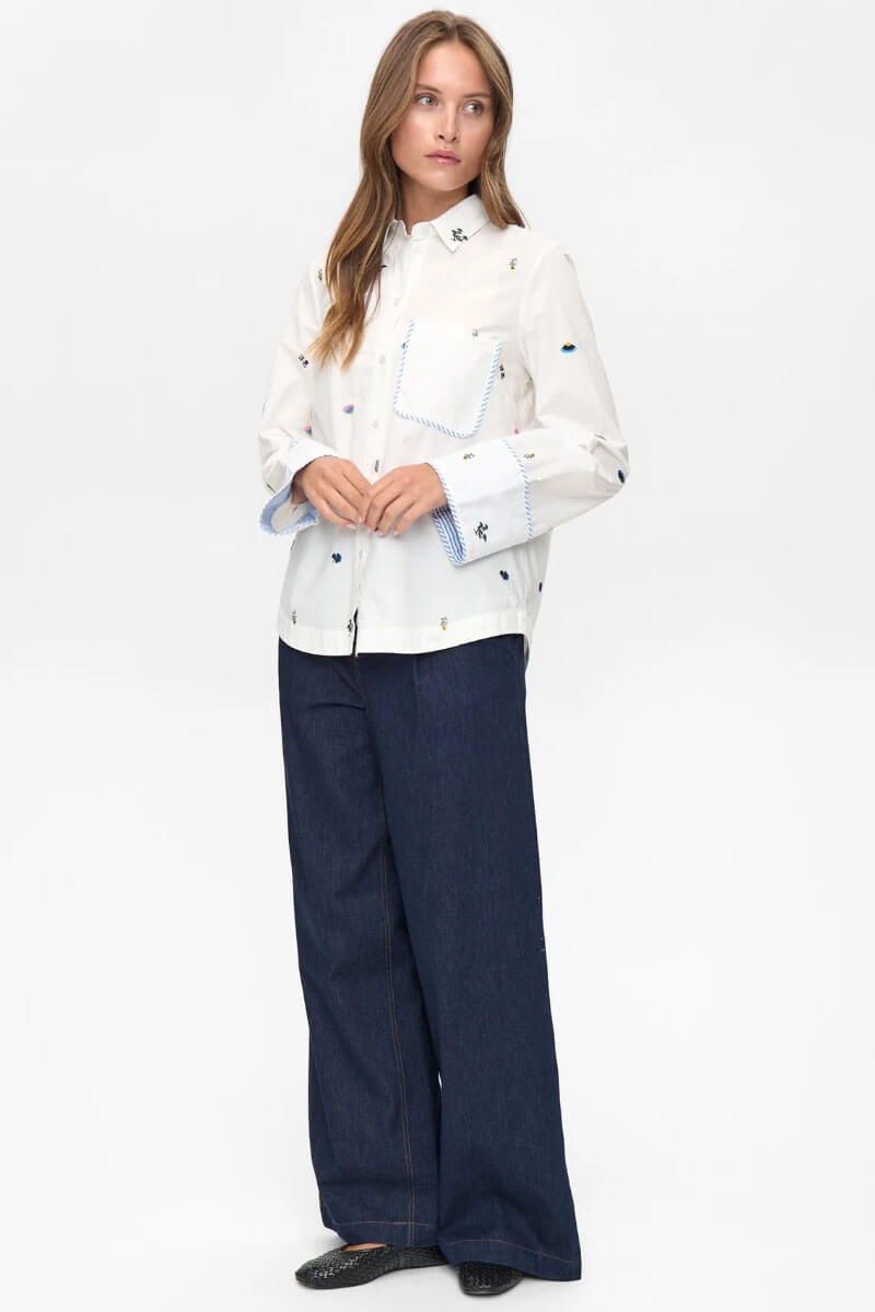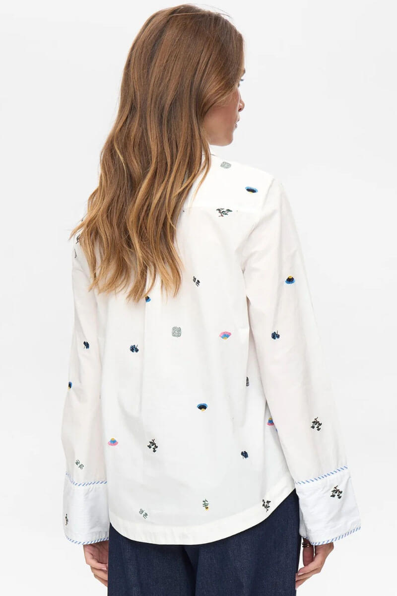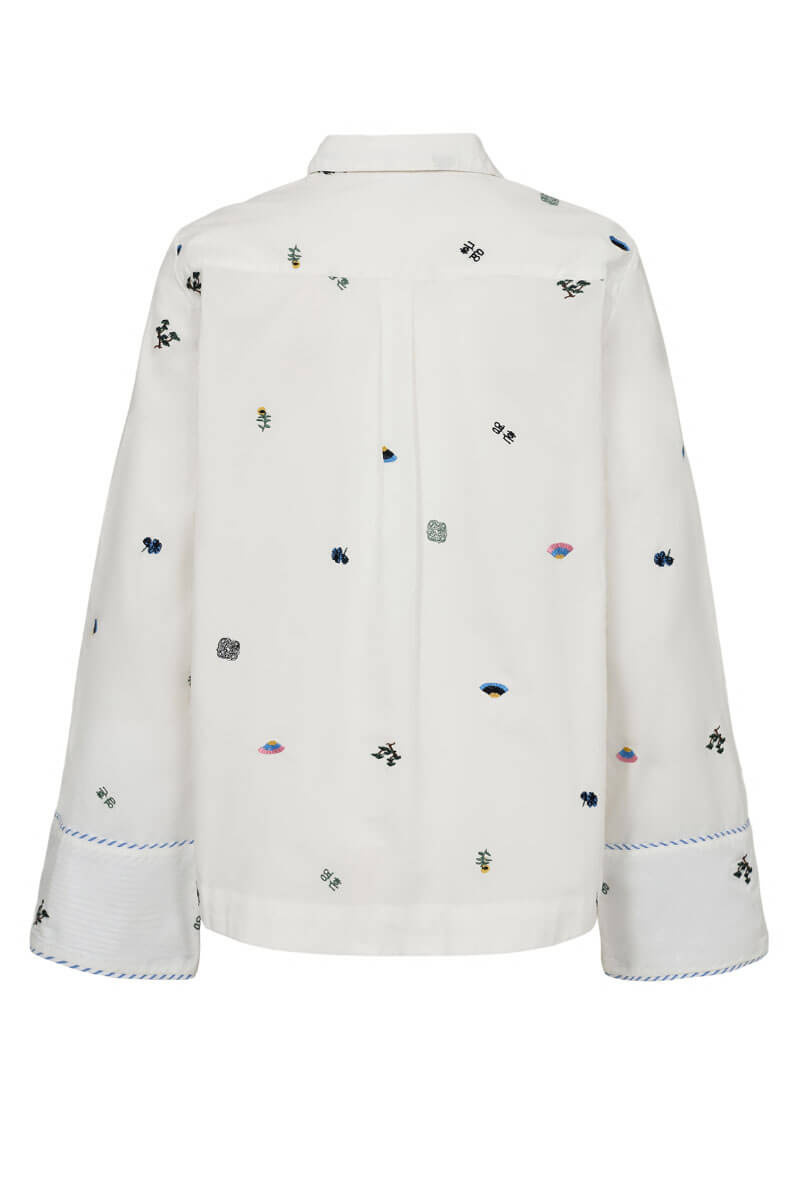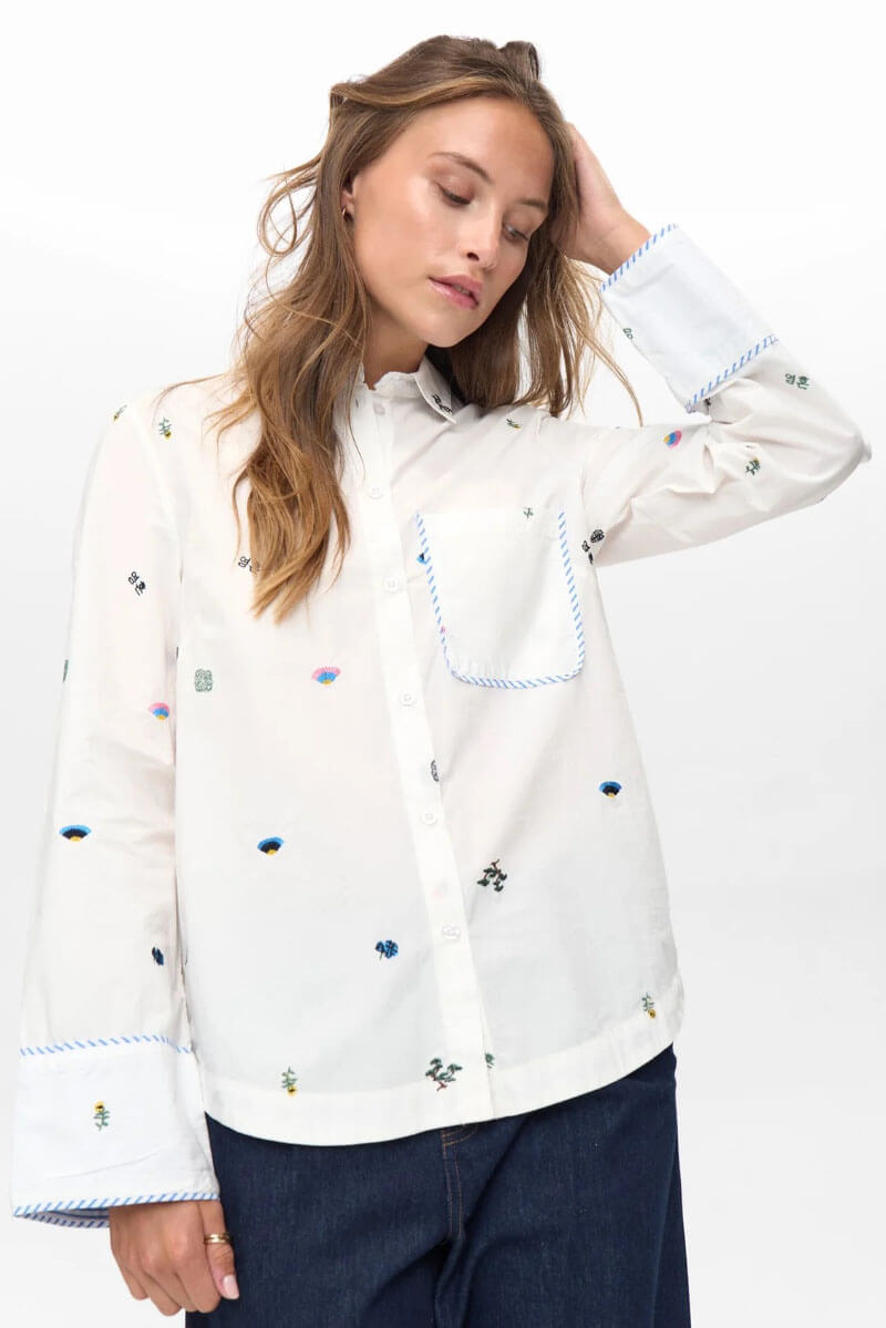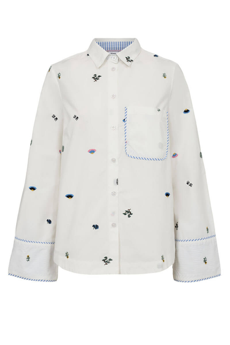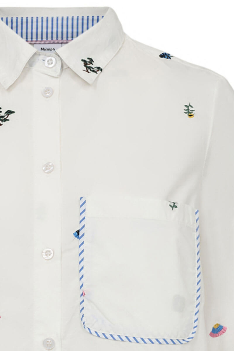 Denna vita skjorta med lekfulla broderier och avslappnad passform är en ny favorit i garderoben. Bär den löst över denim för en cool balans!Skjorta i krispig bomull med broderat mönster, boxig passform, bröstficka, stängs med knappar fram och kontrastfärgade kanter från Nümph.