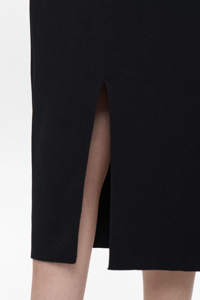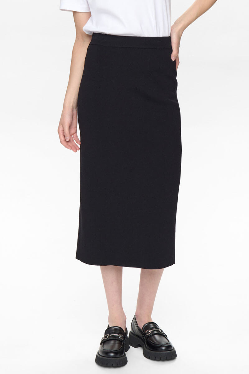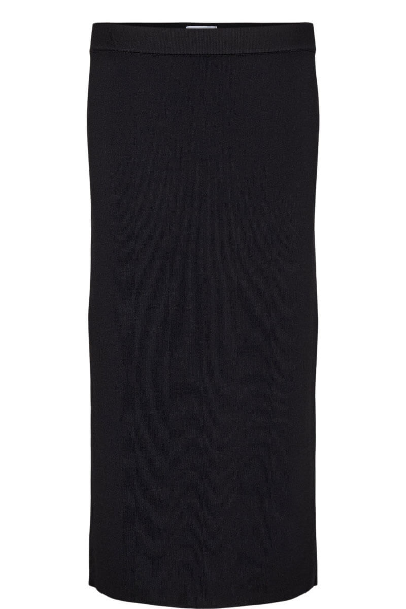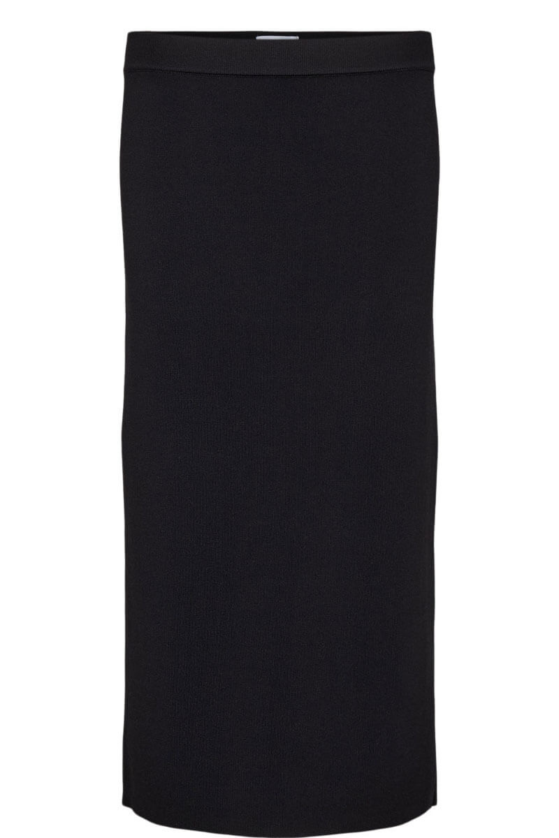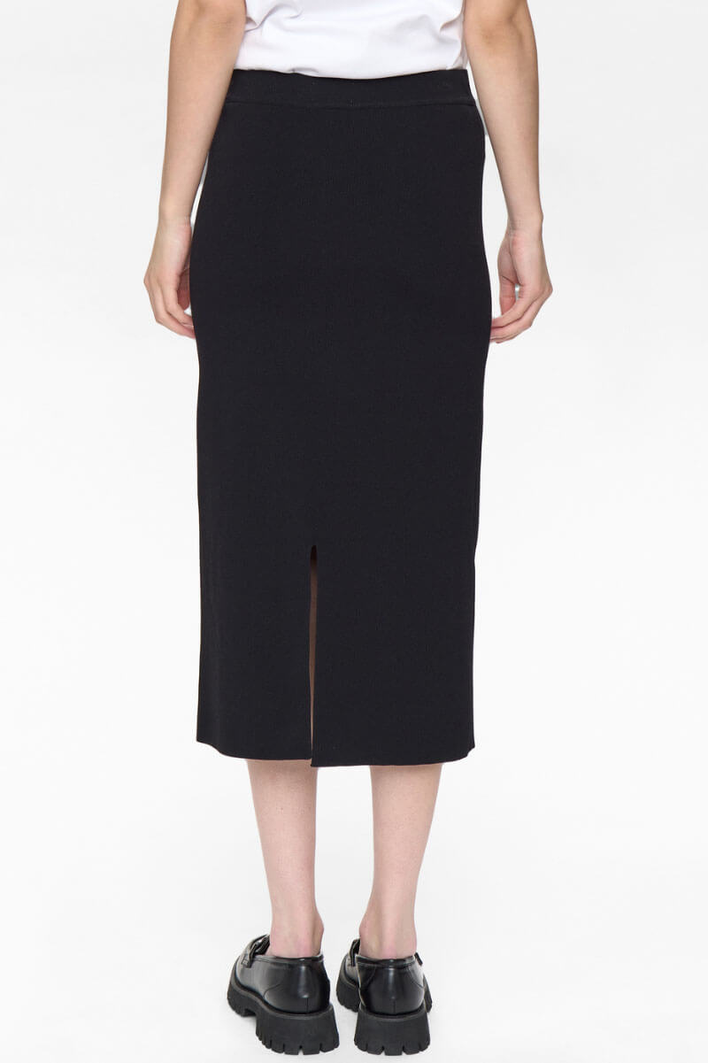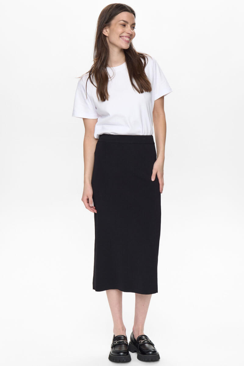 En stilren och mångsidig stickad kjol i midilängd med rak silhuett. Kjolen är tillverkad i ett stretchigt, mjukt material som ger både komfort och en smickrande passform. Perfekt att bära till både stickade toppar, blusar och kavaj för en elegant vardags- eller kontorslook.Stickad midikjol med rak passform i stretchigt materia med slits bak från Nümph.