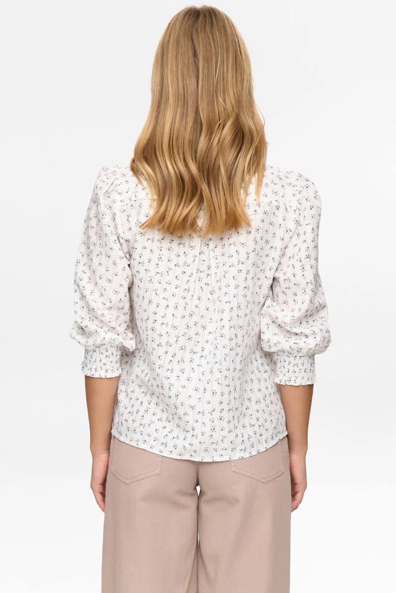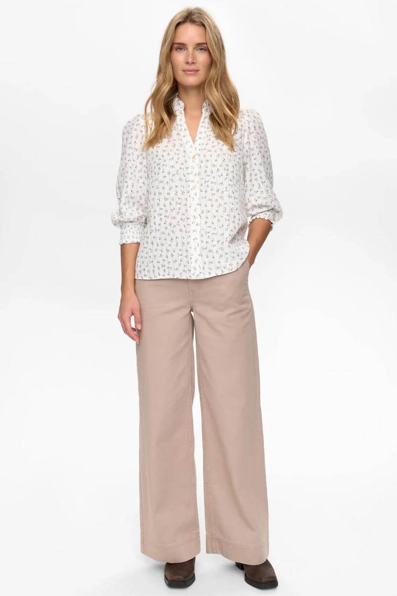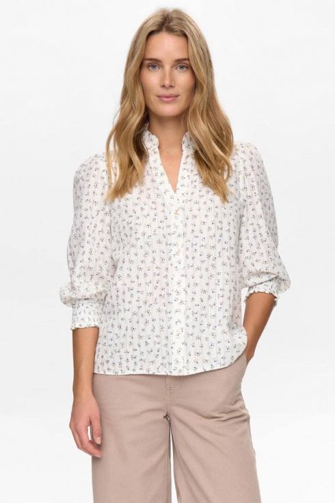 En lätt och feminin topp med småmönstrat tyg. Den lediga silhuetten och de diskreta detaljerna gör den enkel att bära till både vardag och mer uppklädda tillfällen. Styla med kostymbyxor eller jeans för en avslappnad look, eller stoppa ner den i en kjol för ett mer elegant uttryck.
