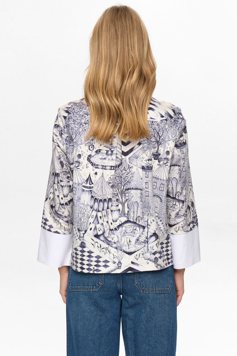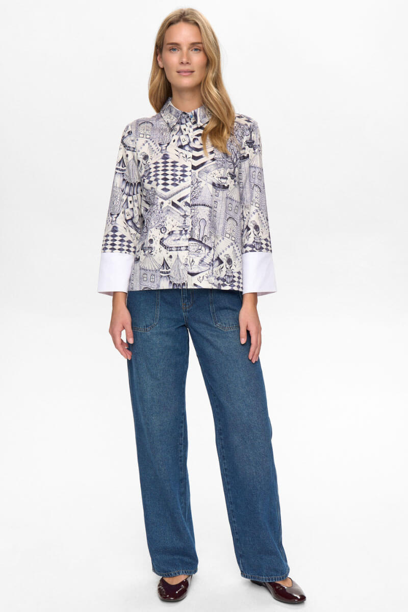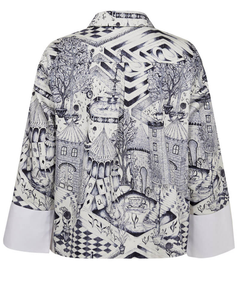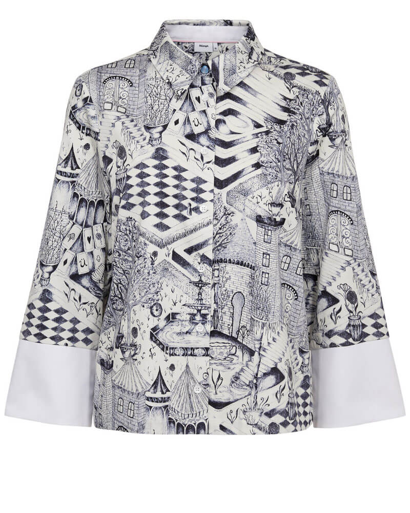 En mönstrad skjorta som verkligen gör looken. Skjortan har ett detaljrikt, illustrativt print som ger ett personligt och lekfullt uttryck. Bär den till enkla byxor eller jeans för att låta mönstret stå i fokus, eller kombinera med kjol för en kvällsoutfit.