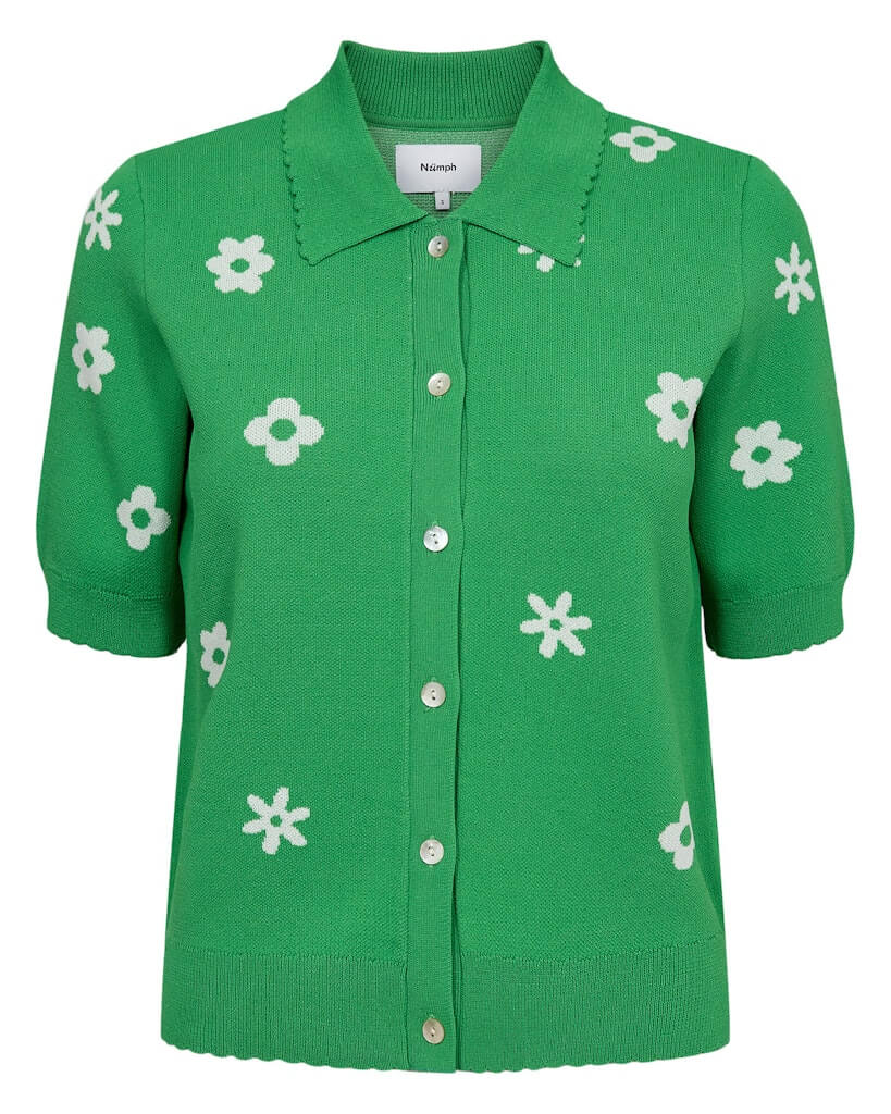 En stickad kofta i klargrön nyans med vita blommor som ger ett tydligt men stilrent uttryck. Modellen har krage och en mjuk, följsam kvalitet som gör den lätt att bära både knäppt och öppen. Passar lika bra till jeans som till kjol eller över klänning.Stickad kofta med krage och blommönster från Nümph.