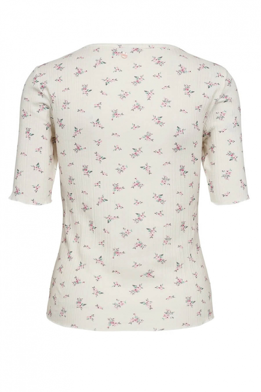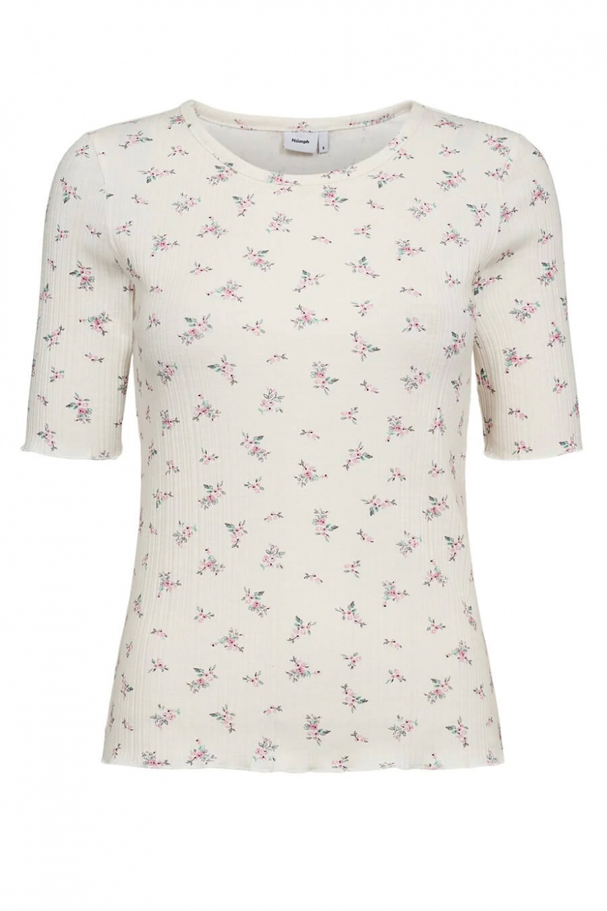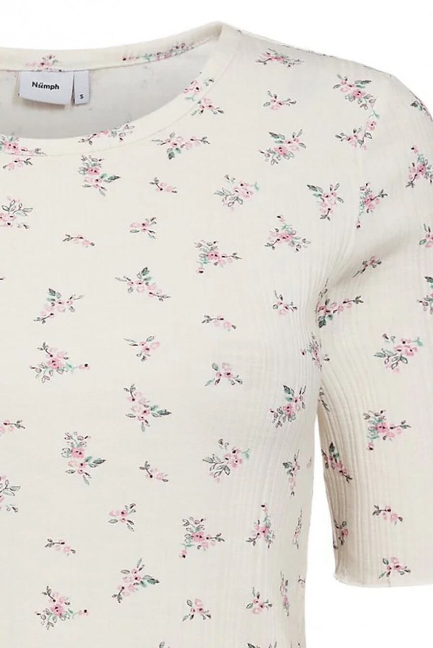 En ribbad t-shirt med blommigt mönster – en mjuk favorit med kroppsnära passform och kort ärm. Perfekt att bära till jeans för en avslappnad look eller under en kofta för en feminin twist. Ett enkelt val, varje dag.Ribbad t-shirt i blommigt mönster med rund halsringning, korta ärmar och smal passform från Nümph.