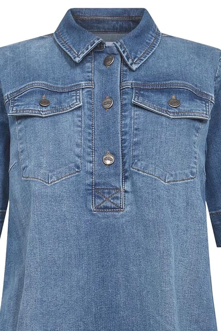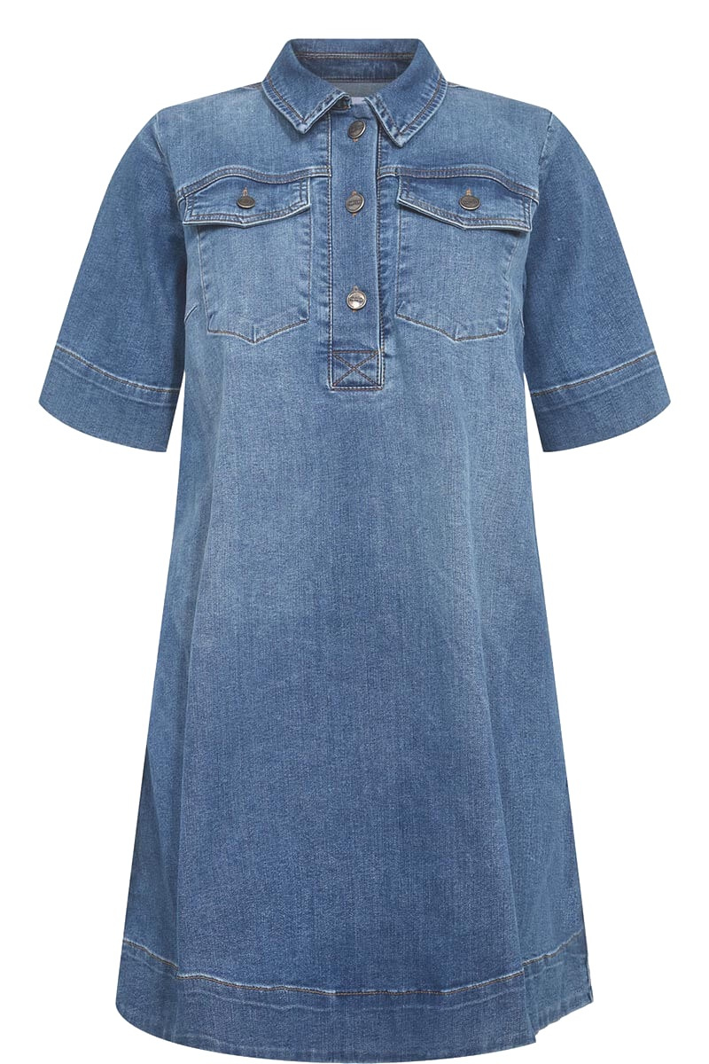 En jeansklänning att leva i – Tidlös men allt annat än tråkig. Bär med sneakers, sandaler eller boots. En denimdröm för dig som älskar enkel stil med edge.Jeansklänning i en stretchig bomullsblandning med krage, bröstfickor, stängs med knappar fram, fickor i sidan och A-form från Nümph.