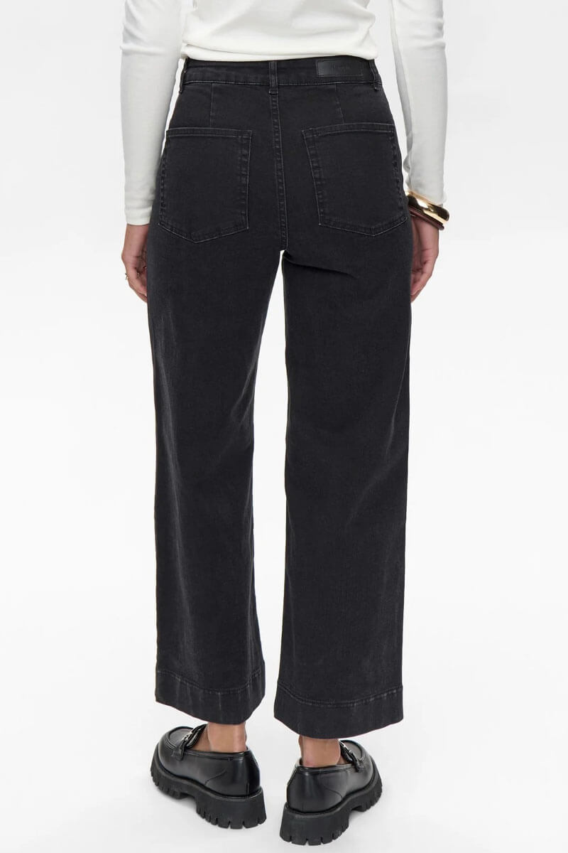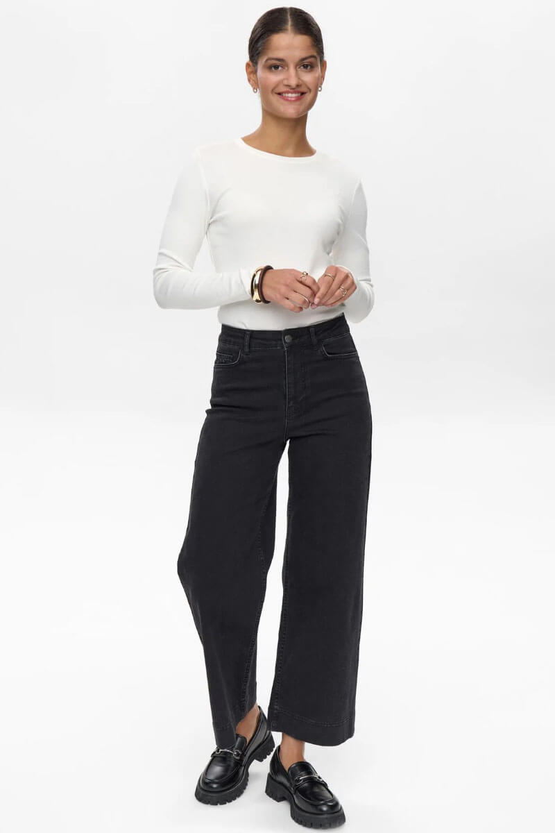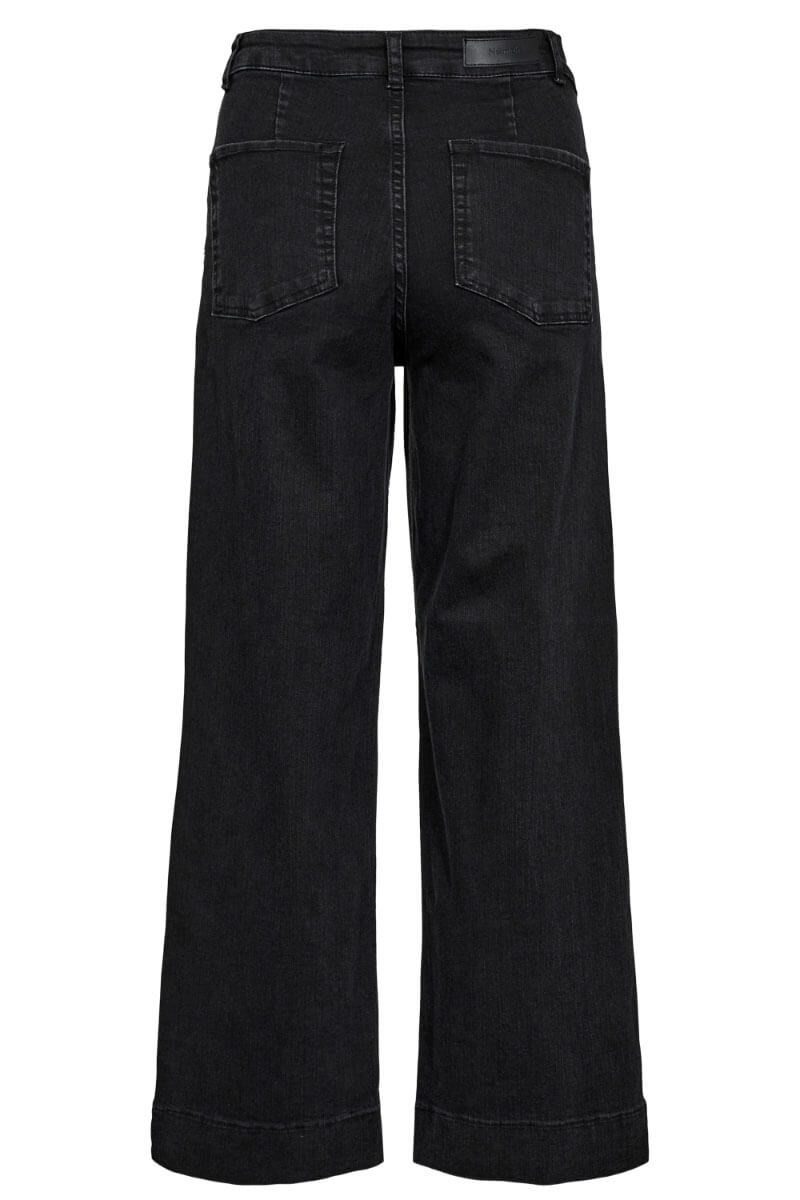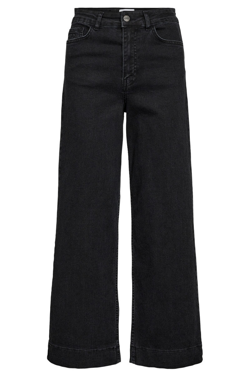 Svarta jeans i tidlös passform ger en elegant bas att bygga din look kring. Matcha med silkesblus och klackar för kvällens middagar, eller med stickad tröja och sneakers för en avslappnad men stilsäker vardag.Stretchiga jeans i en bomullsblandning med vida ben, hög midja och ankelkorta ben från Nümph.
