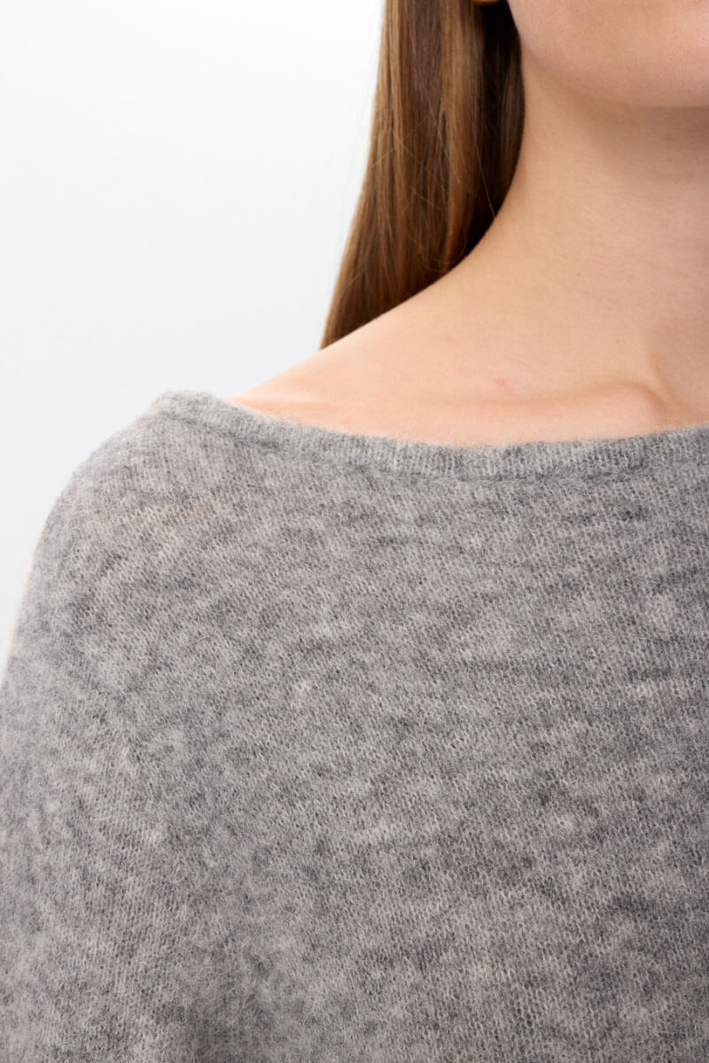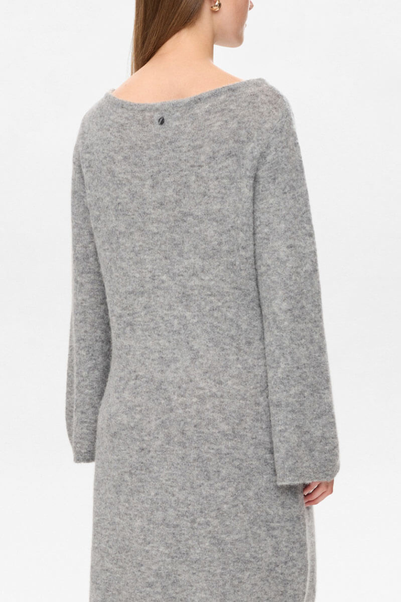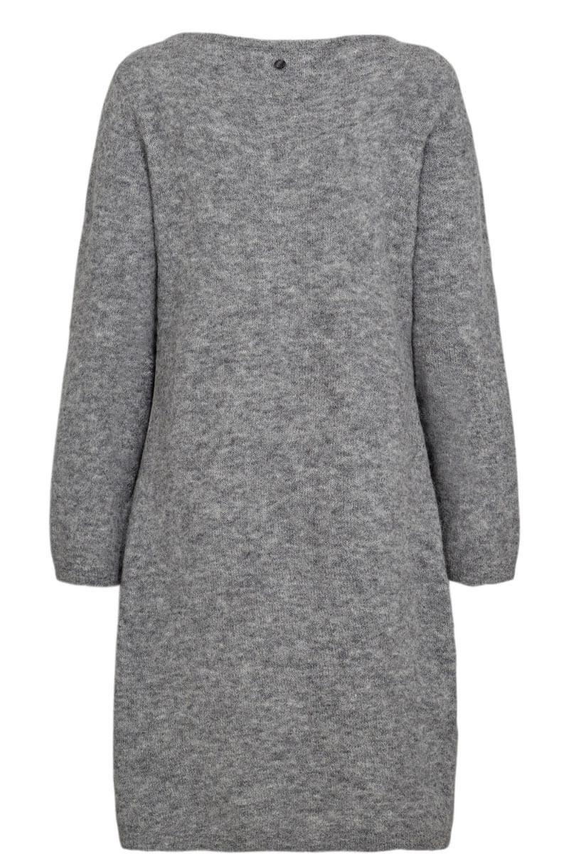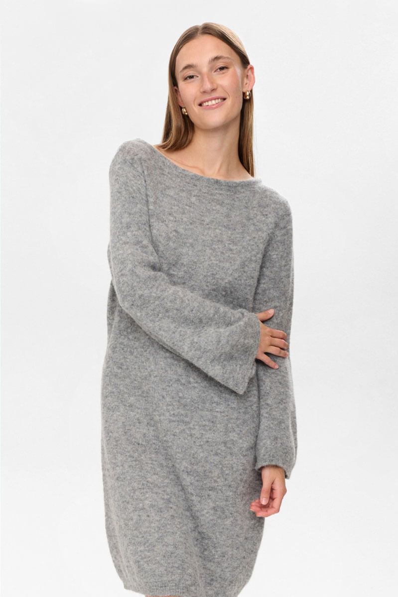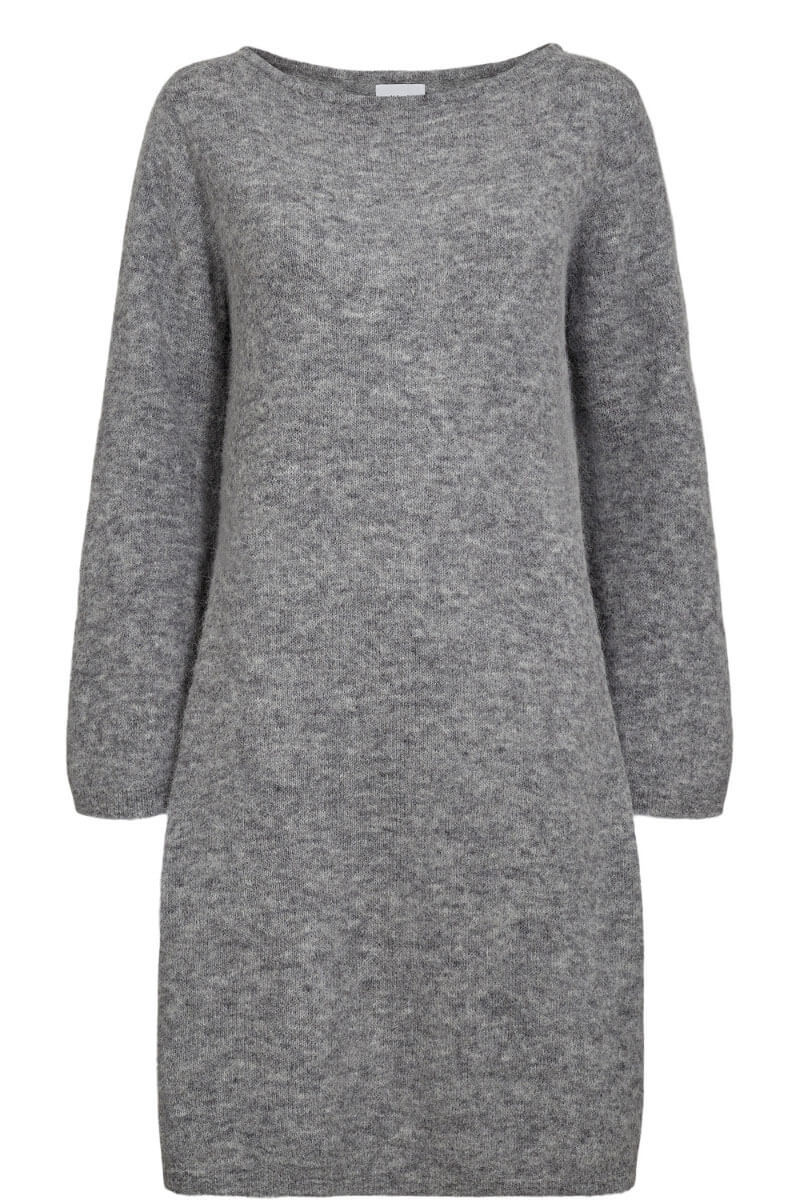 Stickad klänning som fungerar lika bra med boots och en oversized kavaj för vardagen som med klackar för festliga tillfällen. Båtringning och relaxed fit ger en modern, stilren silhuett.