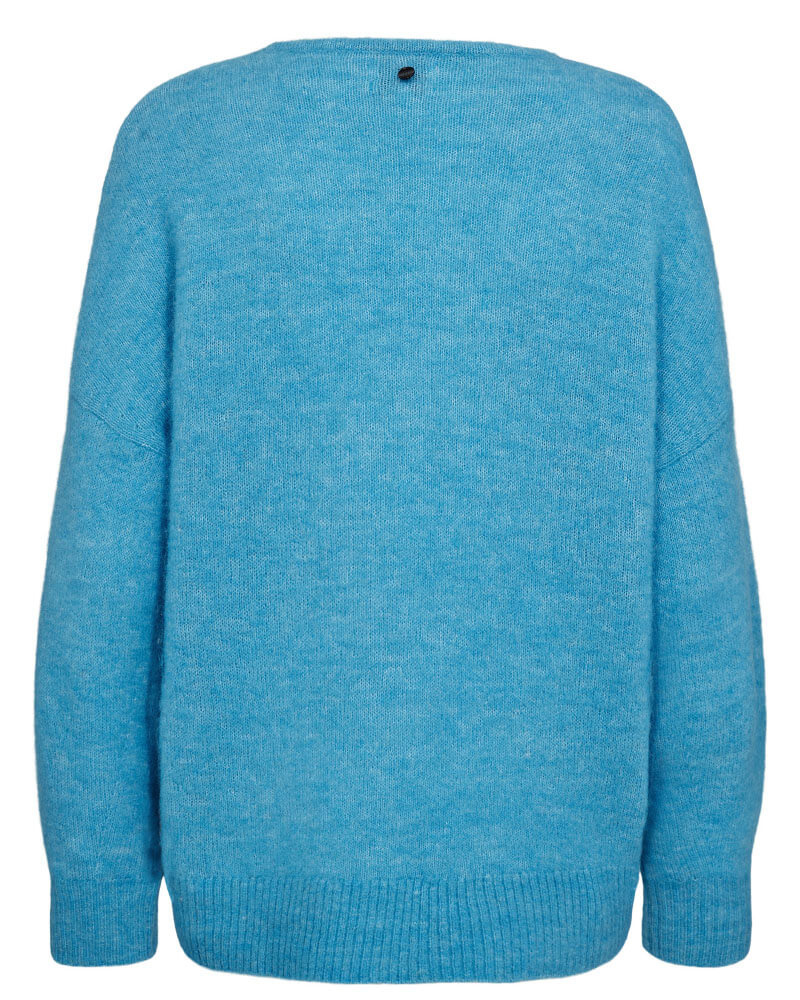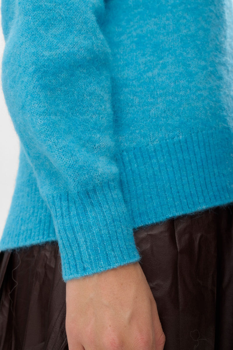 Stickad tröja i ljusblå med ribbstickade avslut och relaxed fit som ger en modern, stilren silhuett. Ett mångsidigt plagg som passar lika bra till jeans som till kjol.