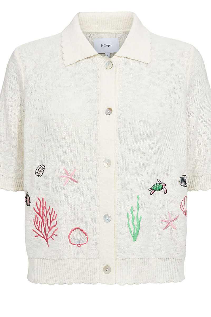 Denna fina kofta gör det lilla extra till dina jeans eller en kjol i sommar.Stickad kofta i mjuk bomullskvalité med broderade applikationer från danska Nümph.